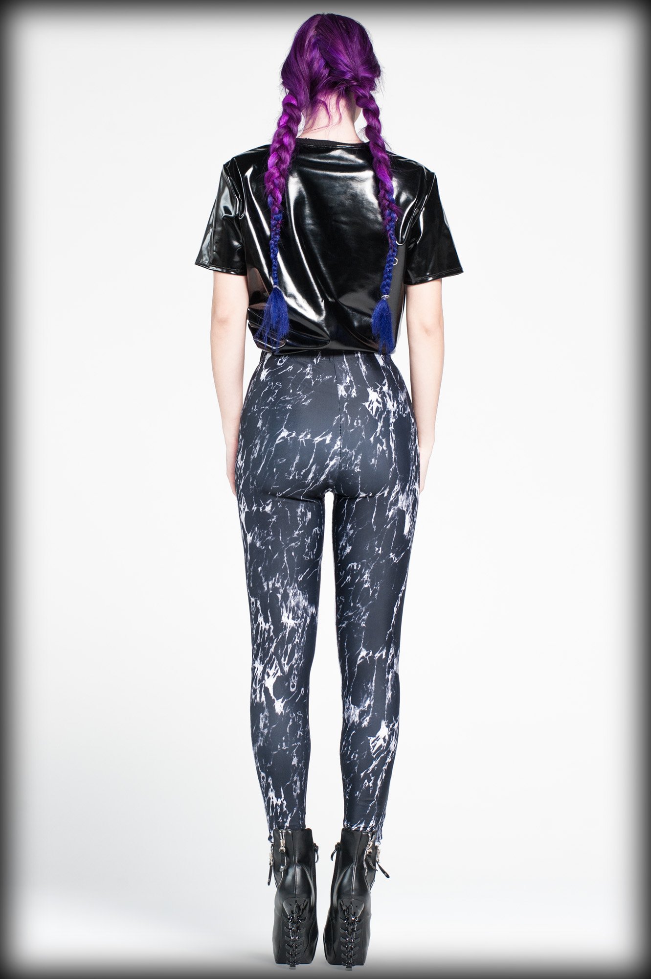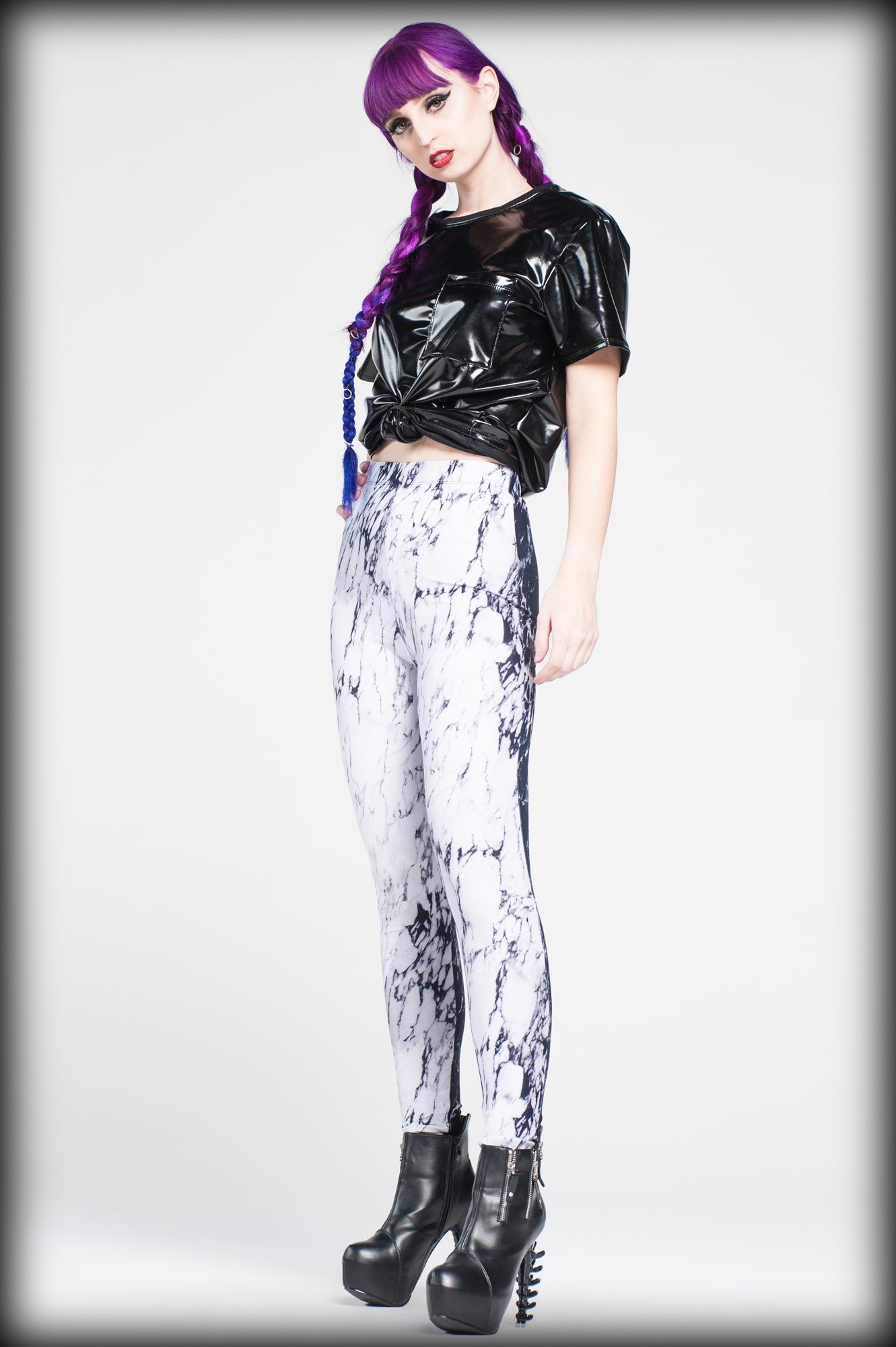 High waist colorblock leggings in black and white marble print spandex.