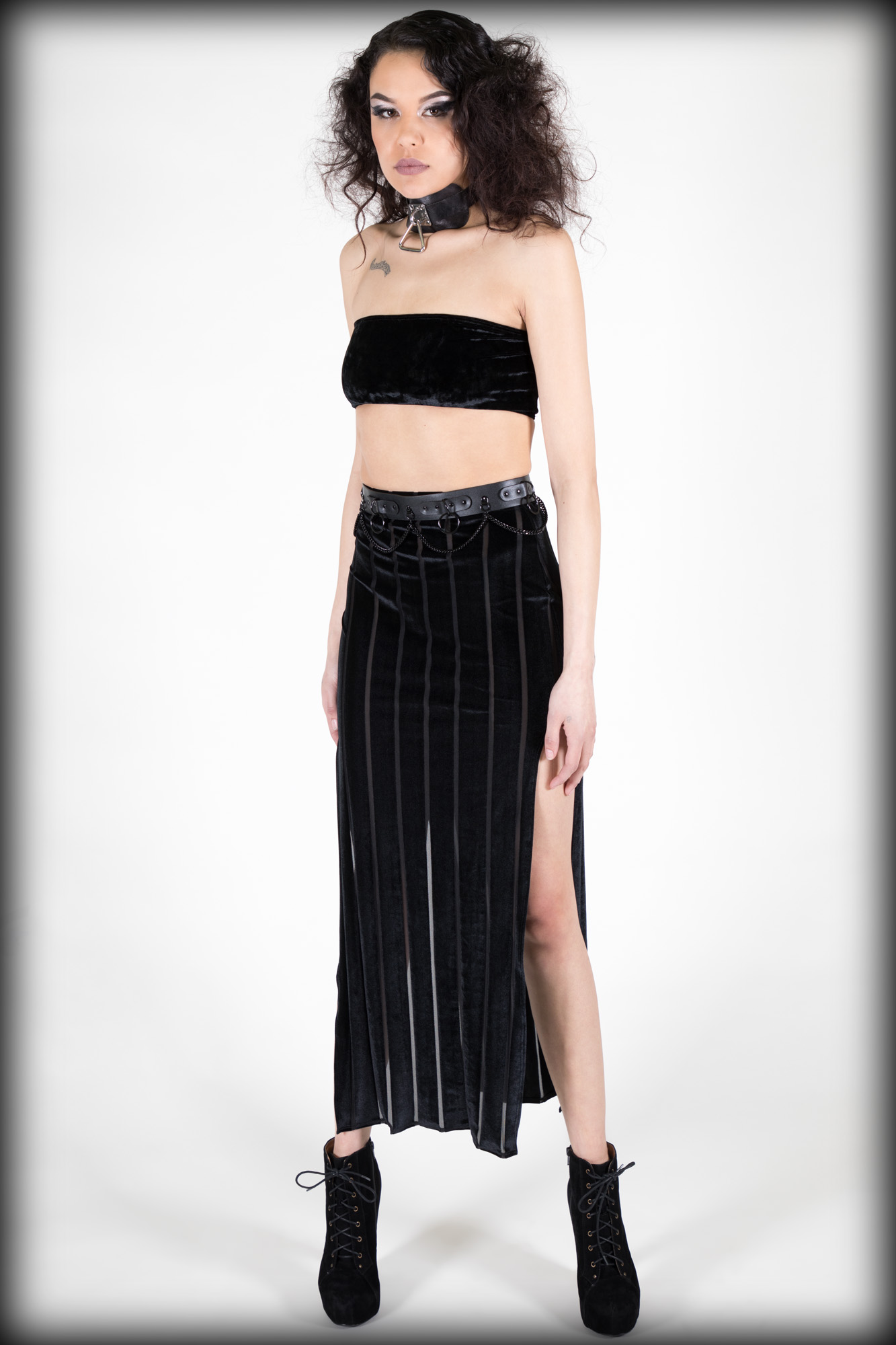 Striped velvet maxi skirt with side slits, high waist and sheer stripes.