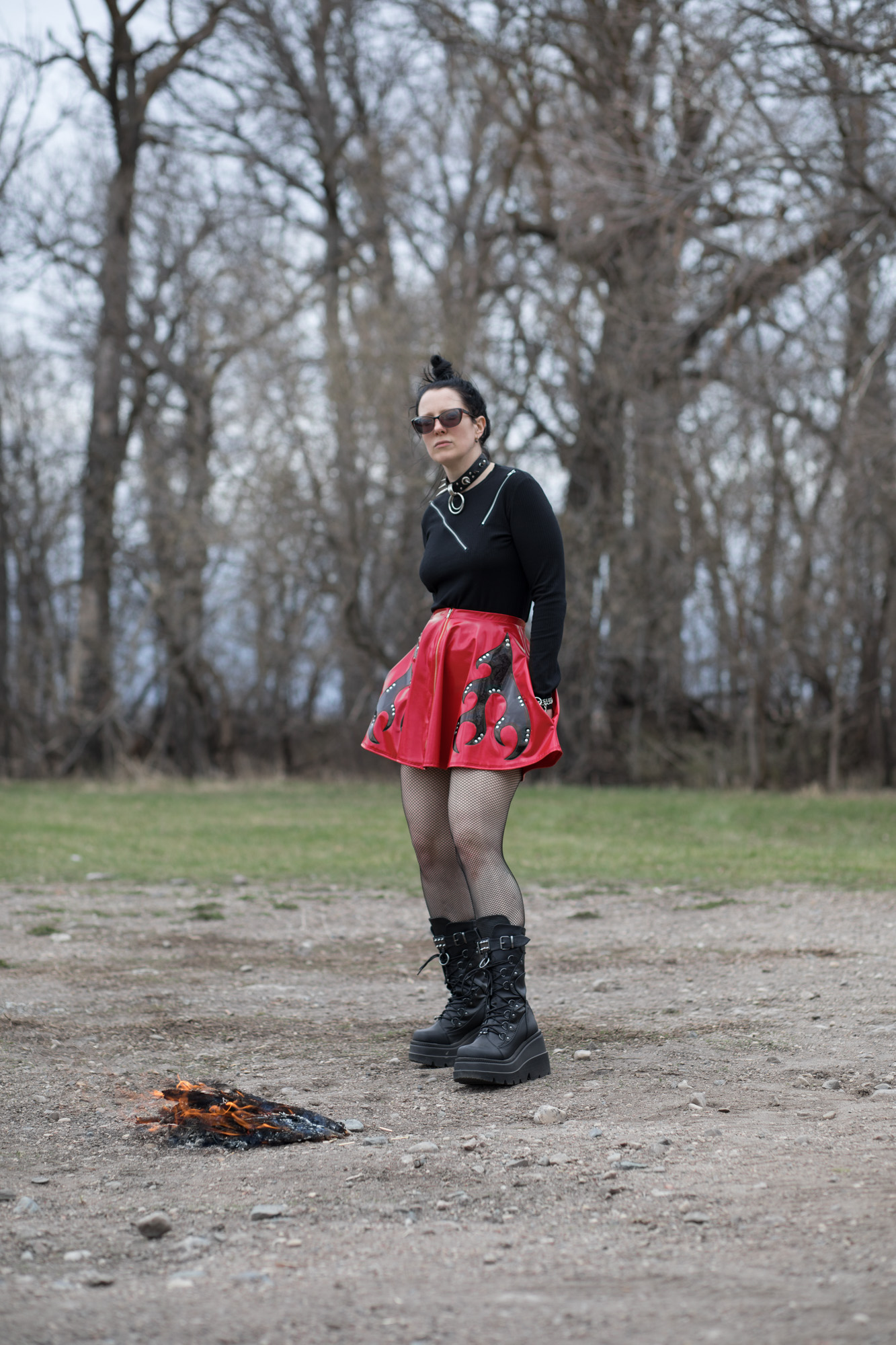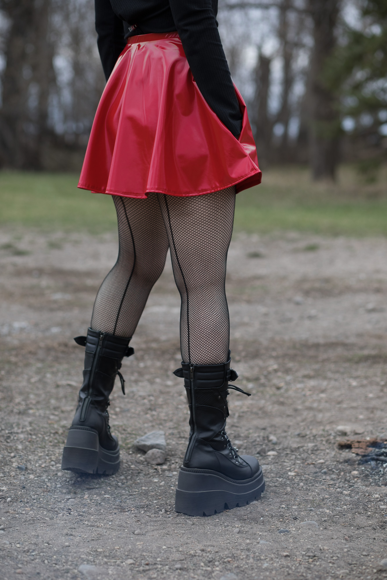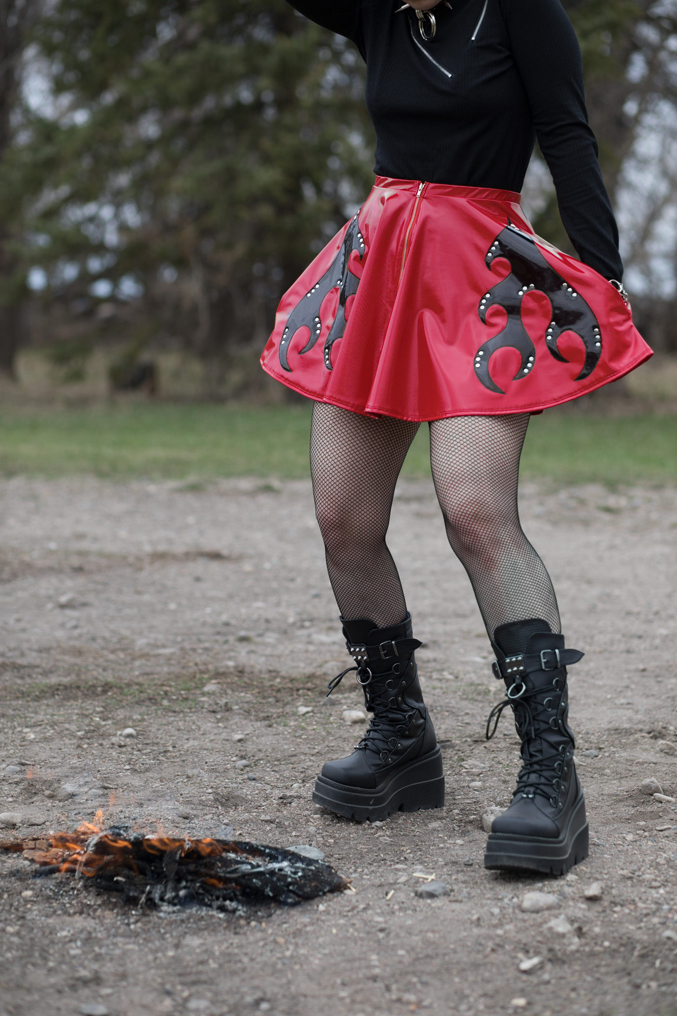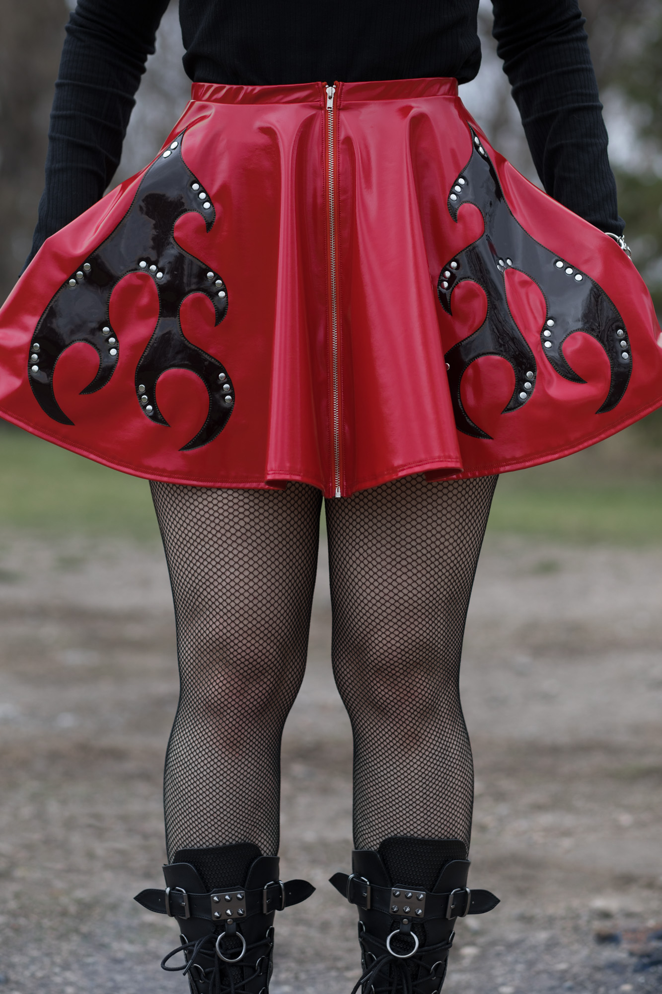 ONE OF A KIND shiny red PVC circle skirt with shiny black flames, shiny nickel rivets, and exposed center front zipper. The best part? It has POCKETS!
