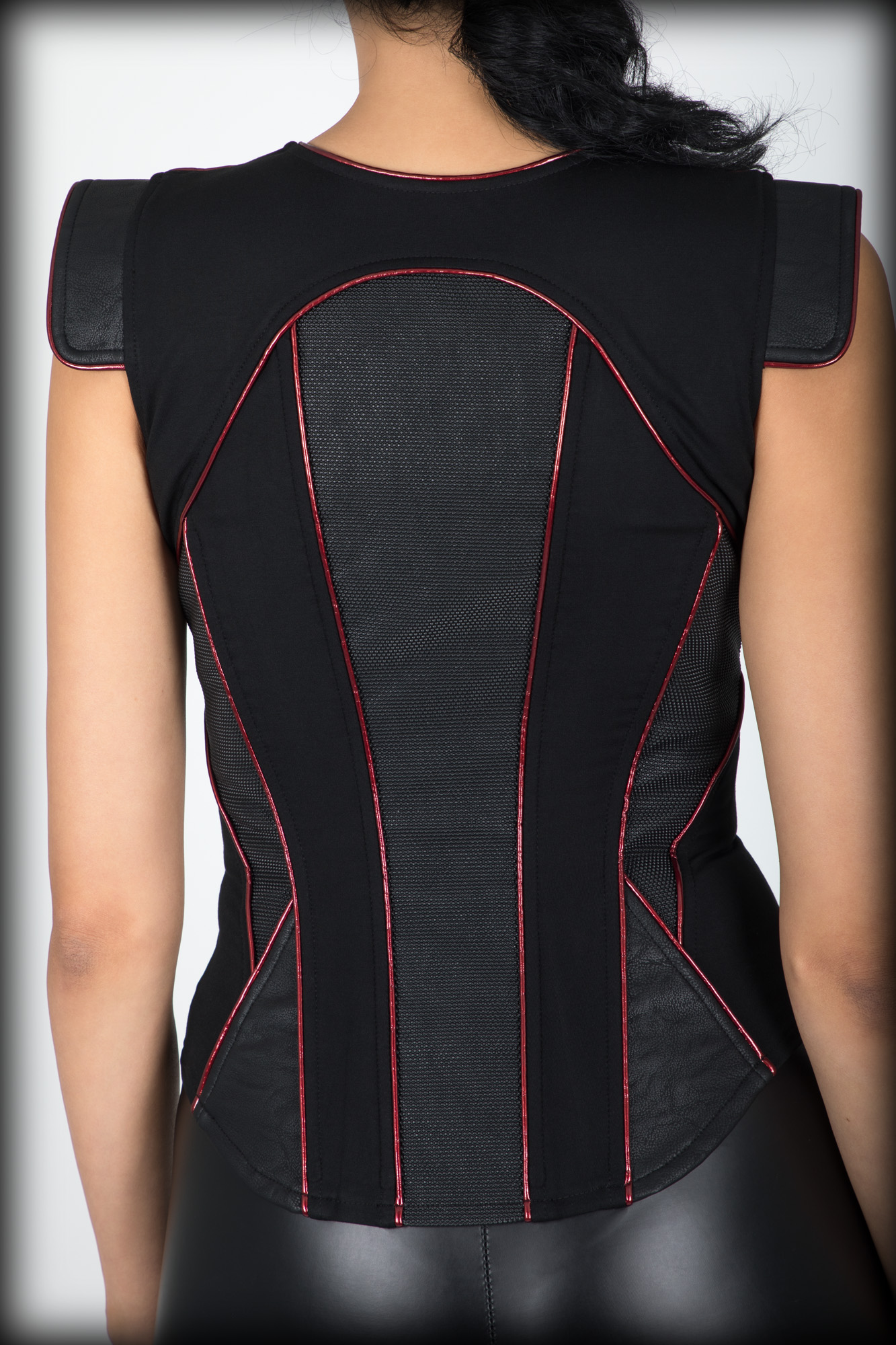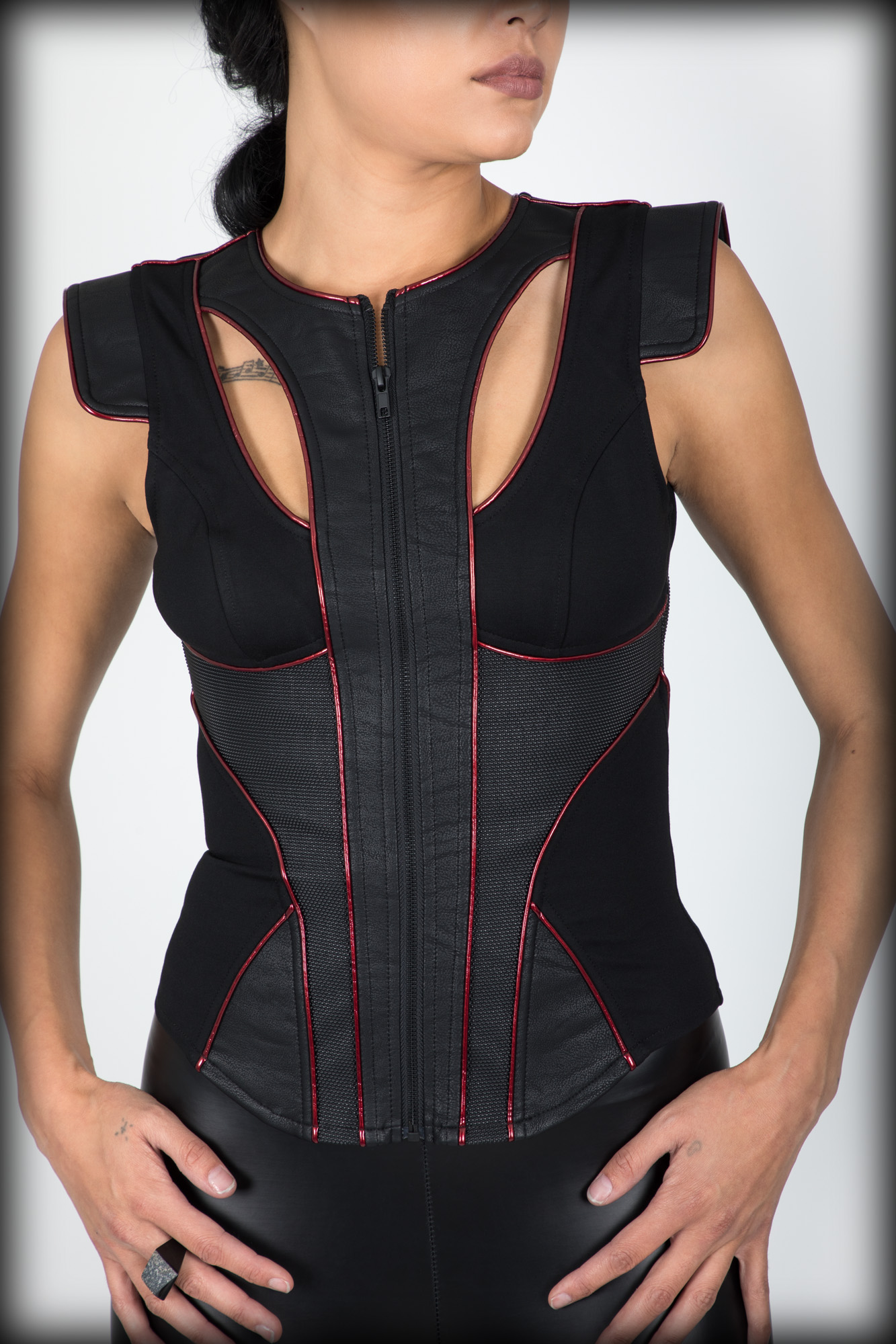 Black neoprene bustier with shiny red metallic PVC piping, textured rubber contrast with cutouts and exposed black metal zipper at center front.