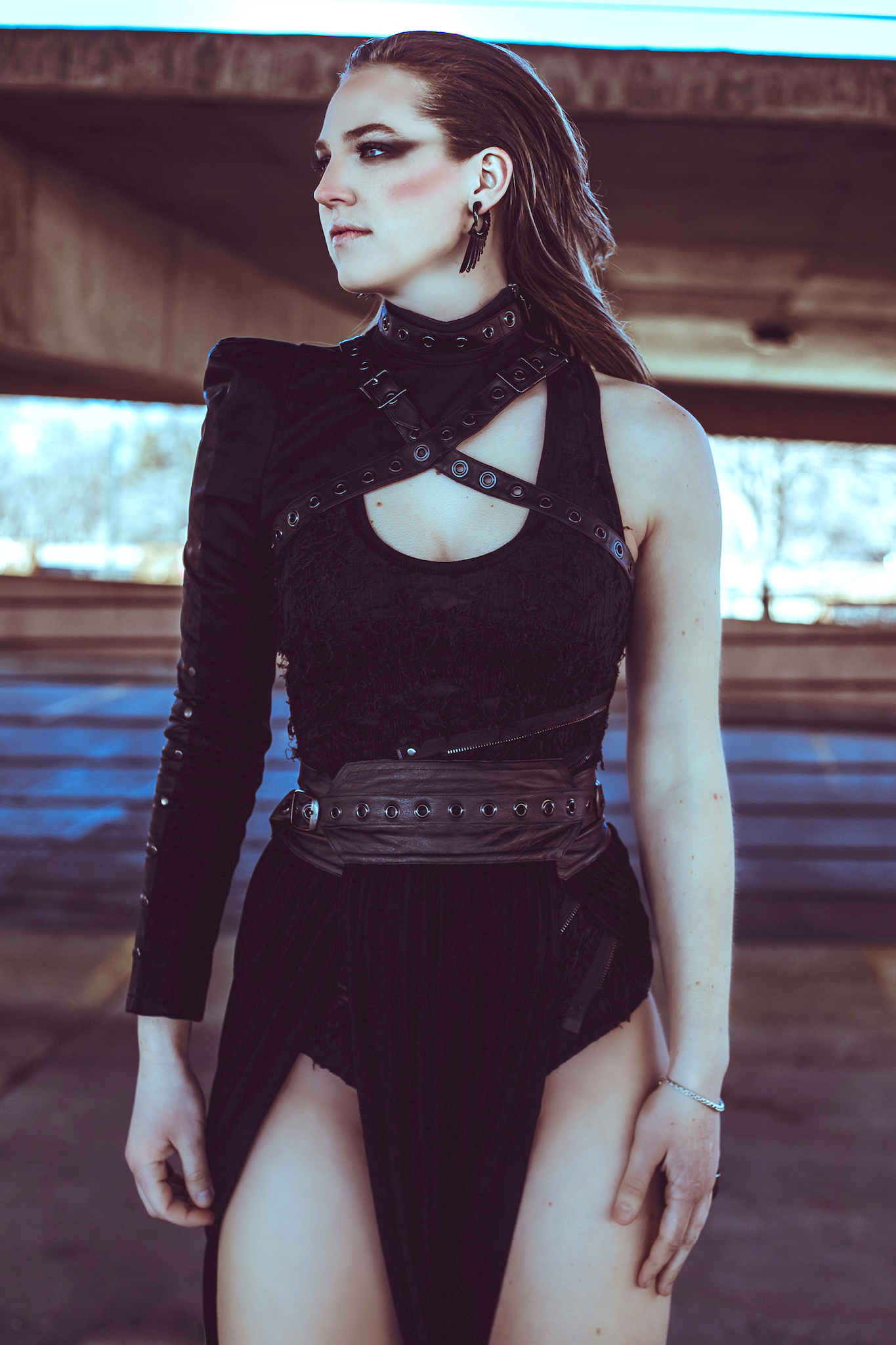Asymmetrical harness with "armored" sleeve, cross body design, and high collar. Black metal grommets and buckle closures.