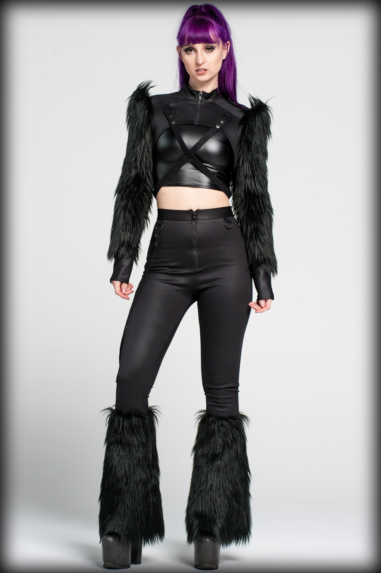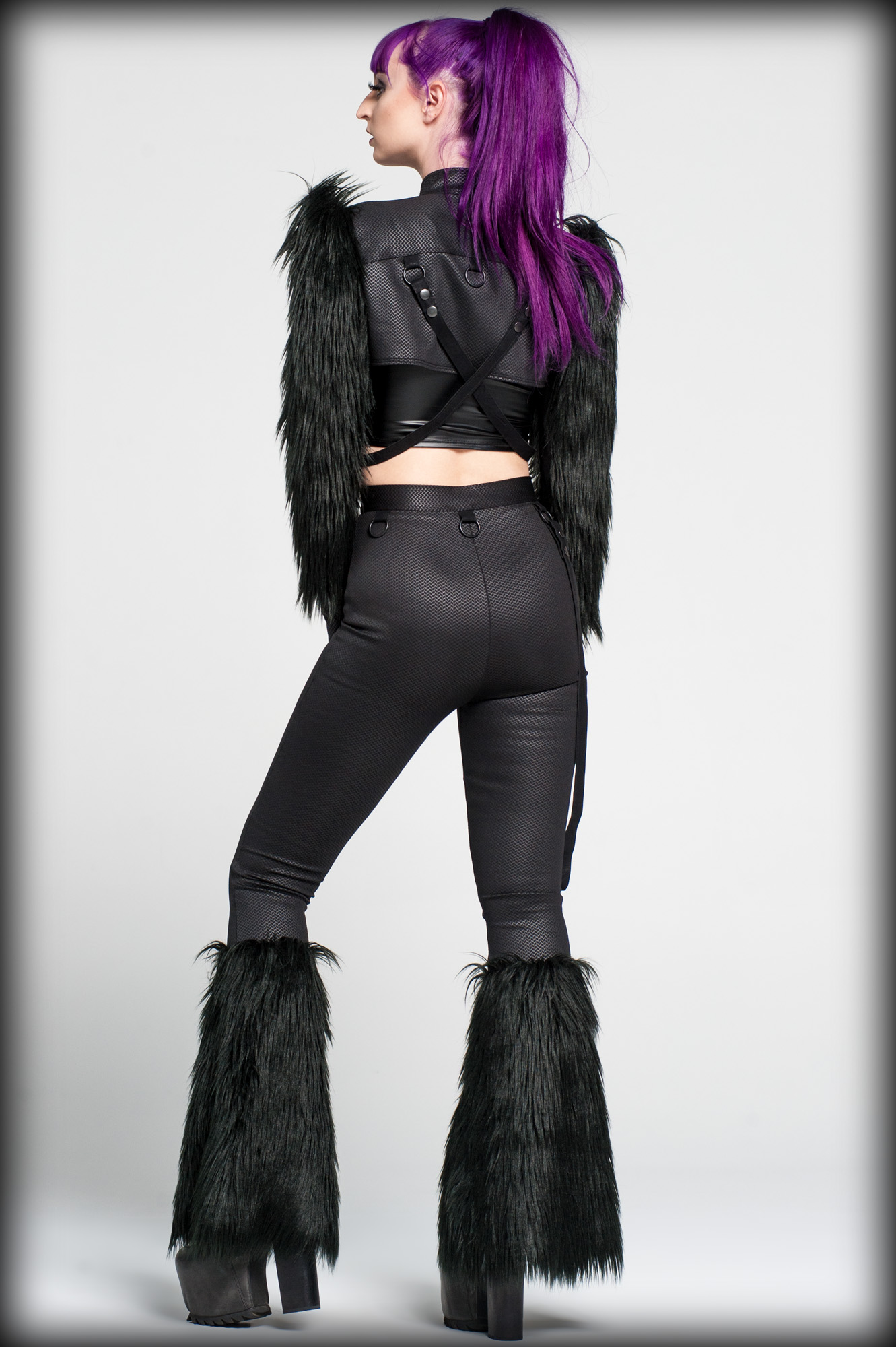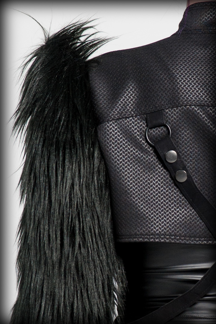 Cruelty free shrug with black on black printed scuba body, pointy shoulder fur sleeves, removable straps and black hardware and O-rings.