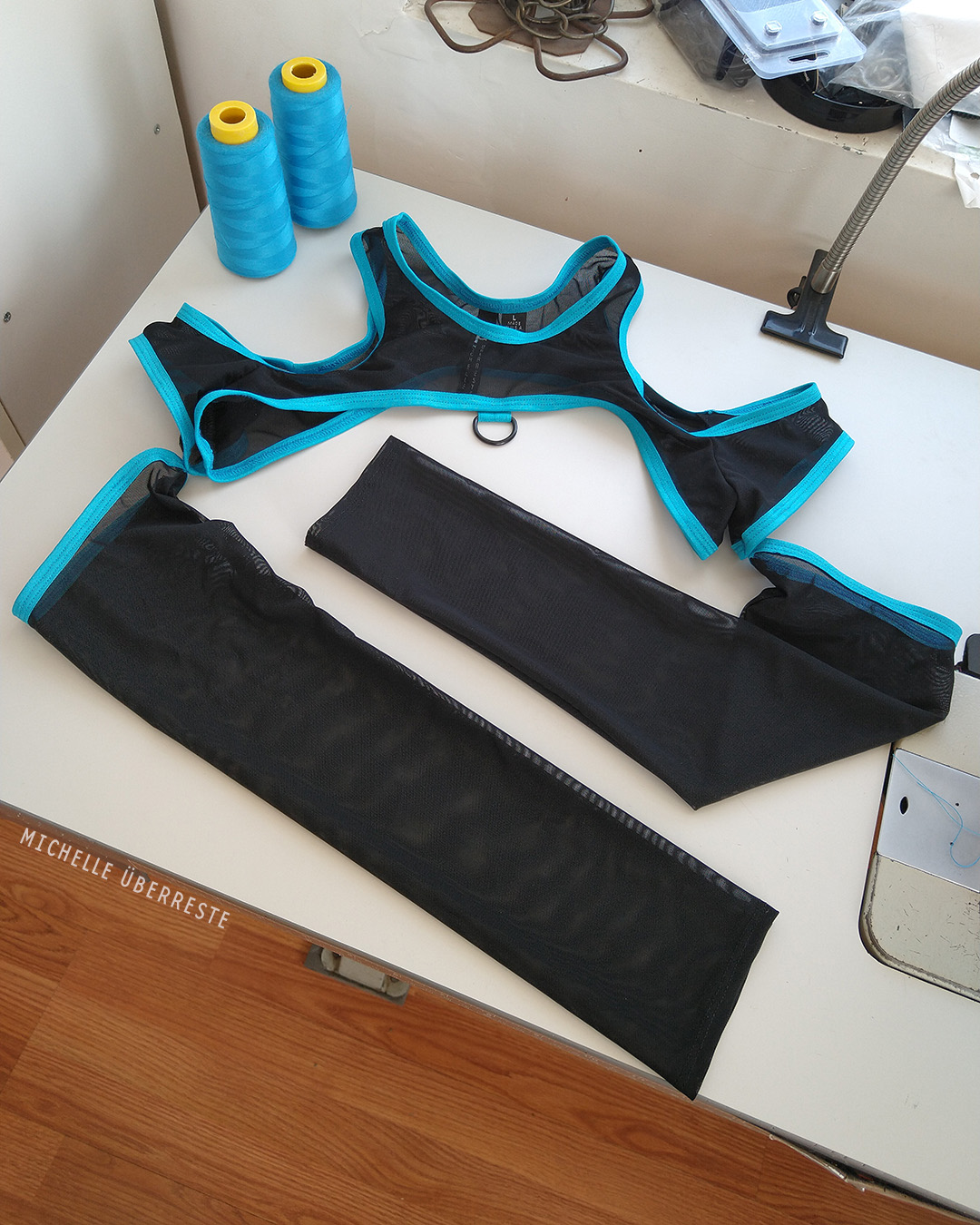 Black mesh shrug with shoulder cutouts, split sleeve detail and black metal D-ring at center front and turquoise blue binding.