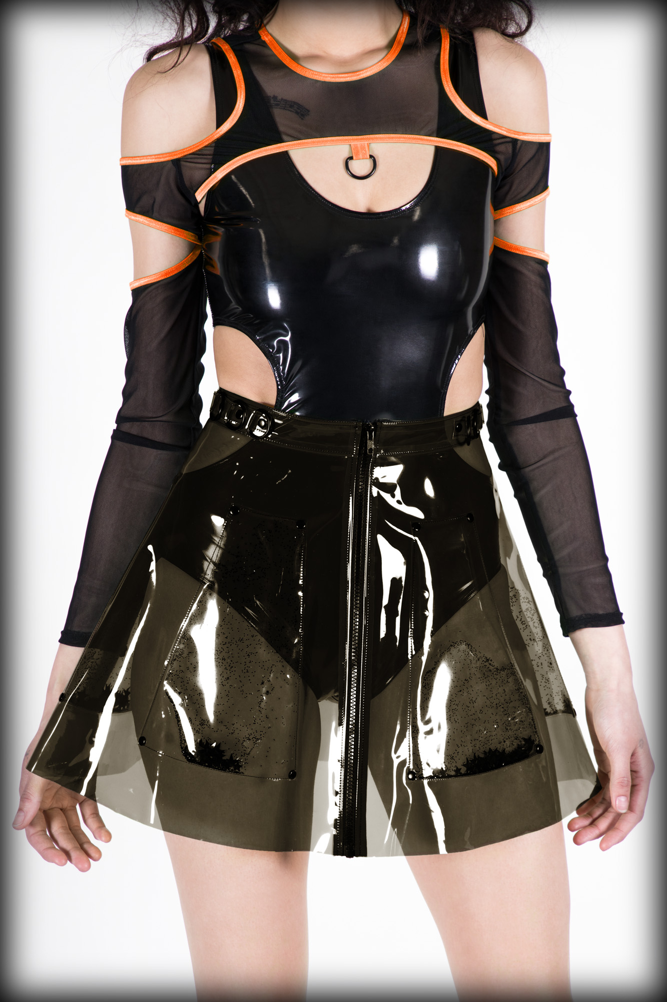 Black mesh shrug with shoulder cutouts, split sleeve detail and black metal D-ring at center front and neon UV reactive orange binding.