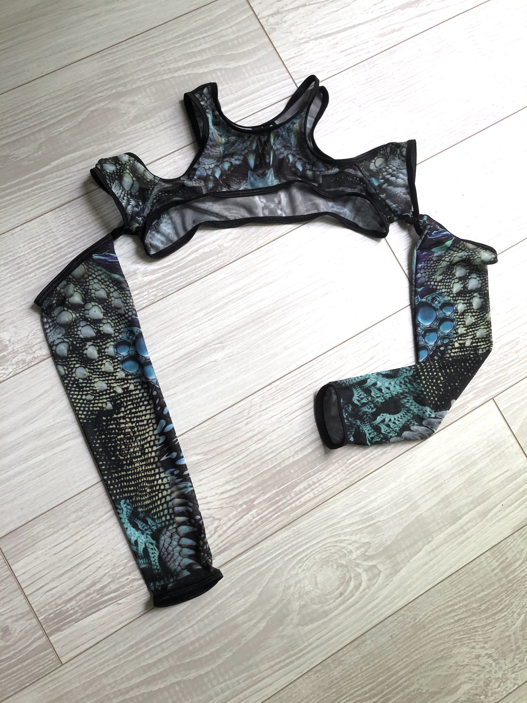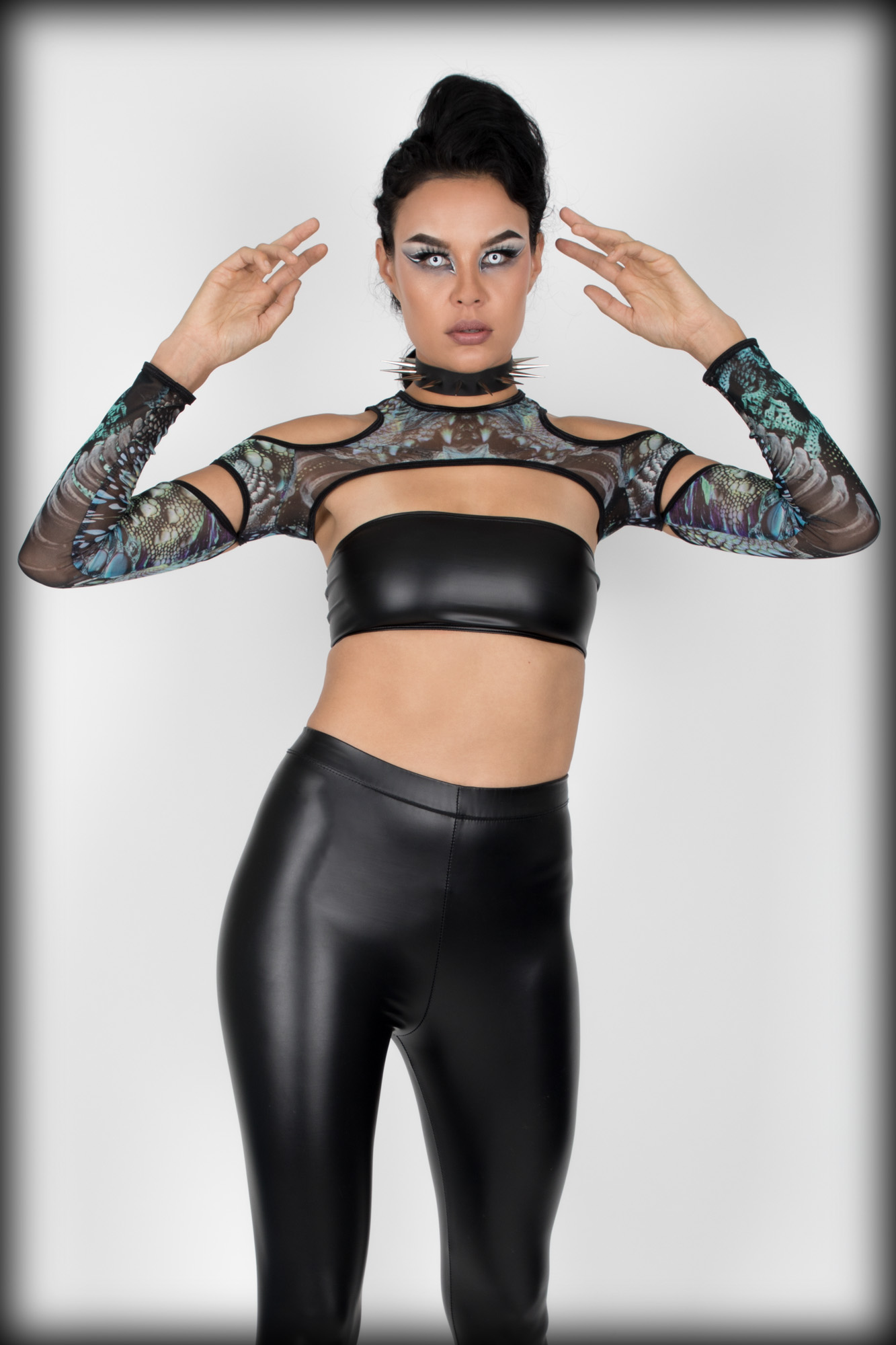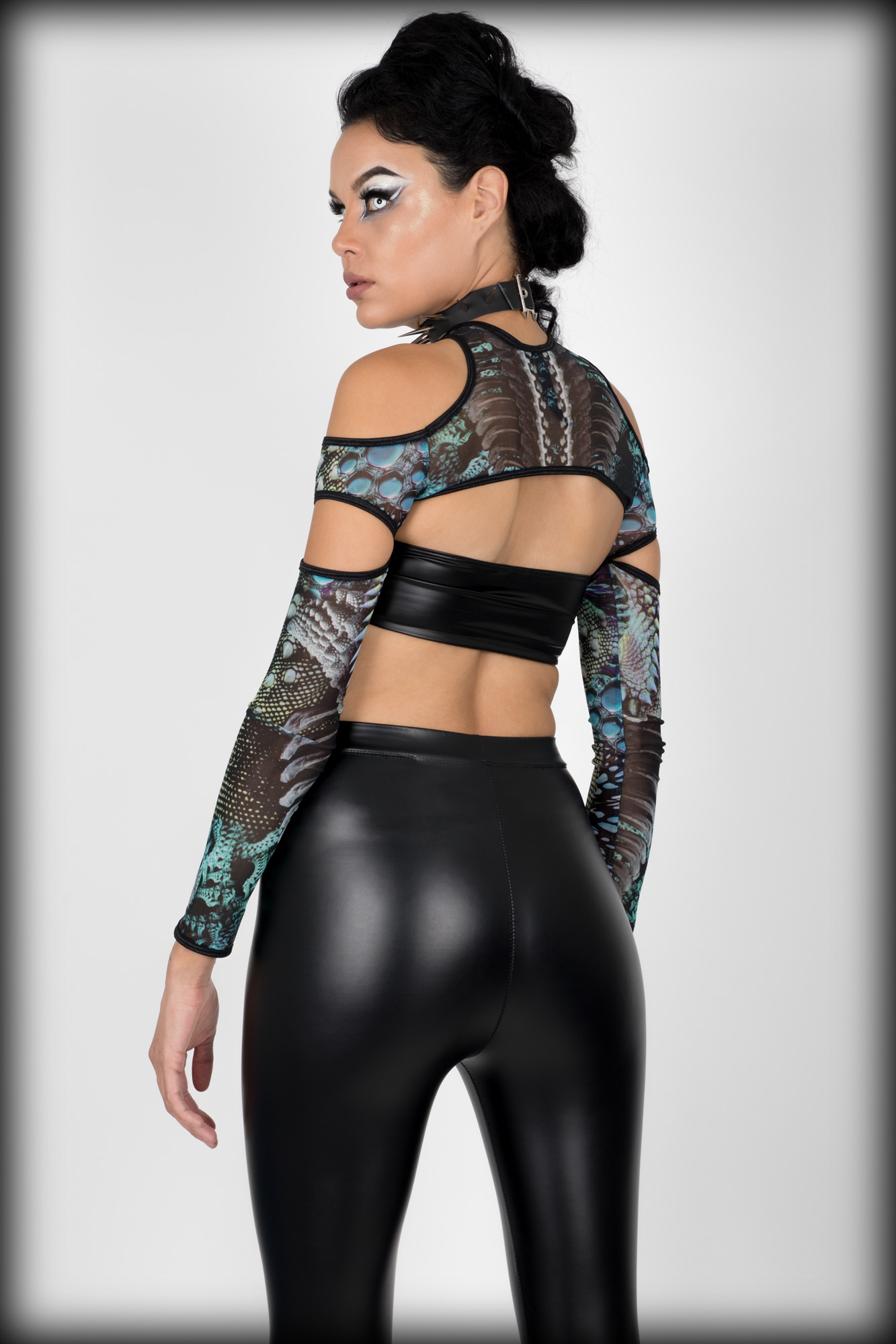 Custom "alien" printed mesh shrug with shoulder cutouts, and split sleeve detail with black binding.