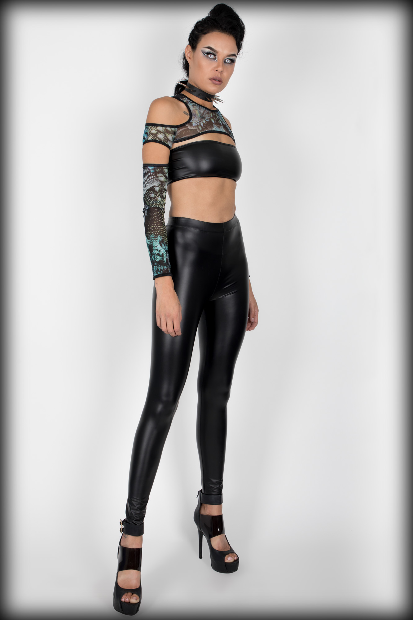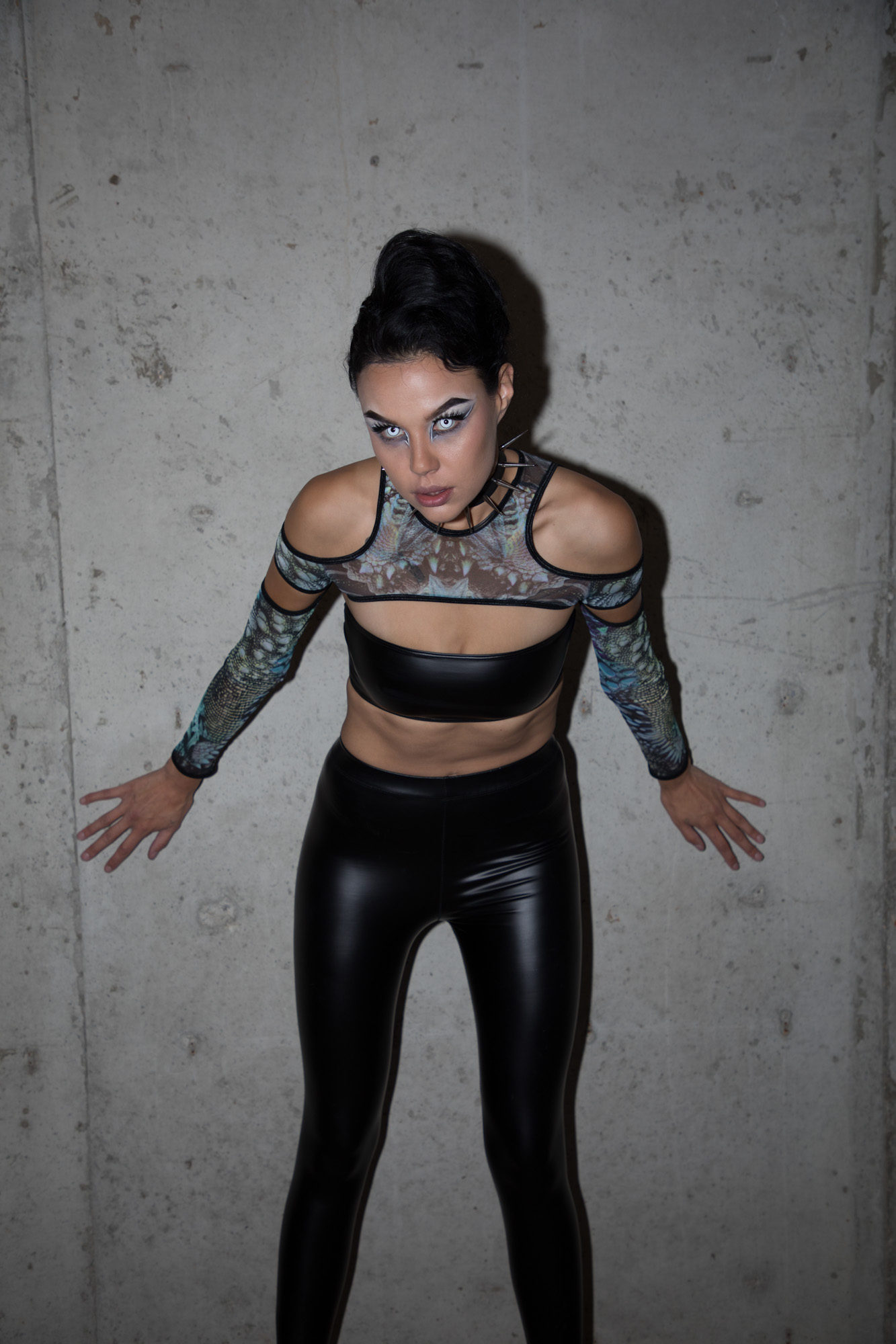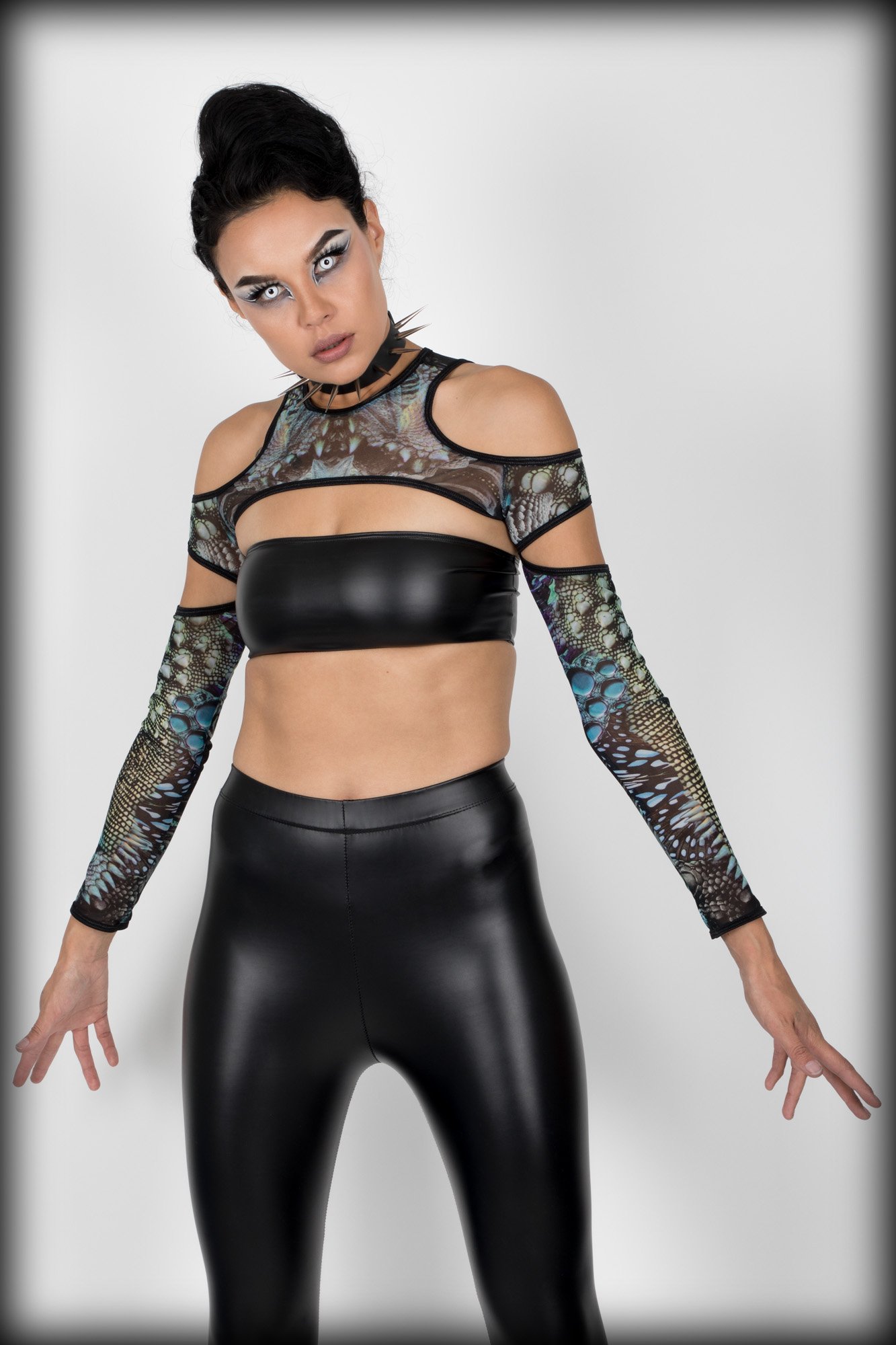 Custom "alien" printed mesh shrug with shoulder cutouts, and split sleeve detail with black binding.