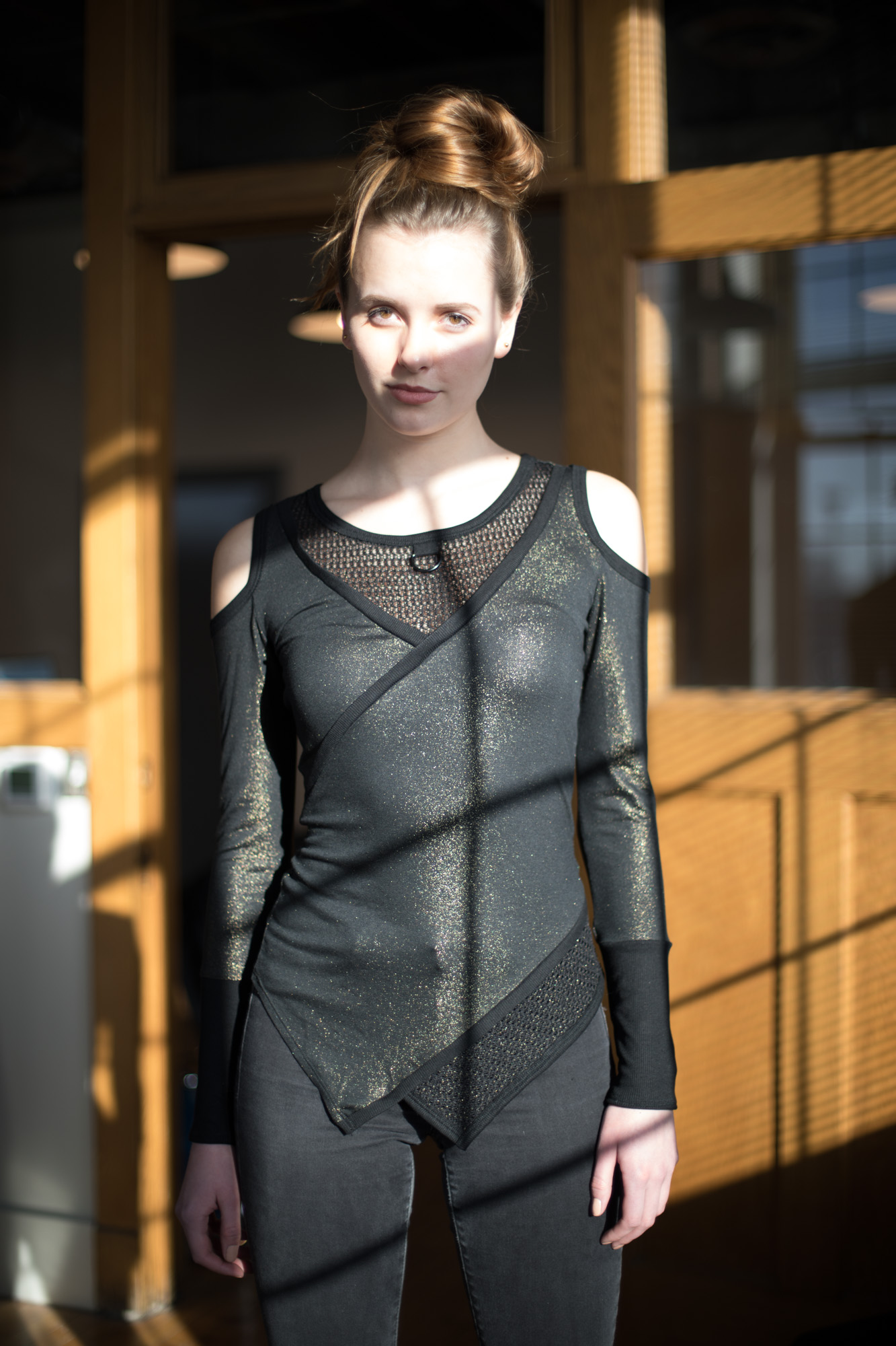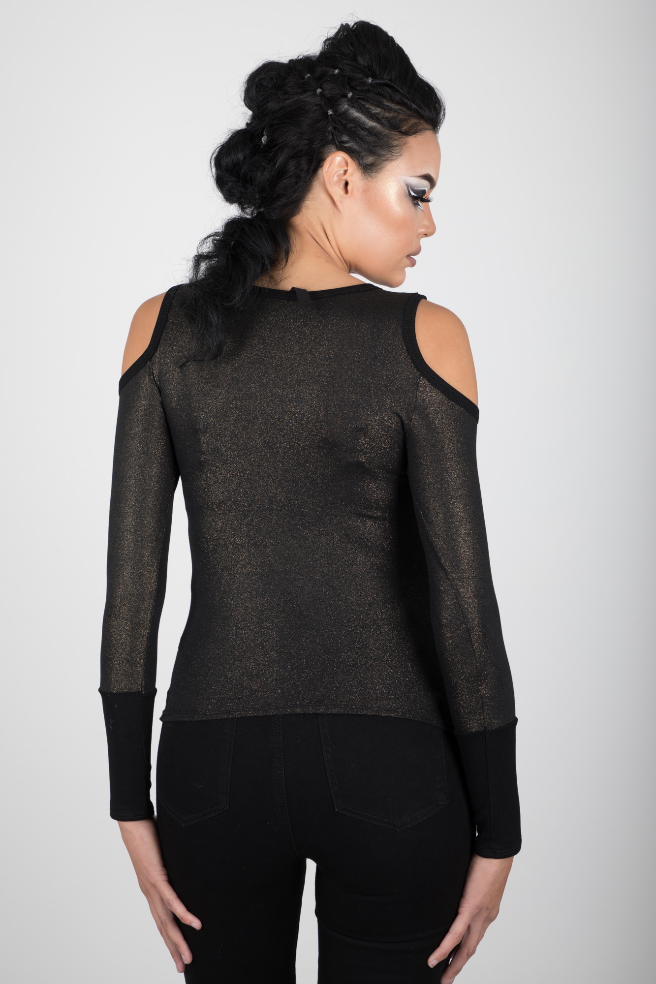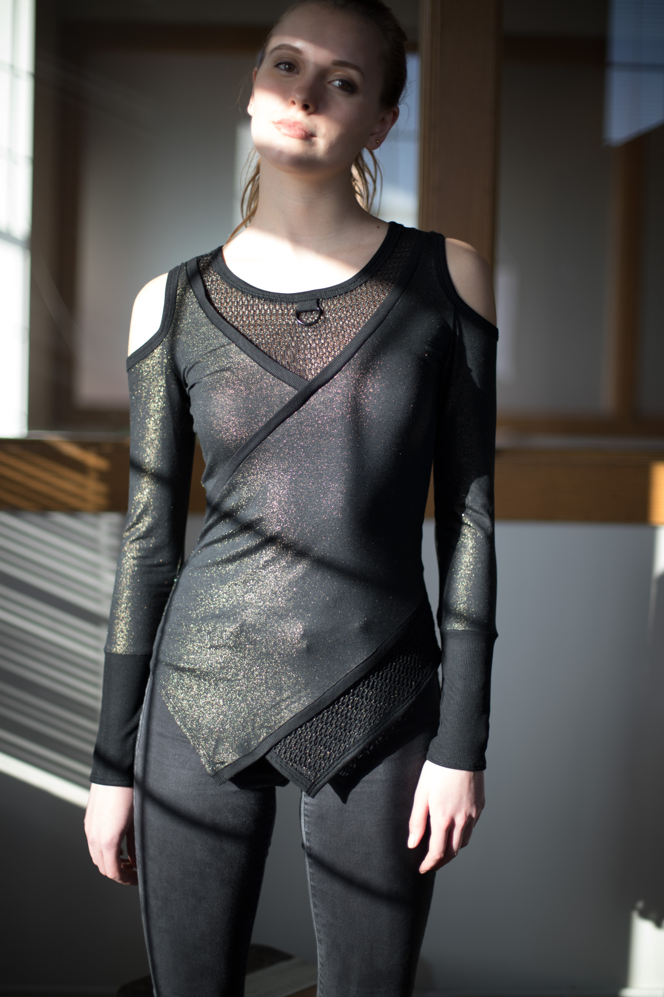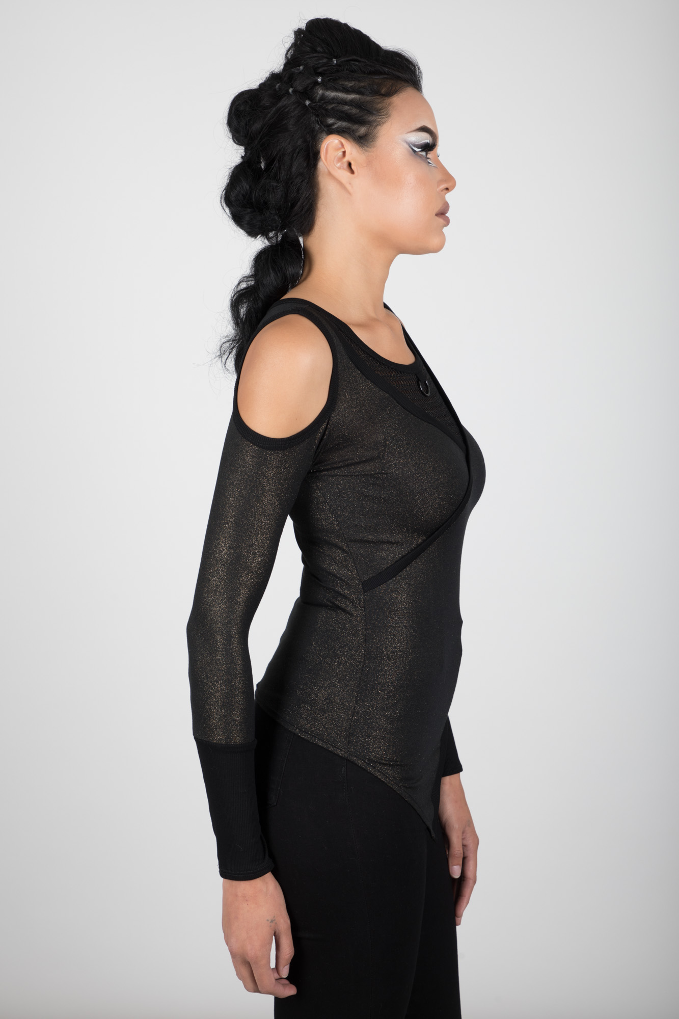One of a kind longsleeve jersey top with gold spray glitter treatment, raw ribbed contrast and binding, and gold foiled sweater mesh inset at center front with black metal D-ring. Geometric asymmetrical hem.