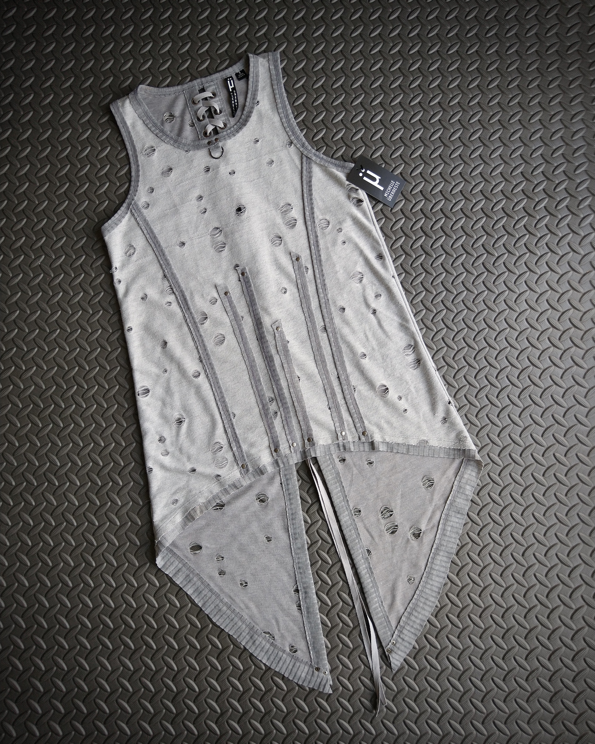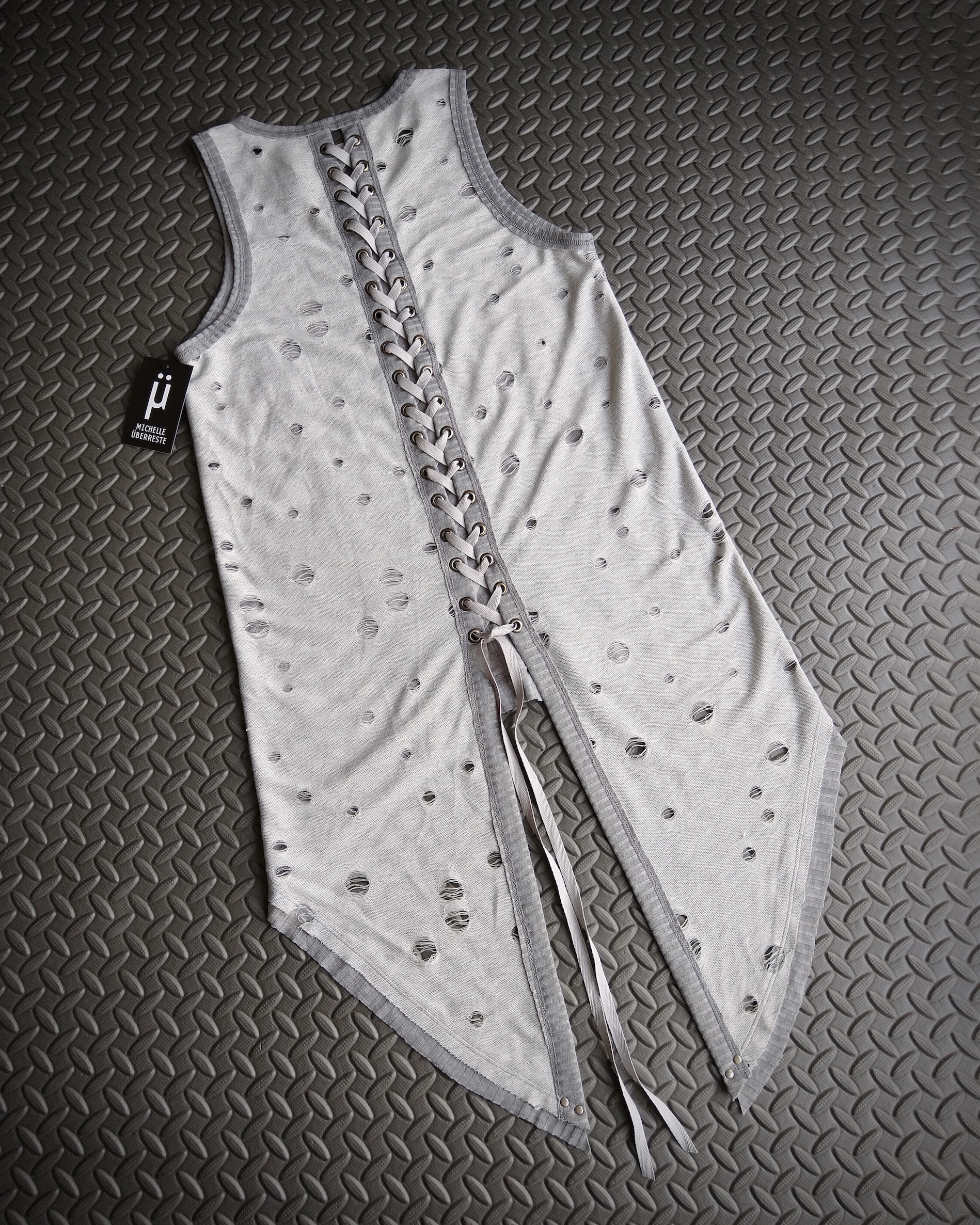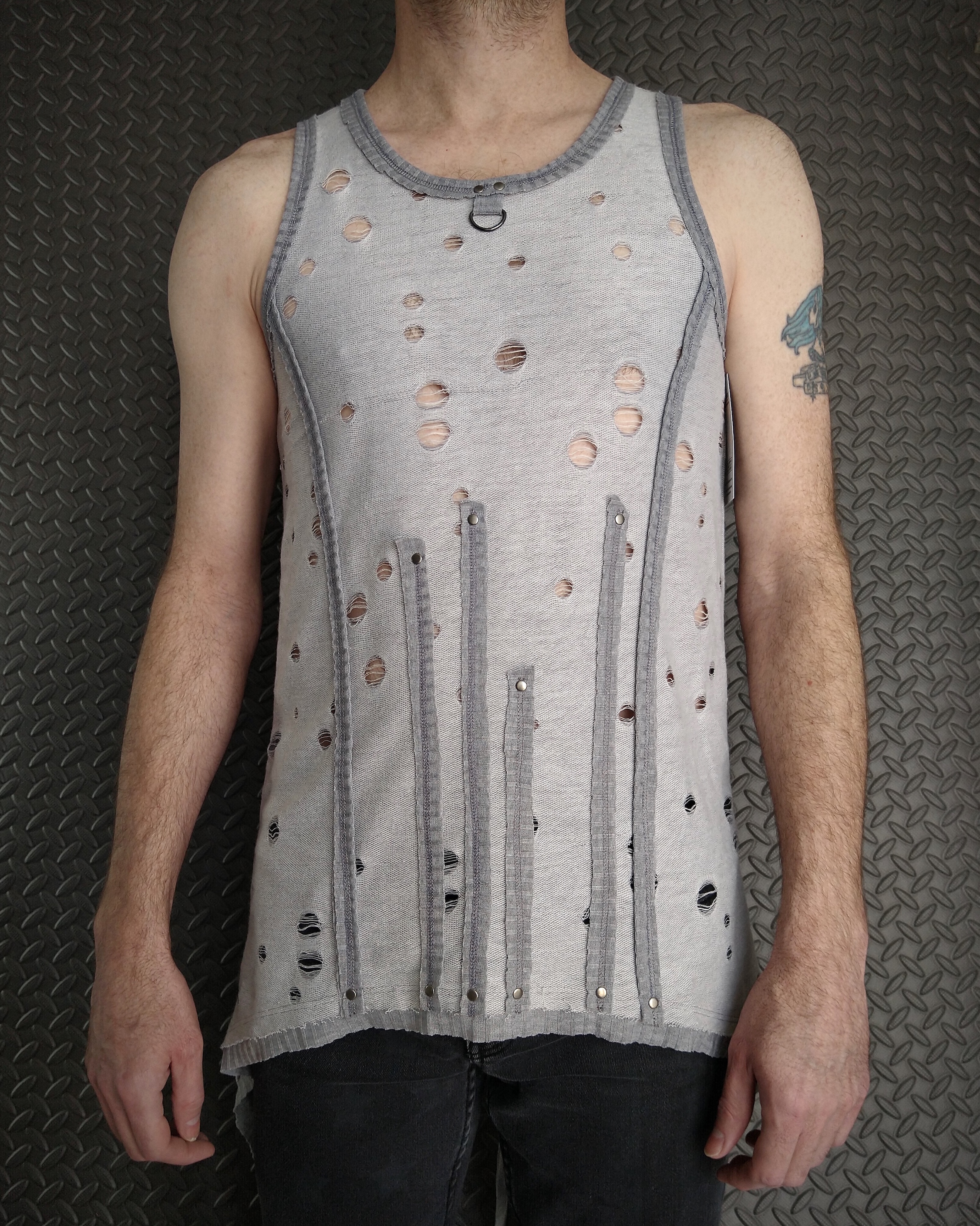 Unisex tank made from cotton blend reversed french terry with distressed holes, raw edge ribbed binding, and dark metal hardware details: D-ring, baby rivets + grommets. Lace up back that splits into tails.