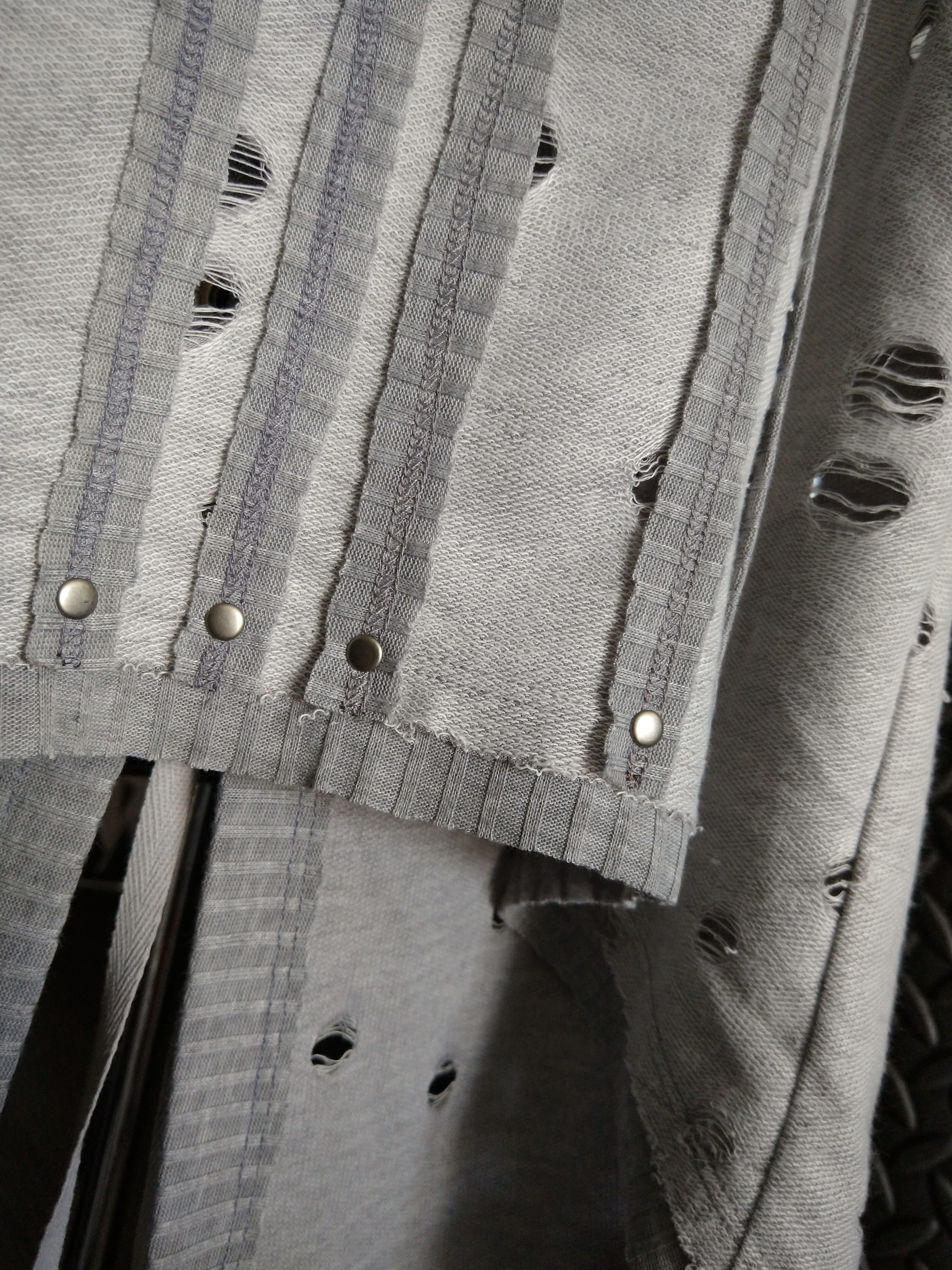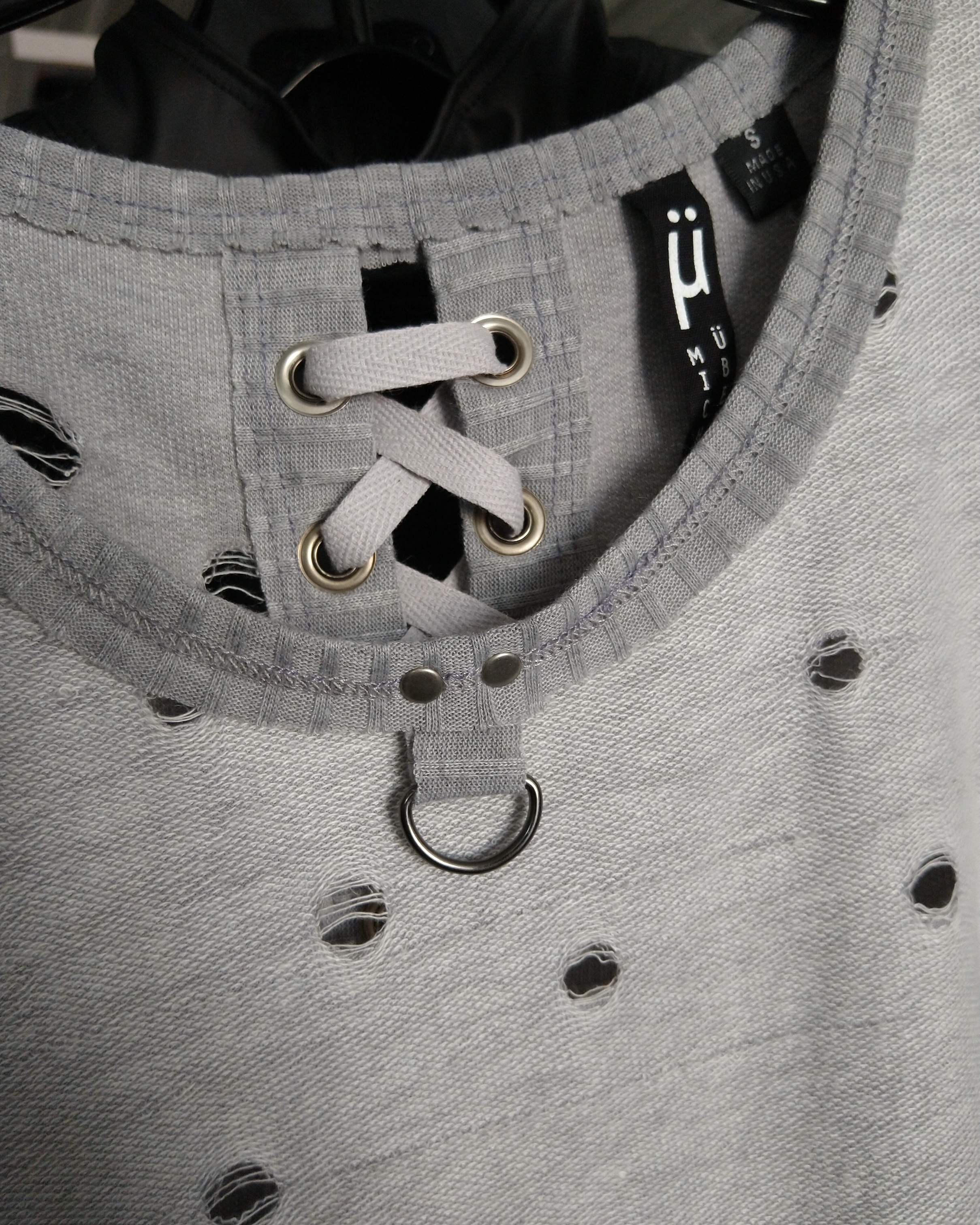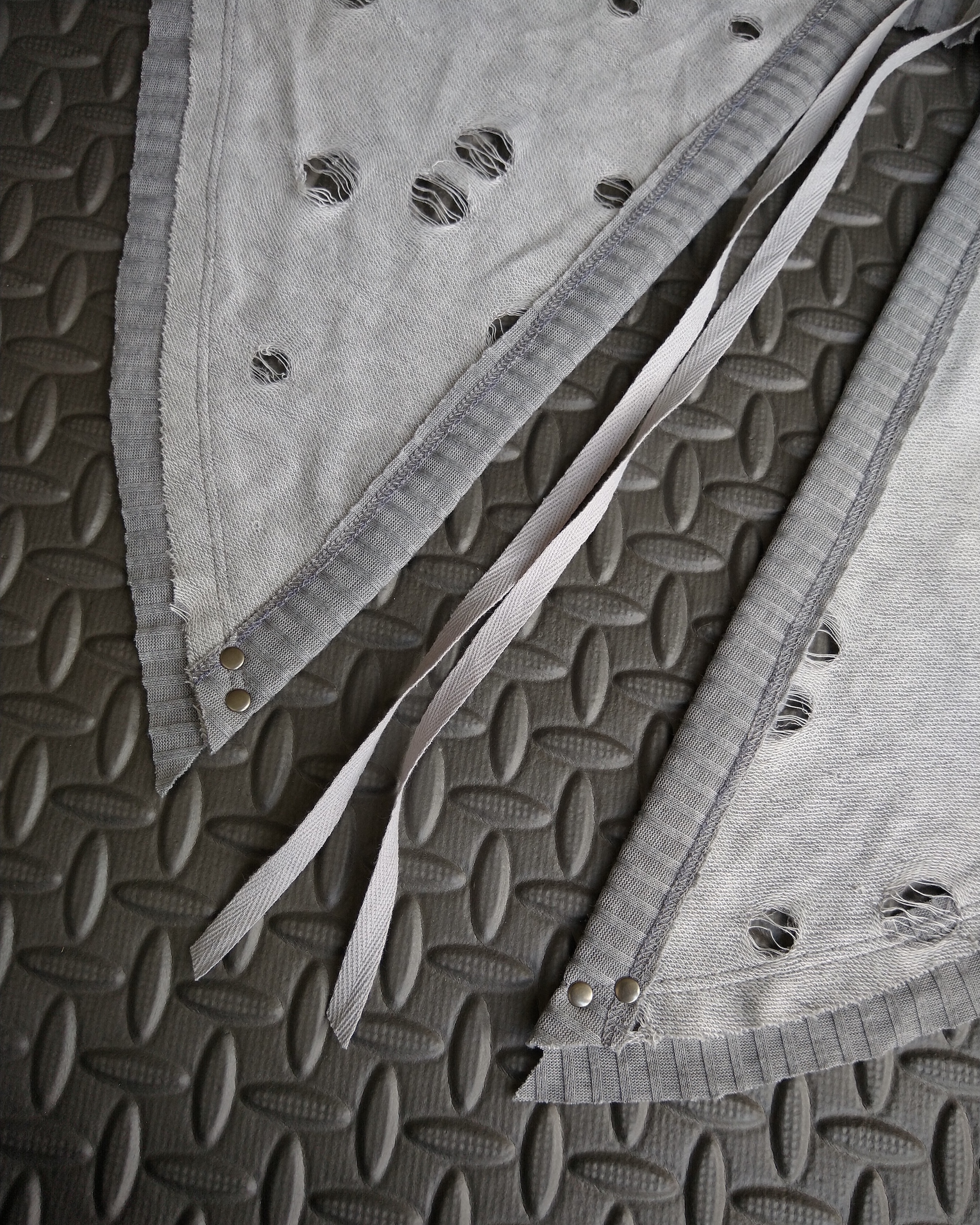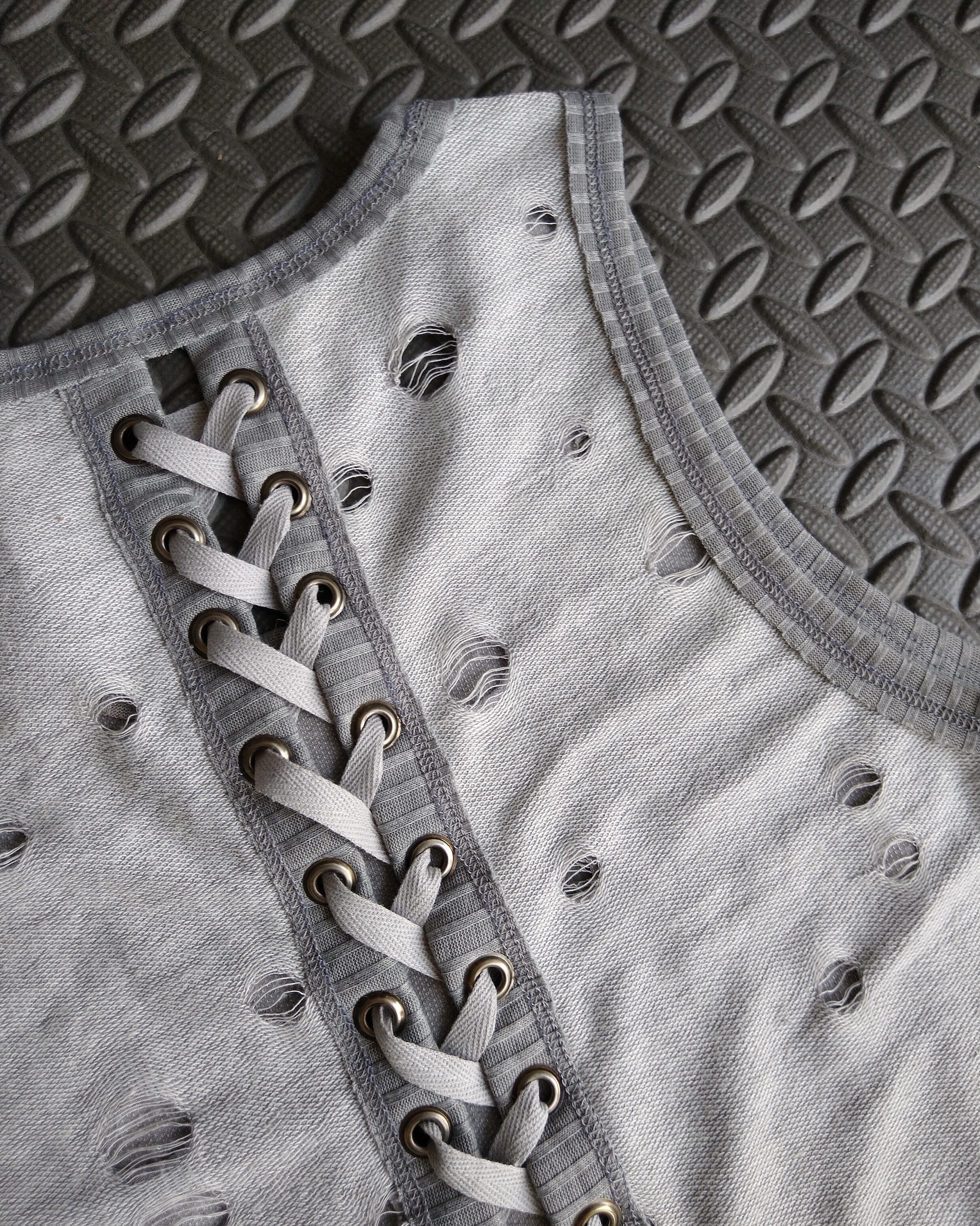Unisex tank made from cotton blend reversed french terry with distressed holes, raw edge ribbed binding, and dark metal hardware details: D-ring, baby rivets + grommets. Lace up back that splits into tails.