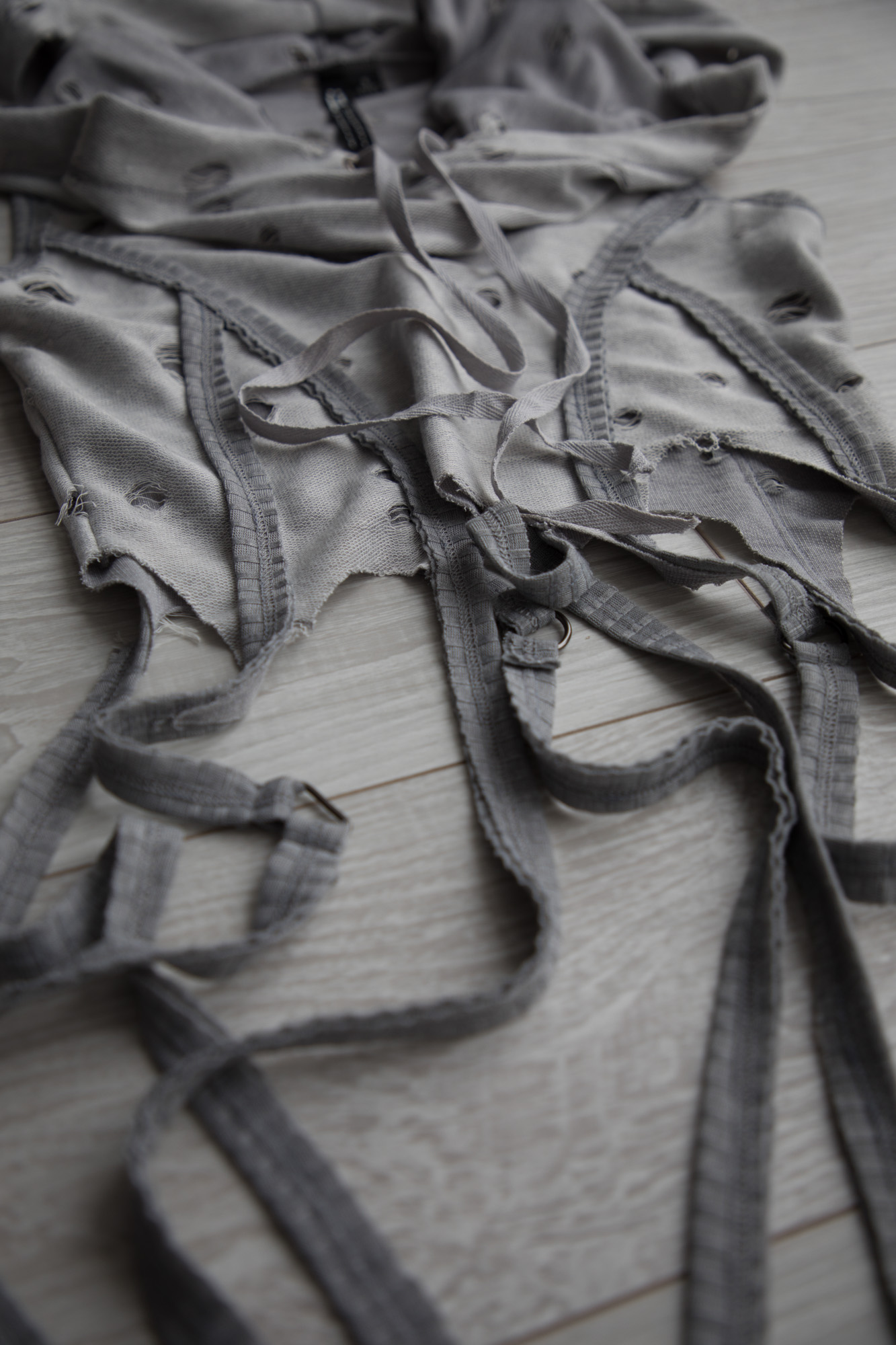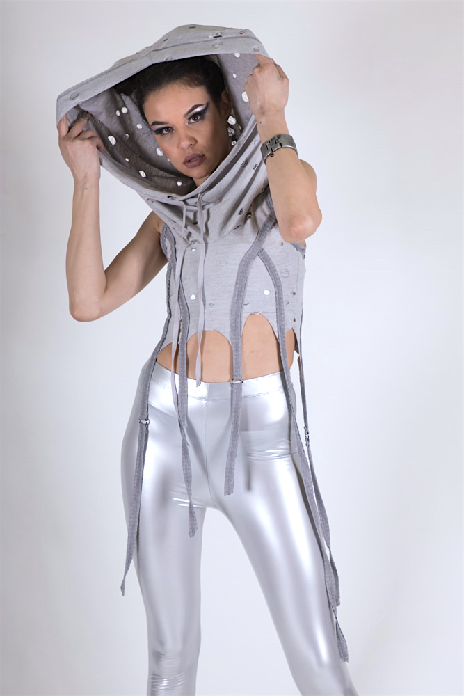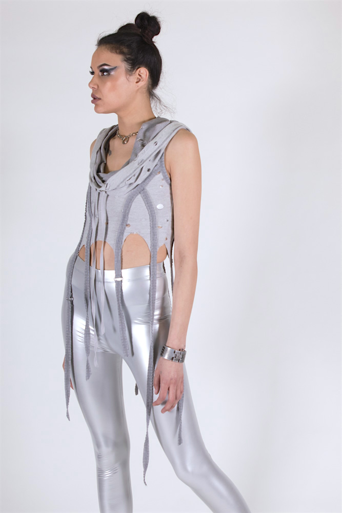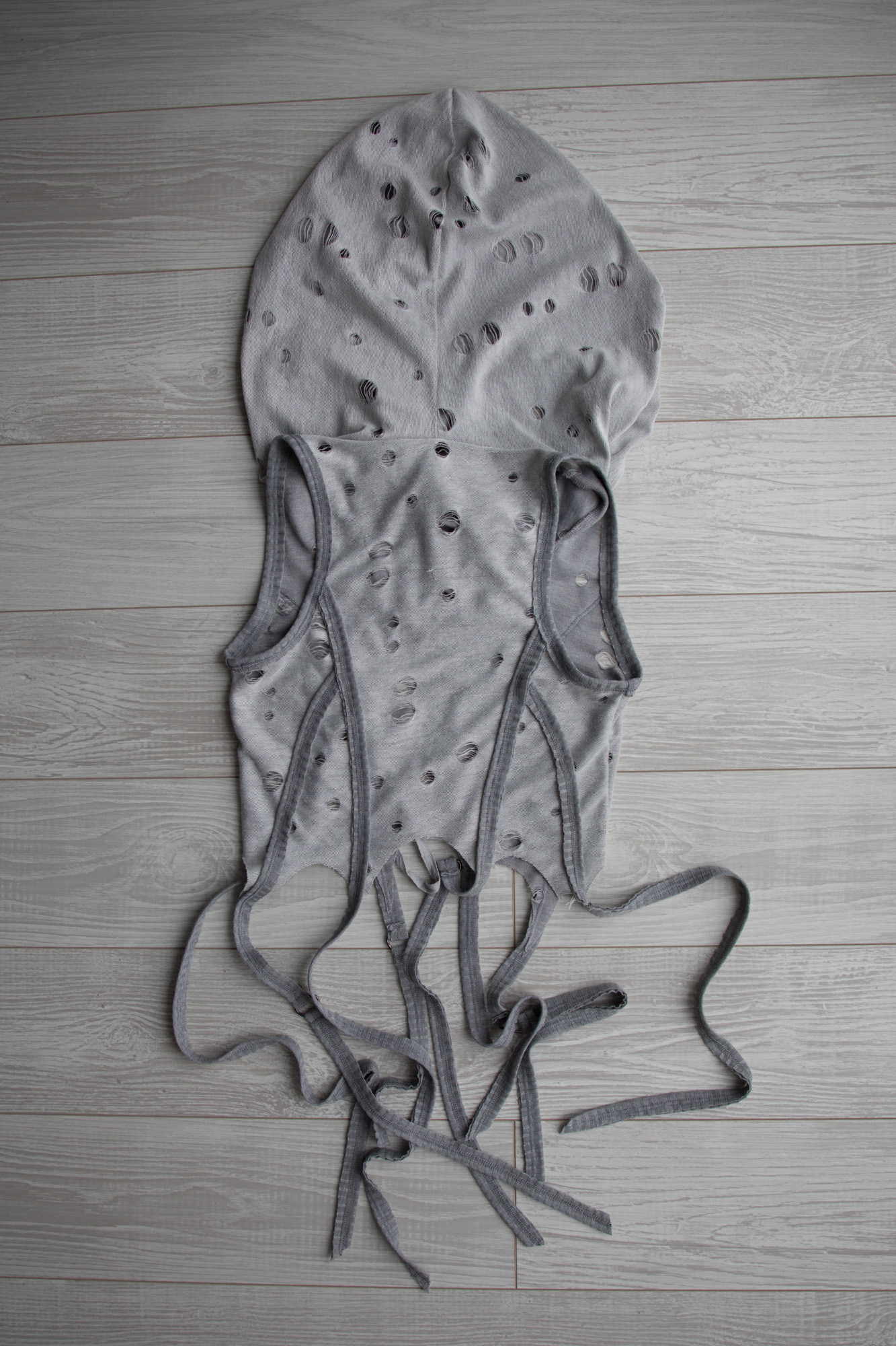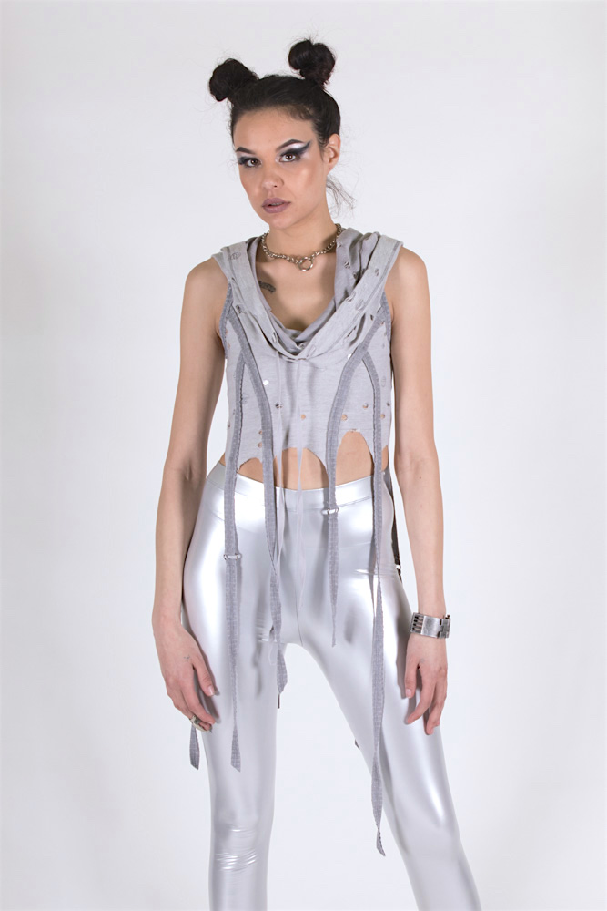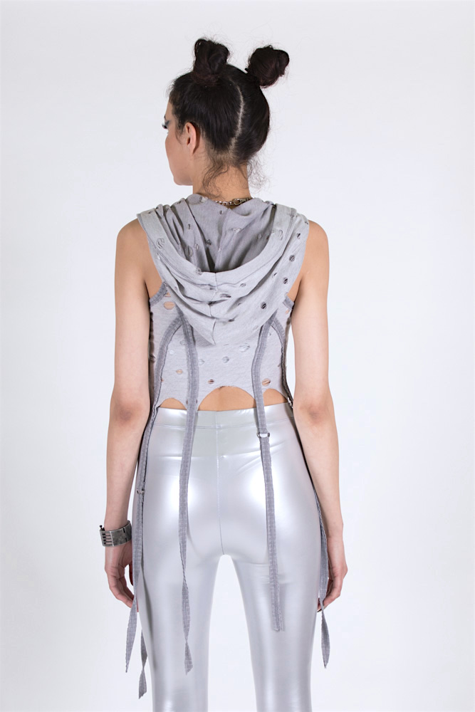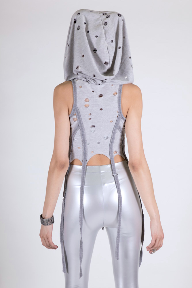 Crop top made from cotton blend reversed french terry with distressed holes, raw edge ribbed strapping and dark metal D-ring details. Bat wing hem with loose binding hanging off the tips, and huge oversized hood with cincher toggle for a dramatic entrance.
