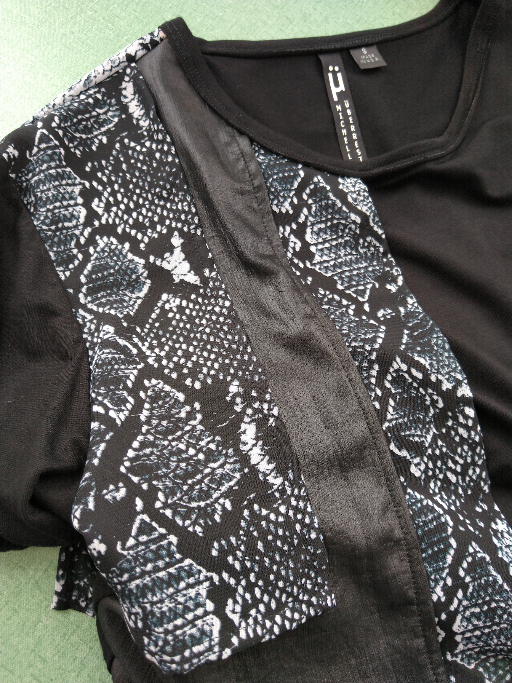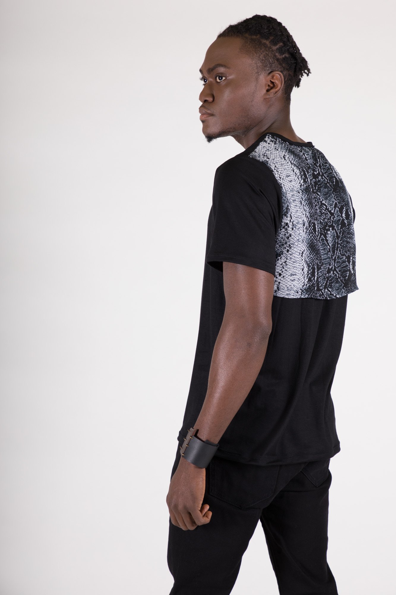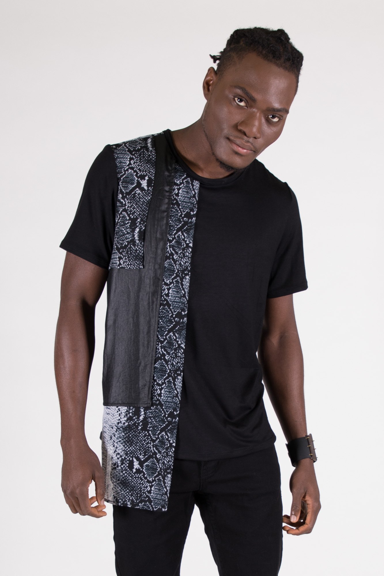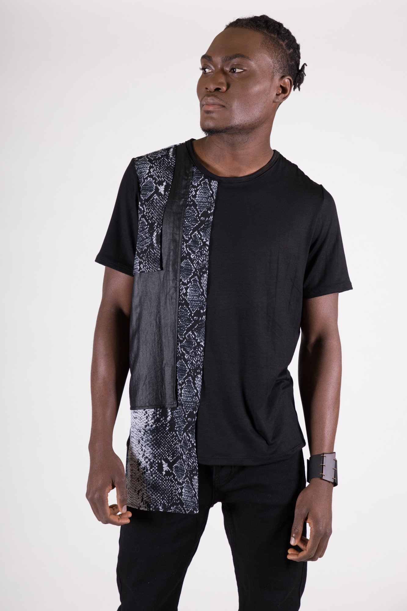 One of a kind unisex soft rayon jersey crew neck tee with sheer black and snake print chiffon layers. Ribbed neckband.