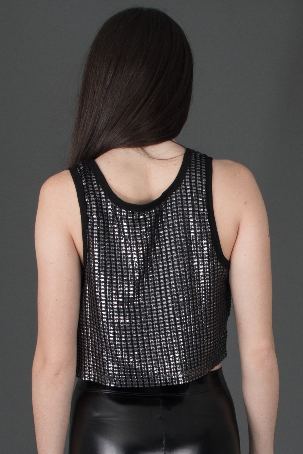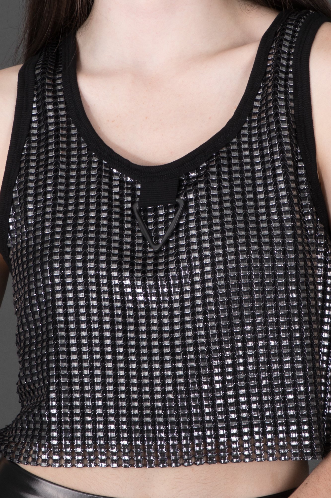 Oversized, relaxed fit tank made from silver square mesh on top of a jersey lining with raw hem, raw rib binding, and large triangle ring at center front.
