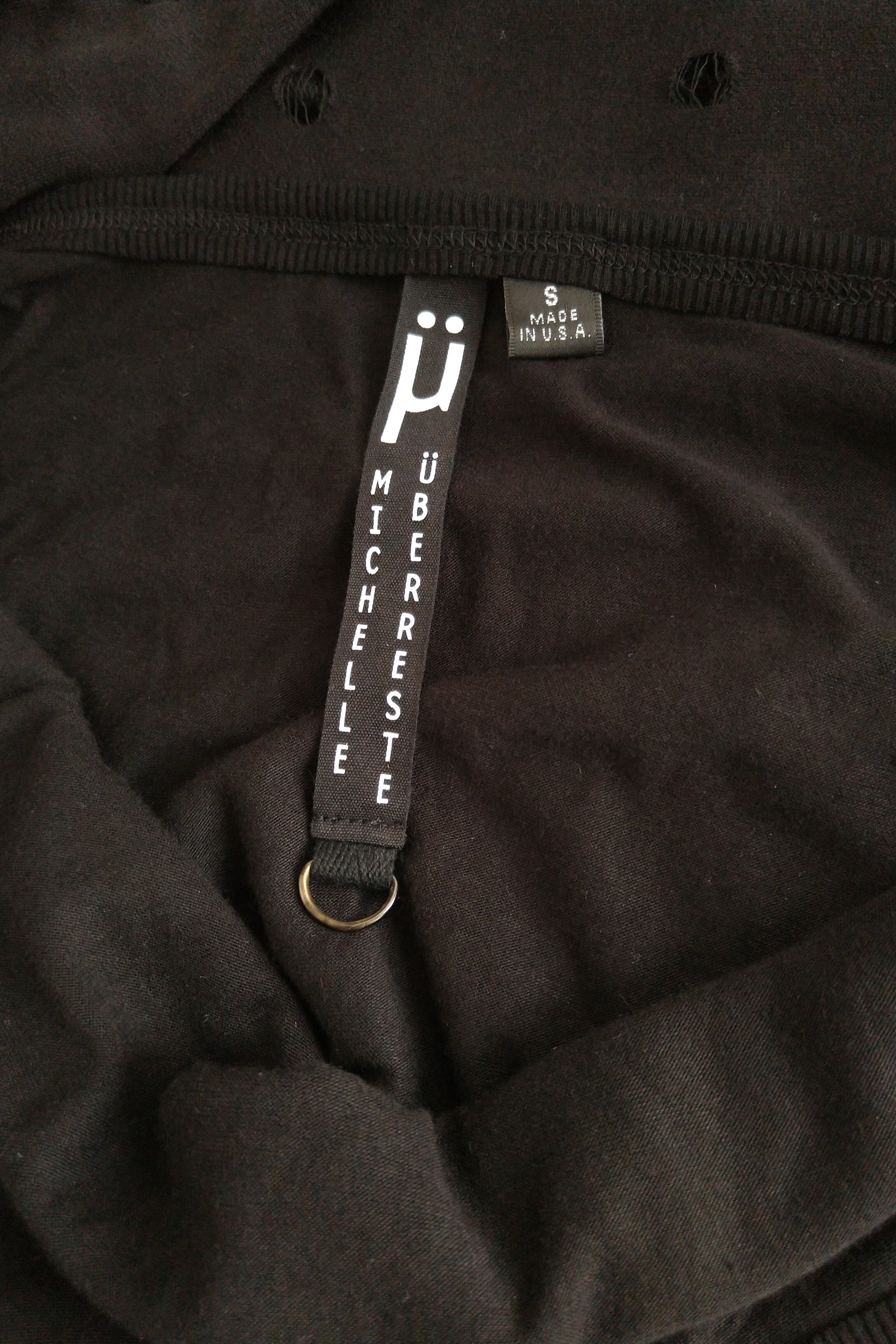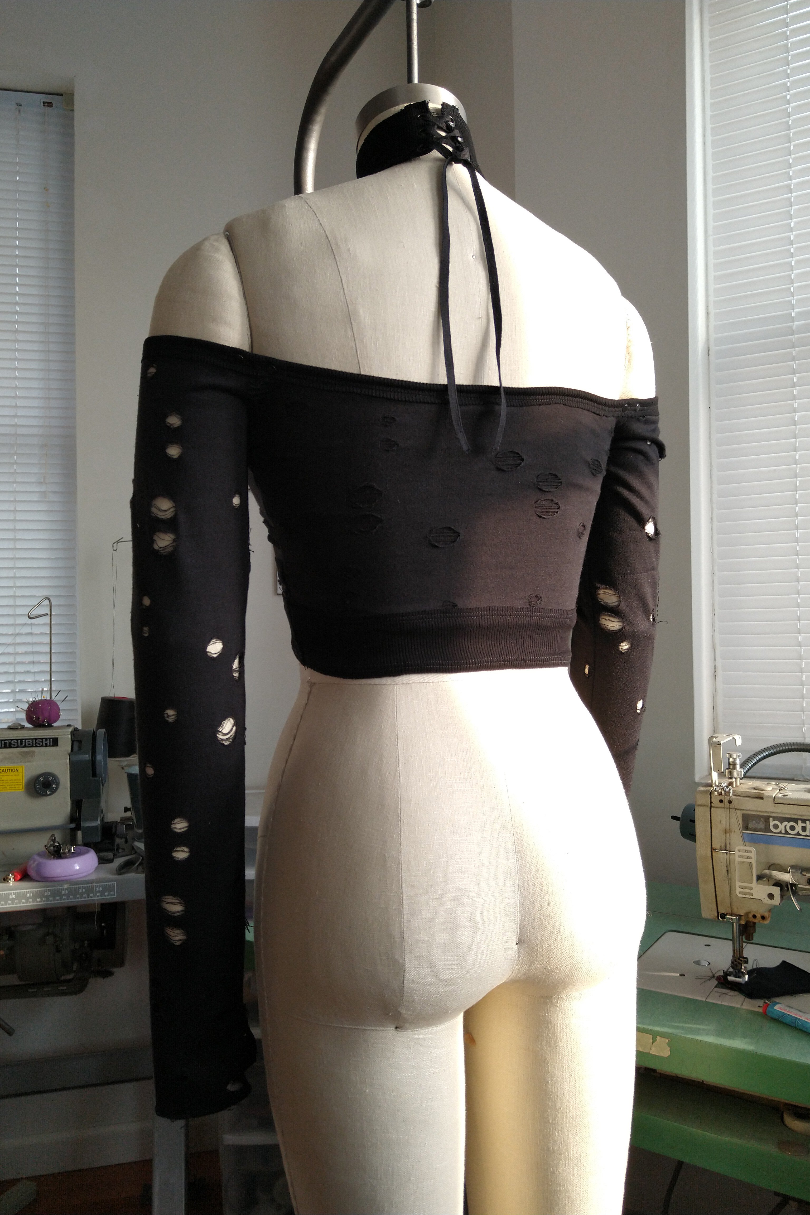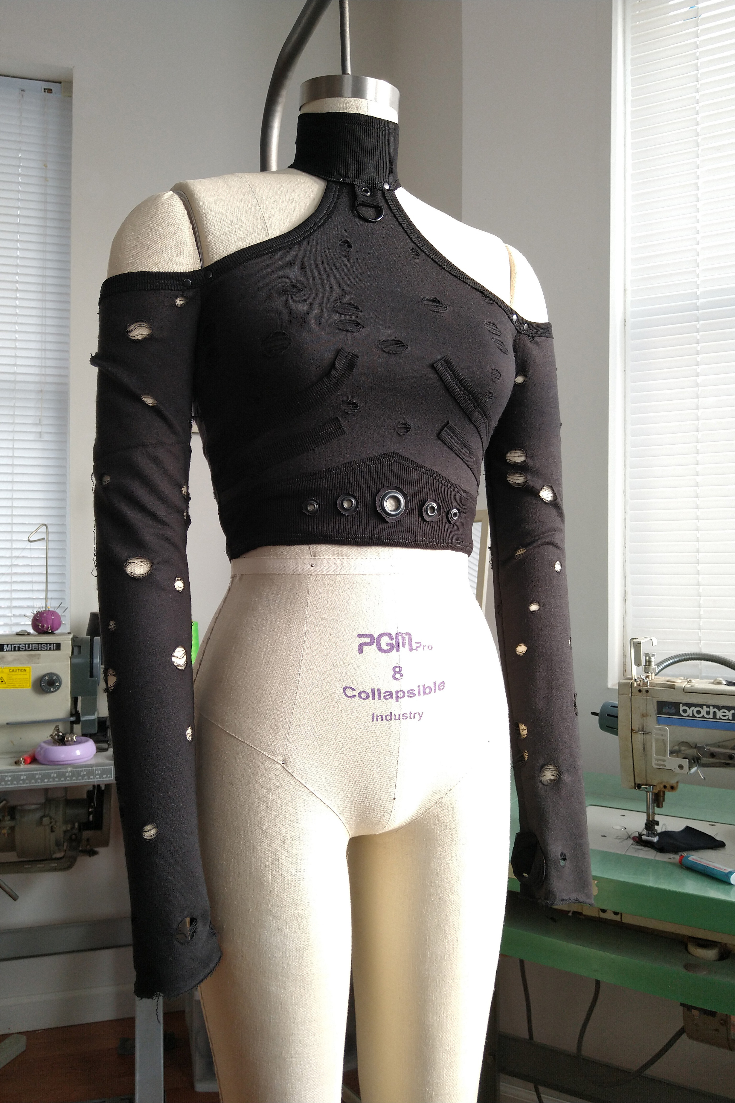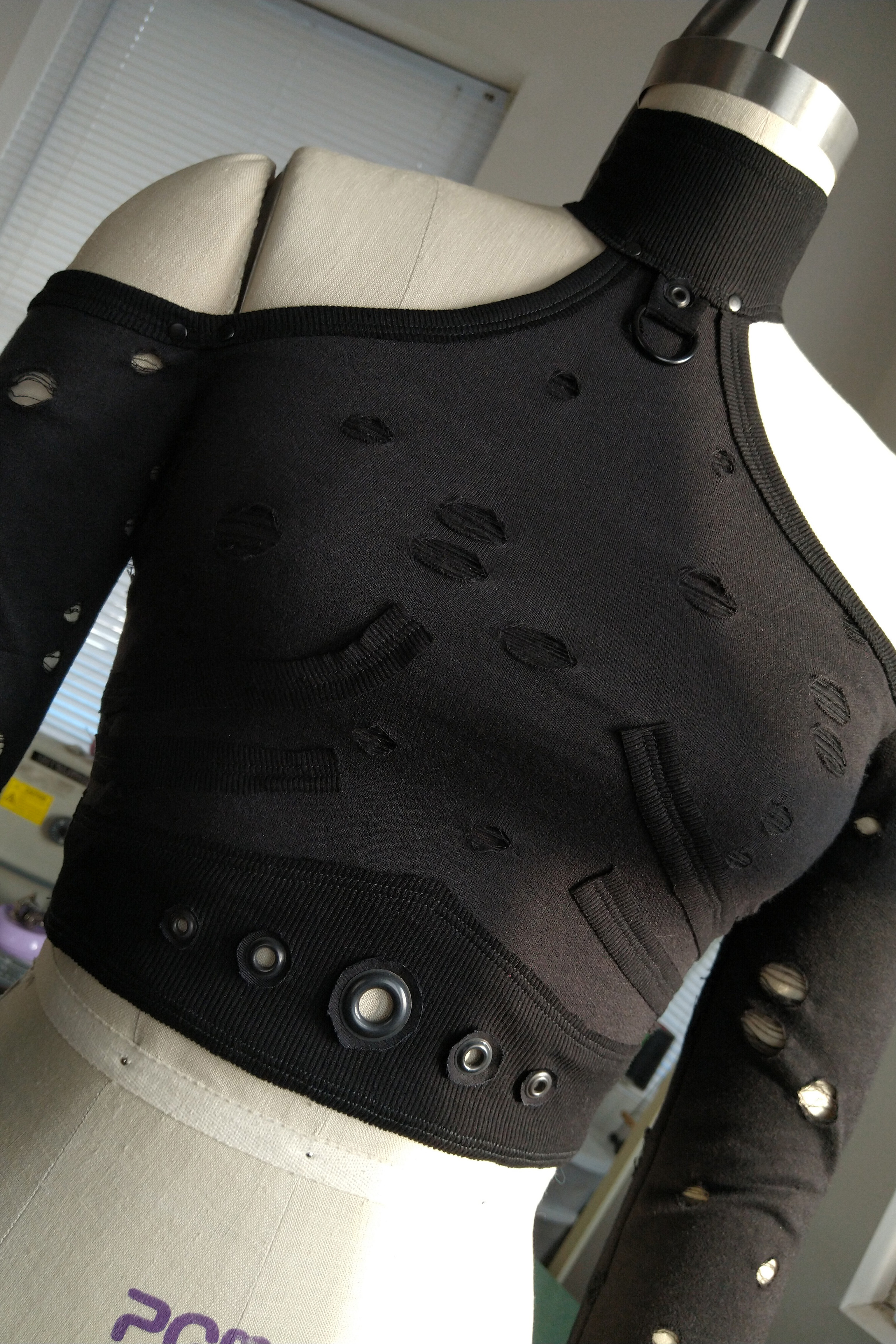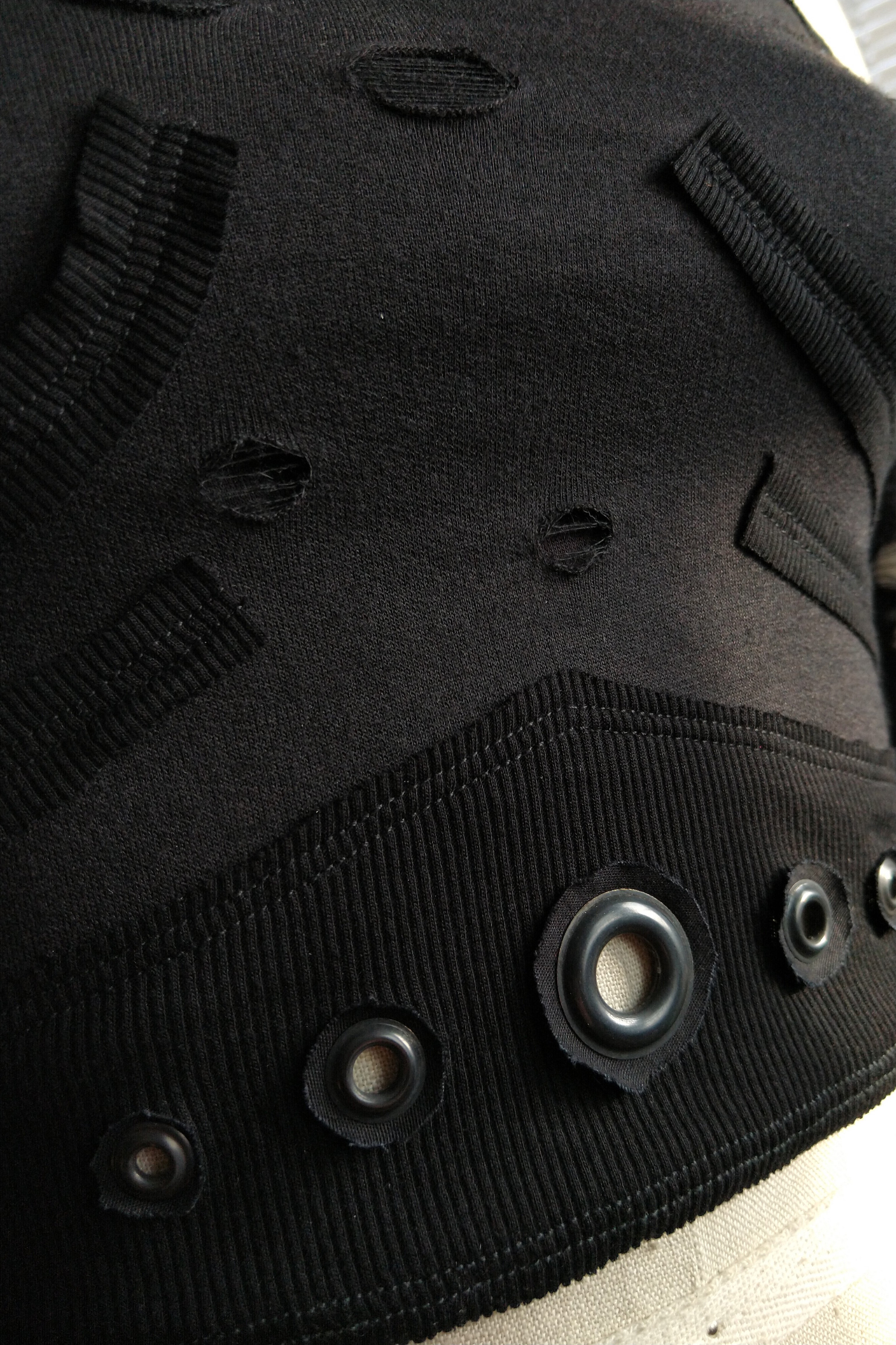 Dystopian halter top top made from distressed french terry with raw edge ribbed contrast. Black metal D-ring at center front neck with baby rivets at the sleeve seams and multi sized grommets at the waist.