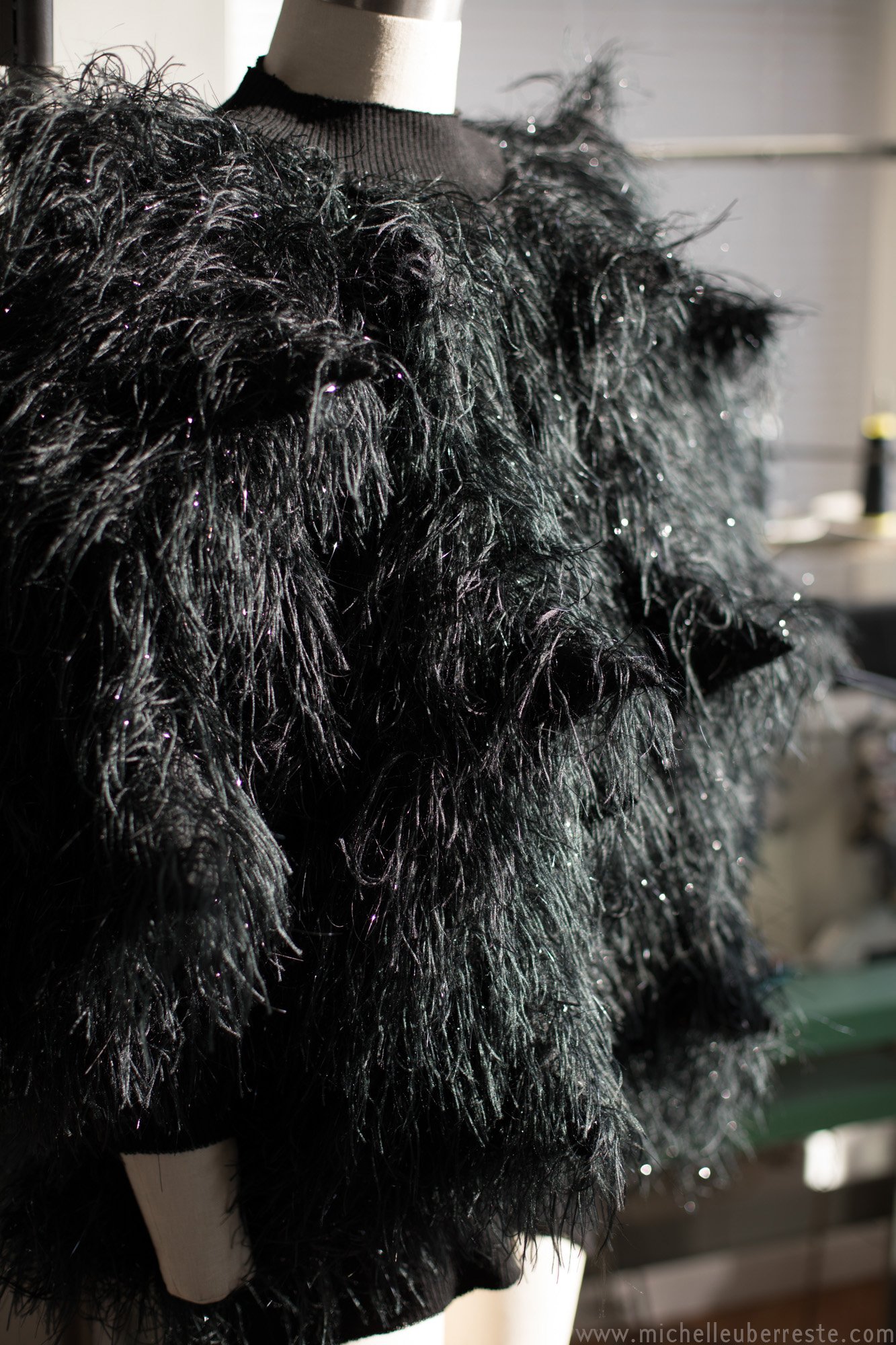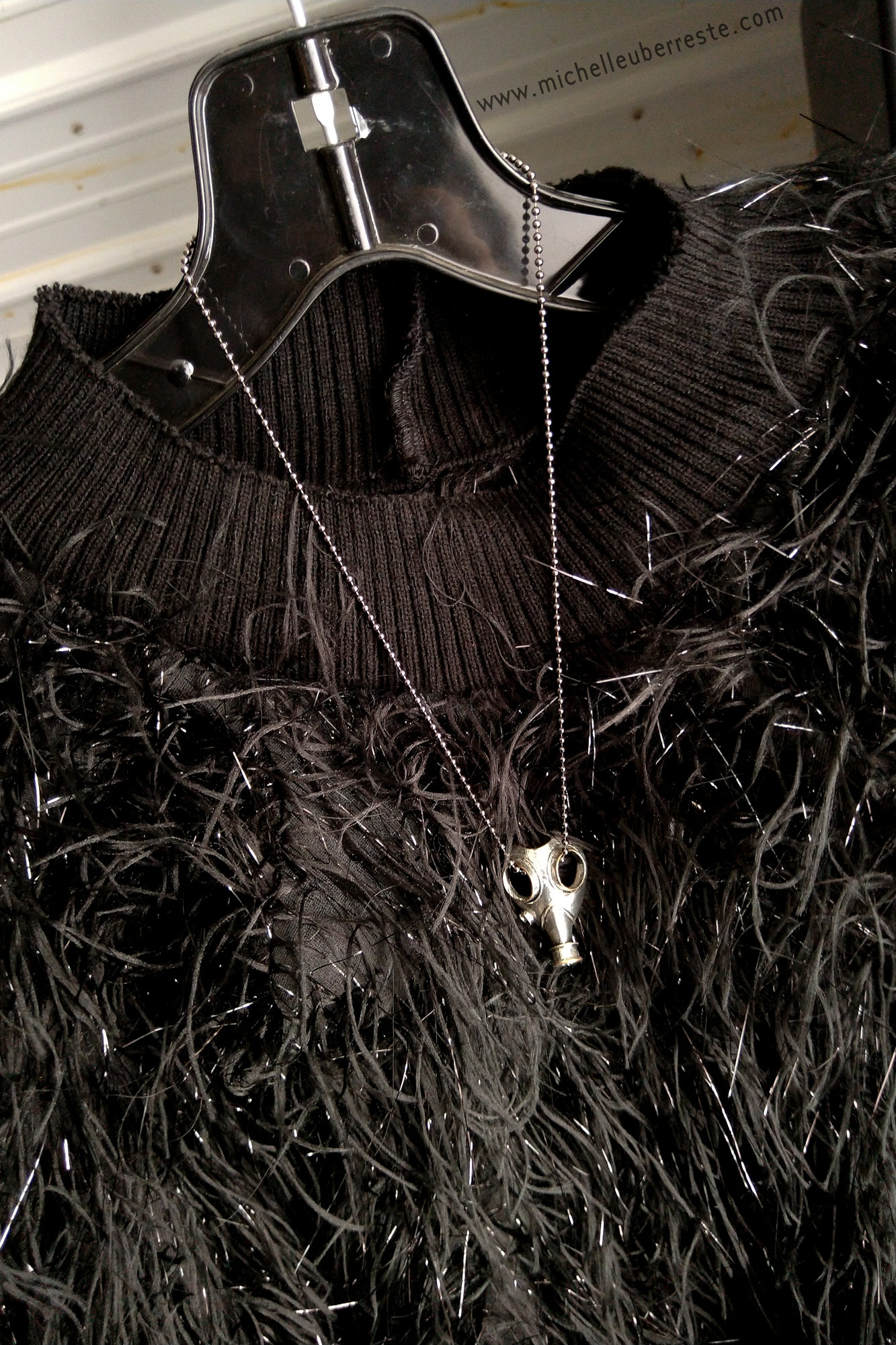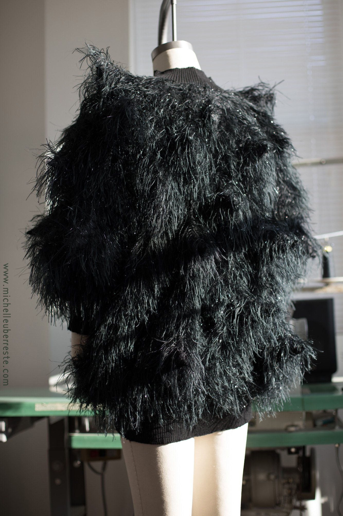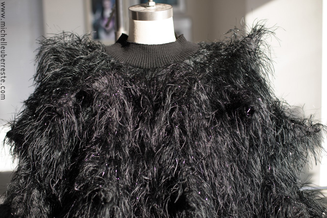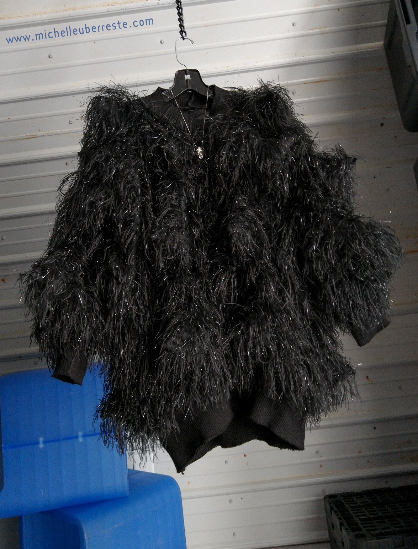 ONE OF A KIND oversized "sweater" with 34 huge "spikes" cut and sewn right into the fabric! Made from almost 5 yards of black tinsel eyelash material, countless scraps of tulle to stuff the spikes (yes they are soft!), and raw ribbed trim repurposed from a thrifted jacket. Despite all that, it only weighs just a little over a pound.