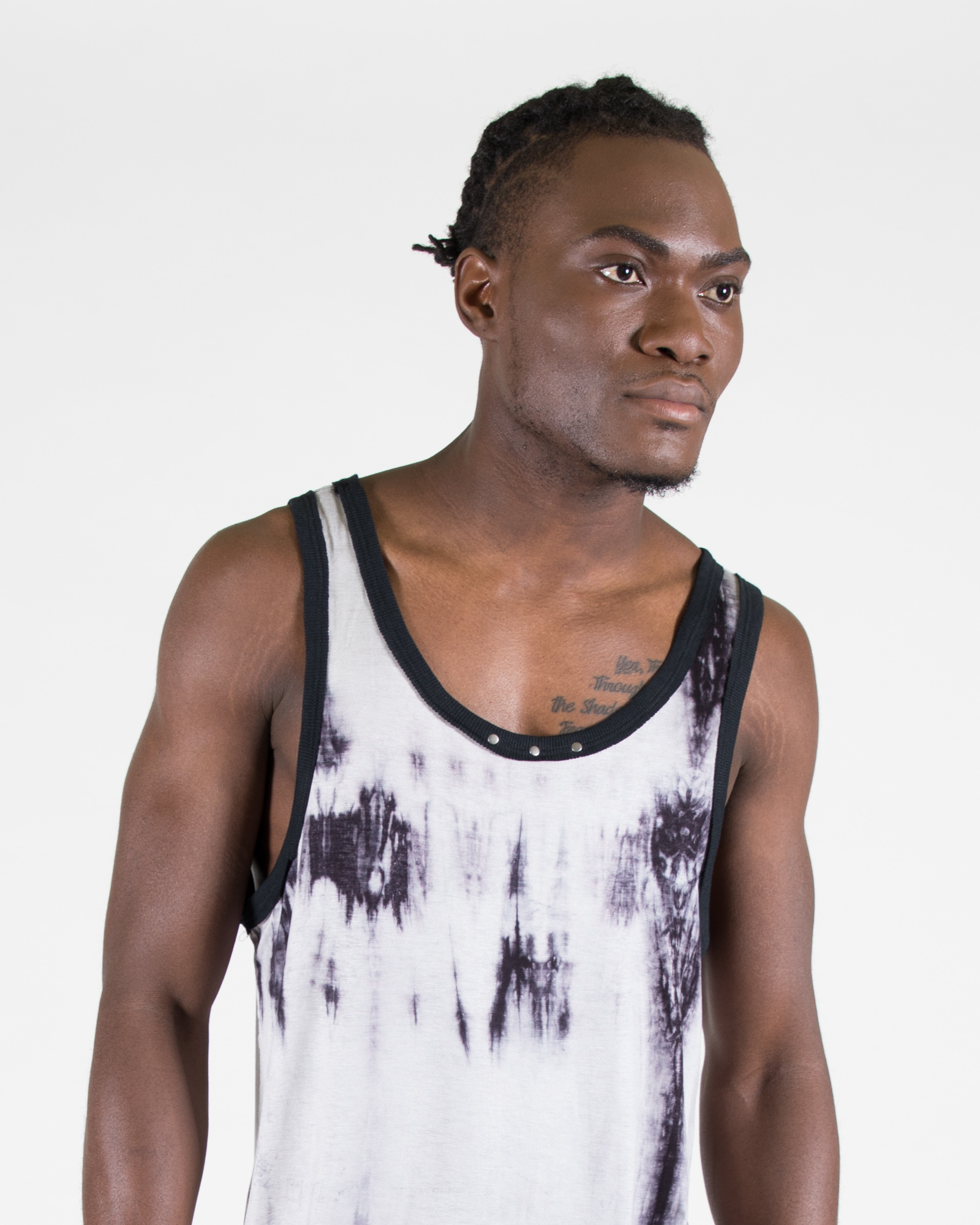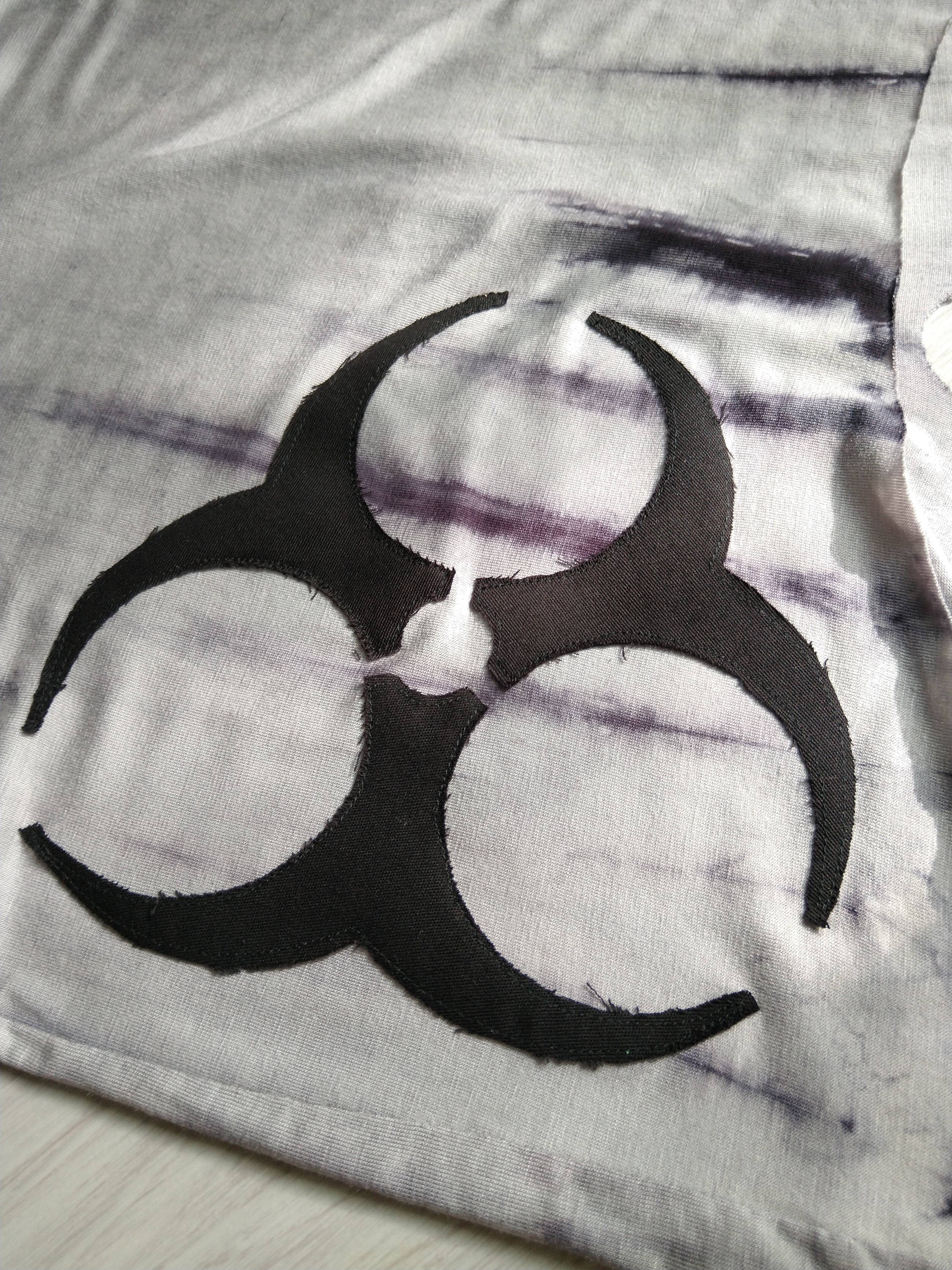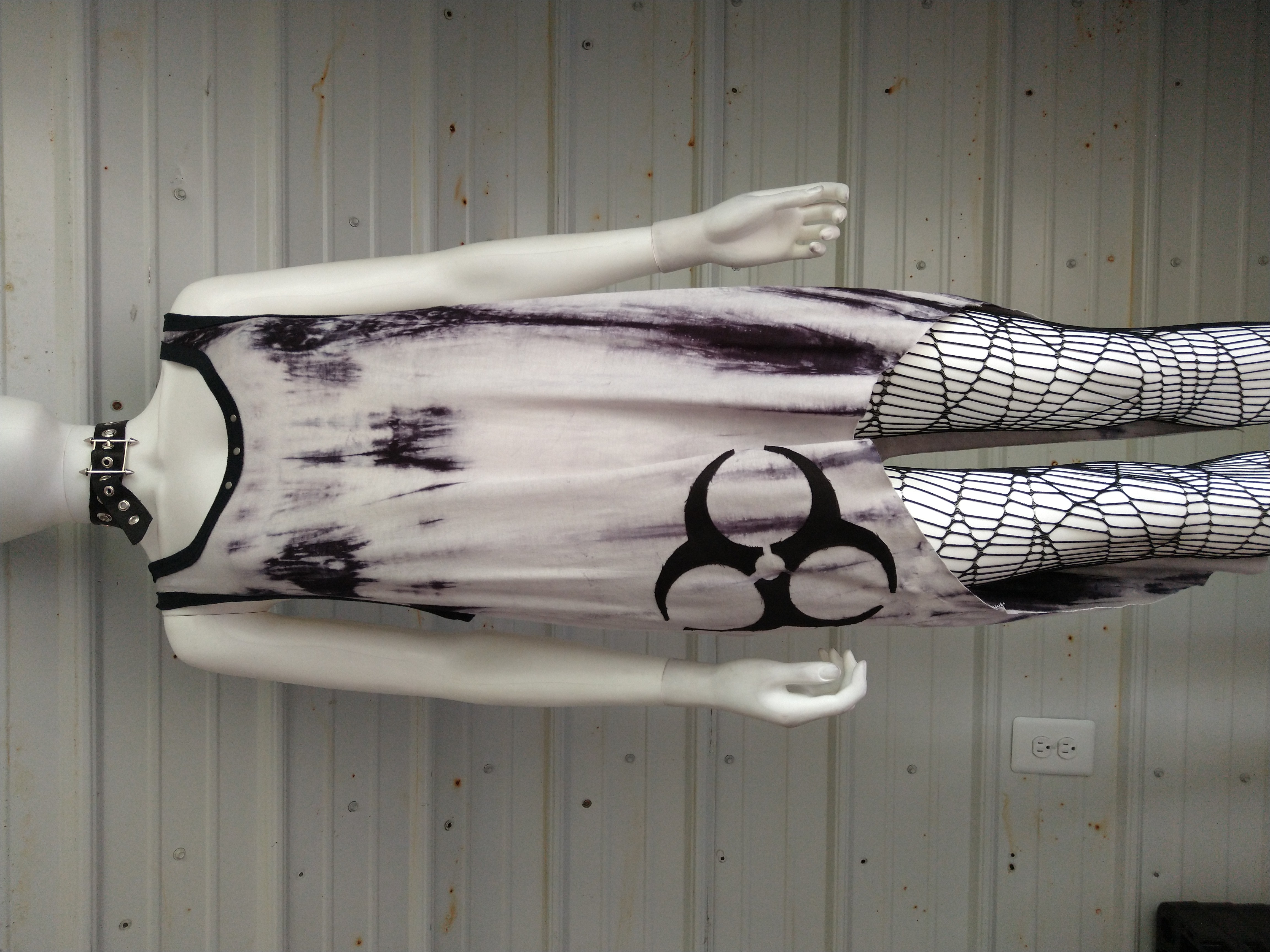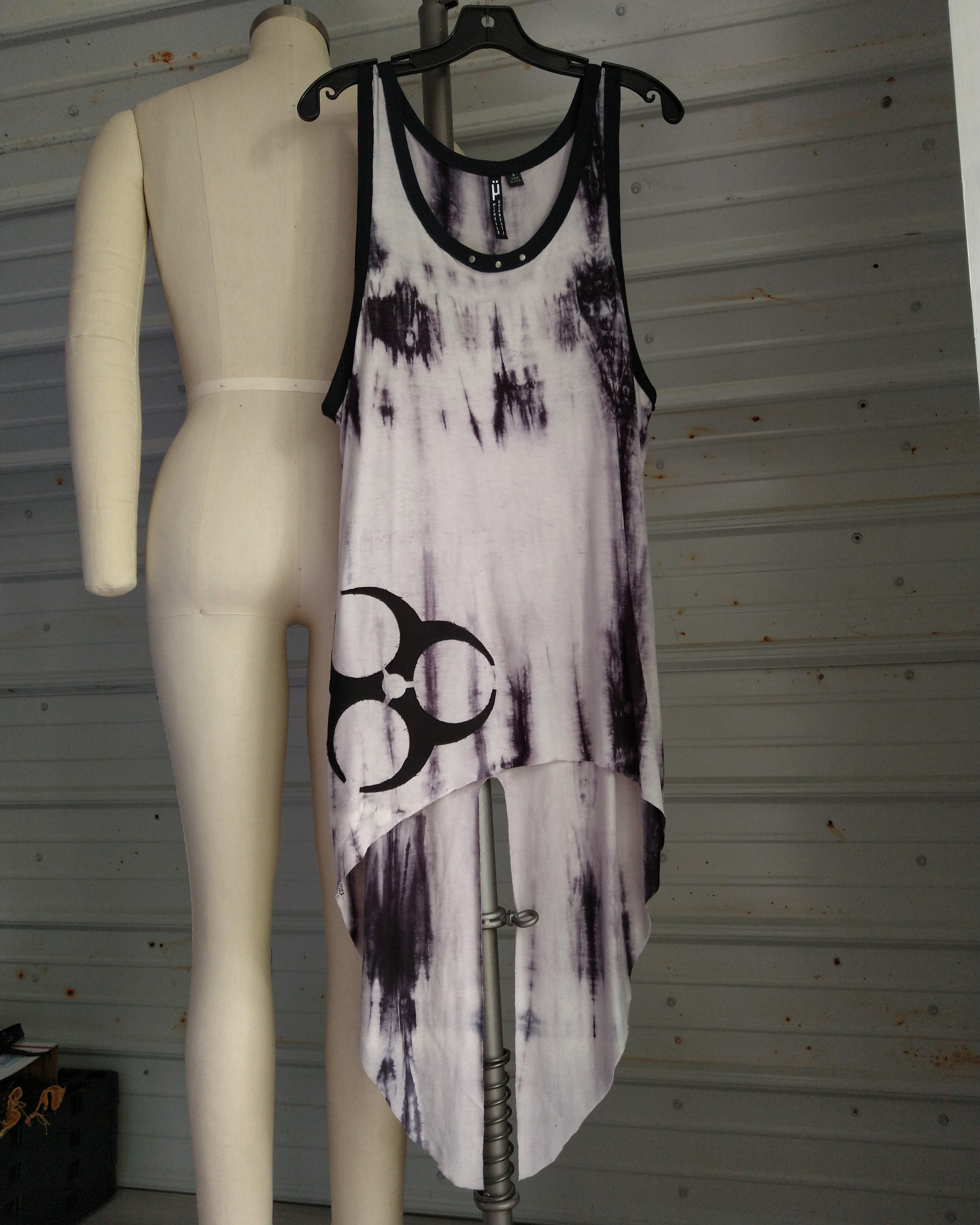 One of a kind unisex tank with long tails in the back. Made from super soft tie dyed jersey with raw edge ribbed binding, baby rivets, and twill biohazard symbol stitched on the lower front side.