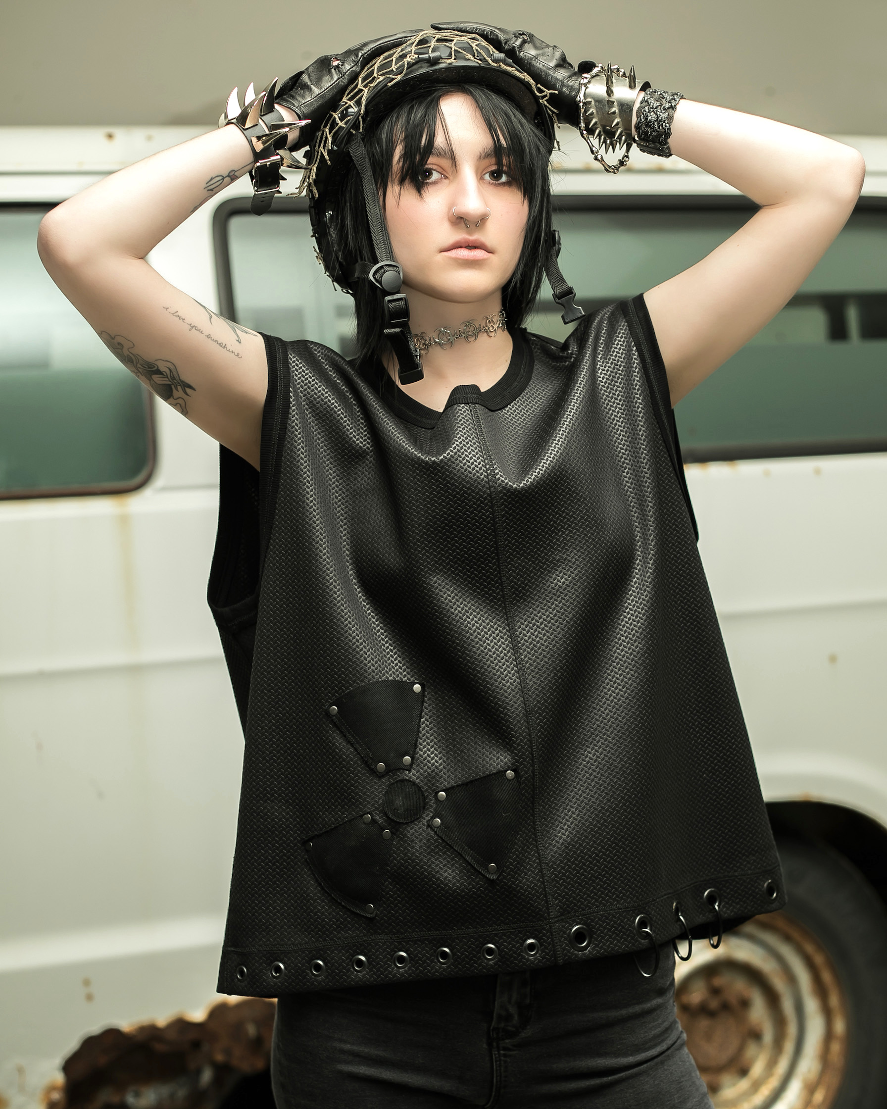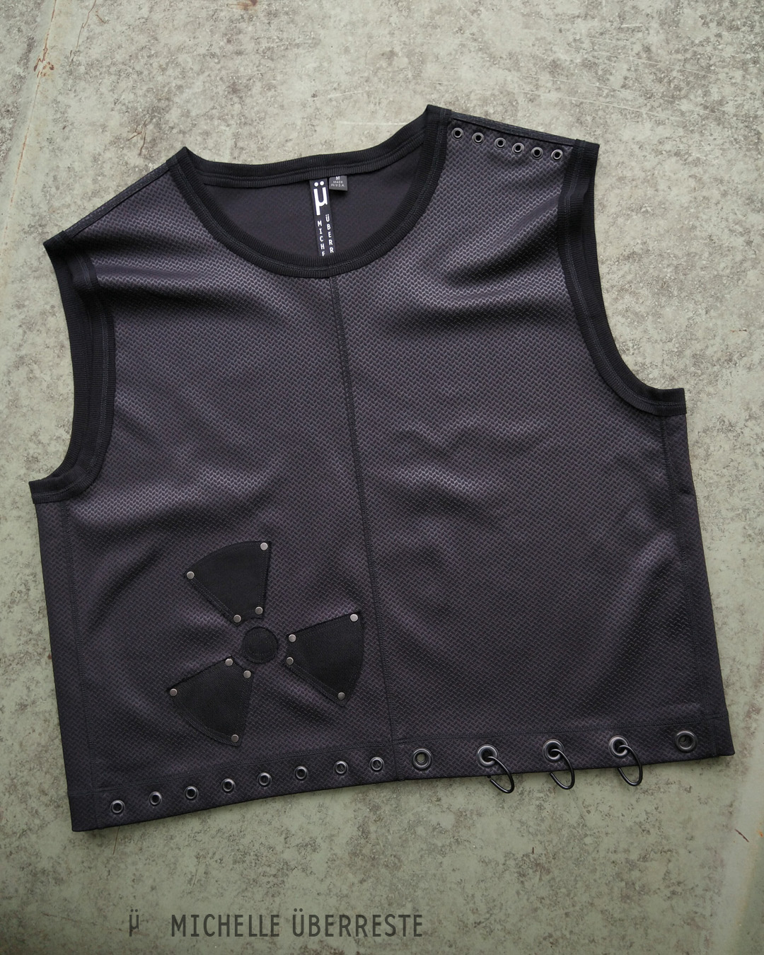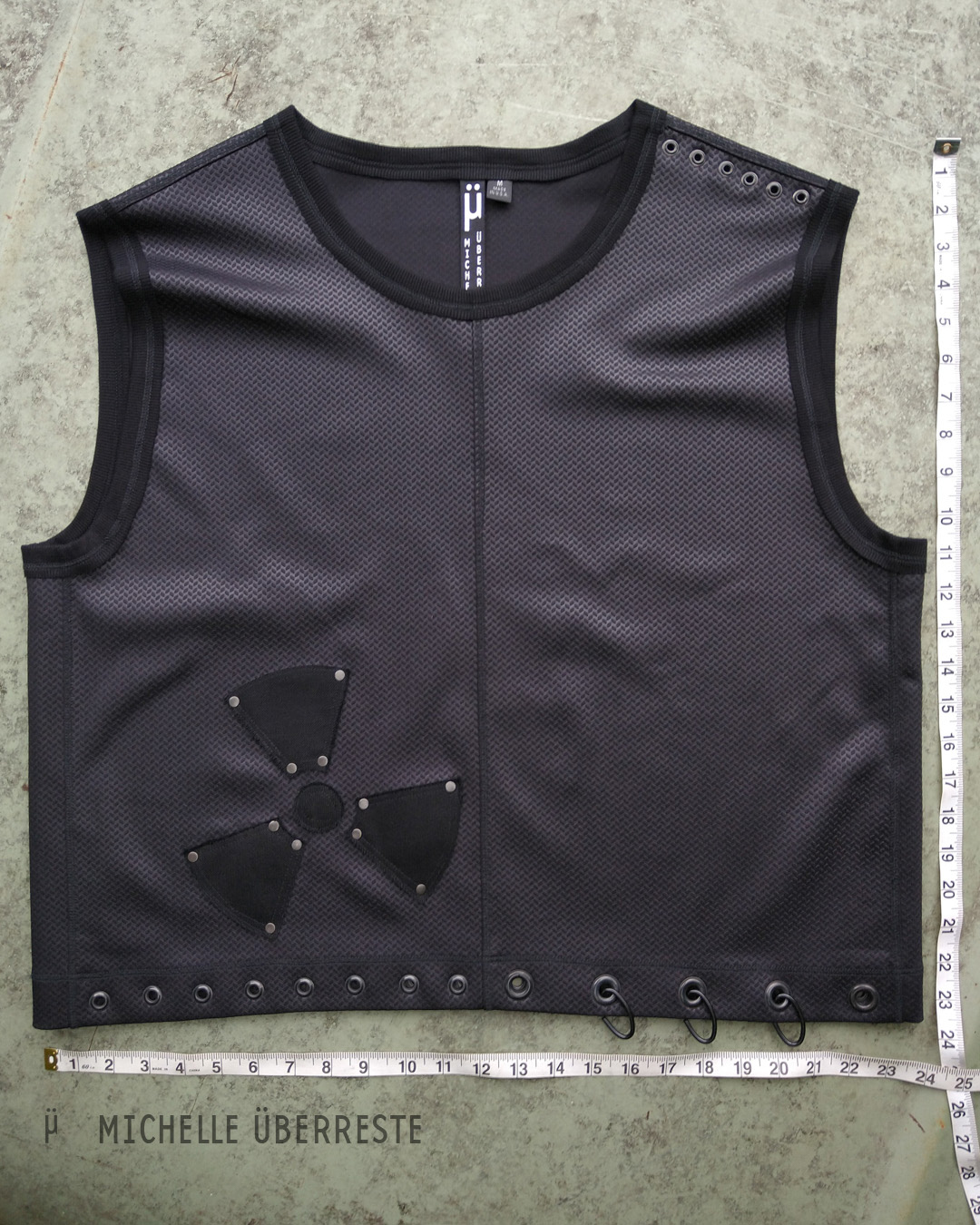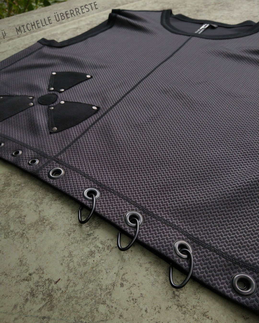 One of a kind oversized unisex muscle tee made from embossed scuba fabric (much thicker than a regular t-shirt!) with raw edge ribbed binding, reverse coverstitch detail, and radioactive symbol on the front in black denim with metal rivets. The hem is trimmed with black metal grommets and 3 industrial chain links. Grommets along the wearer's left shoulder.
