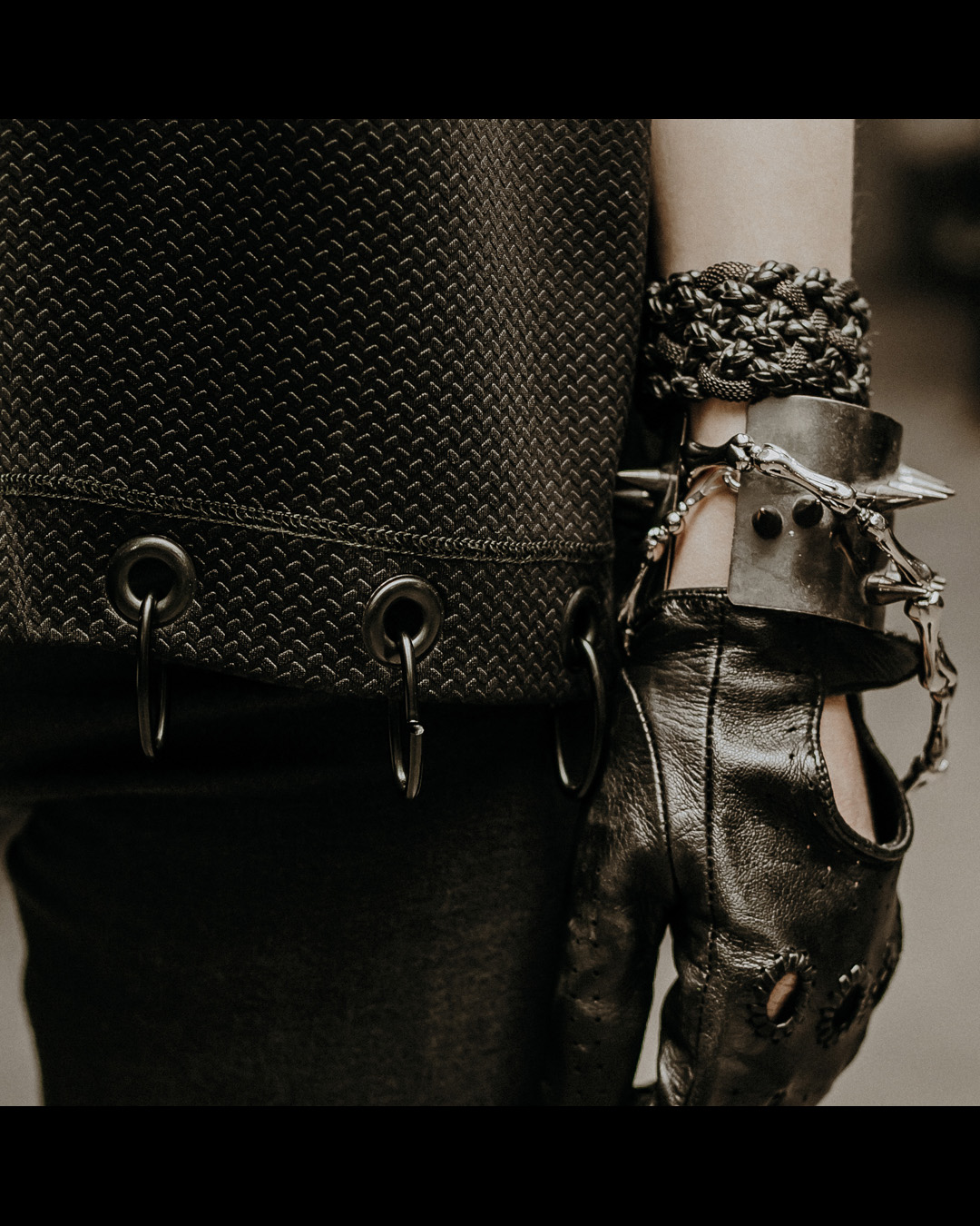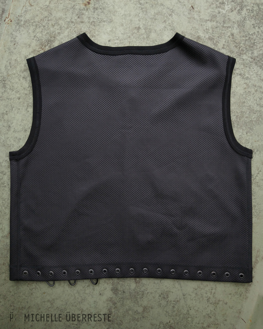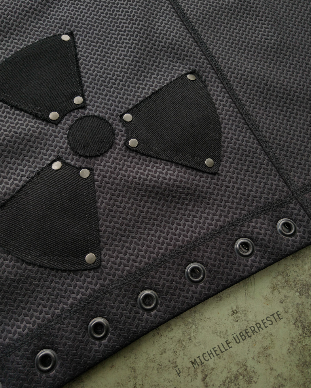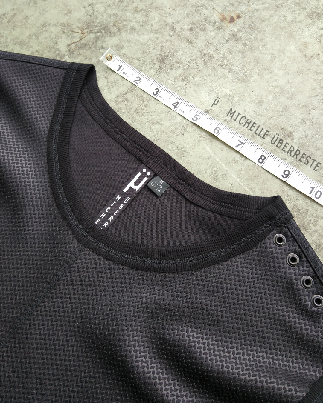 One of a kind oversized unisex muscle tee made from embossed scuba fabric (much thicker than a regular t-shirt!) with raw edge ribbed binding, reverse coverstitch detail, and radioactive symbol on the front in black denim with metal rivets. The hem is trimmed with black metal grommets and 3 industrial chain links. Grommets along the wearer's left shoulder.
