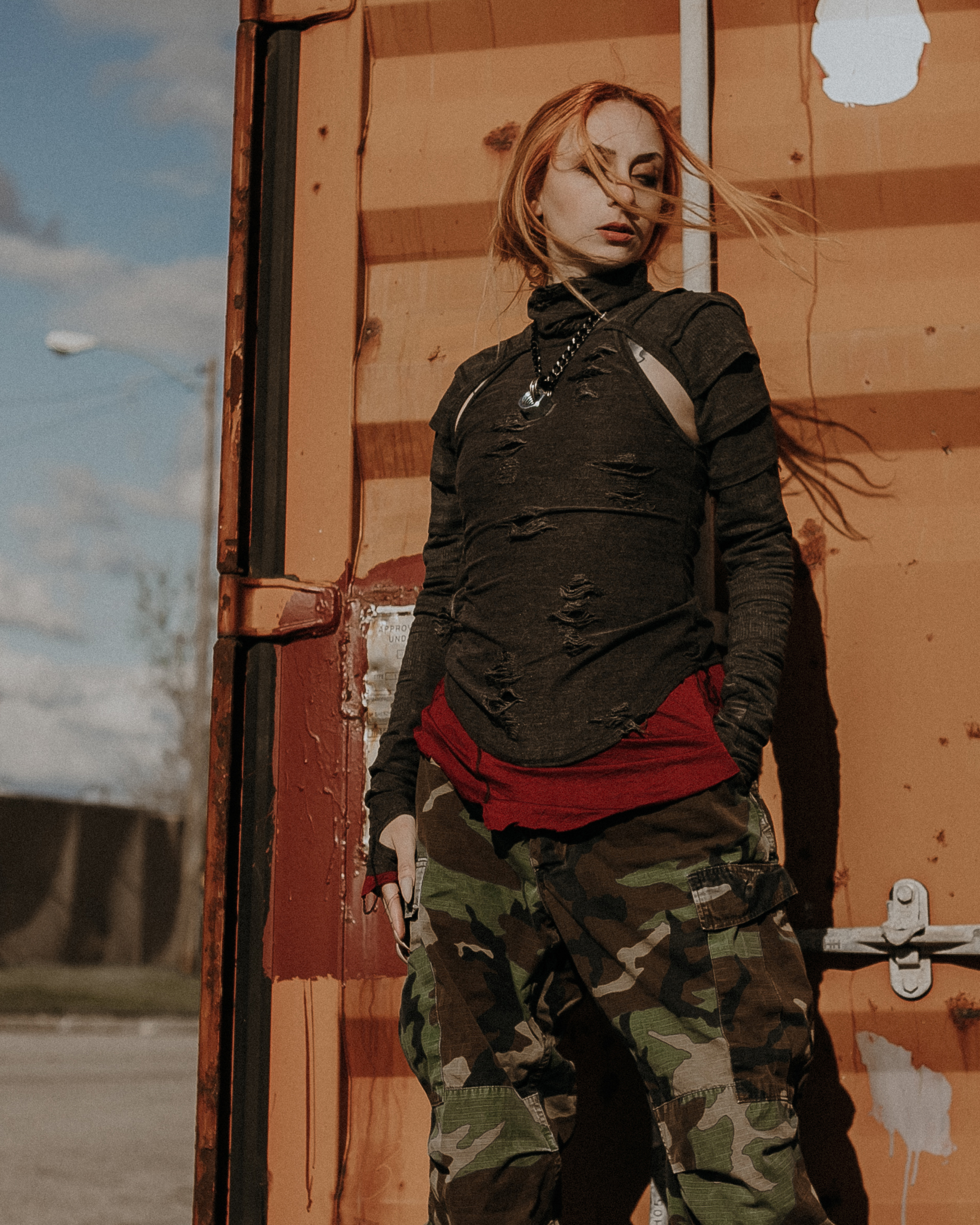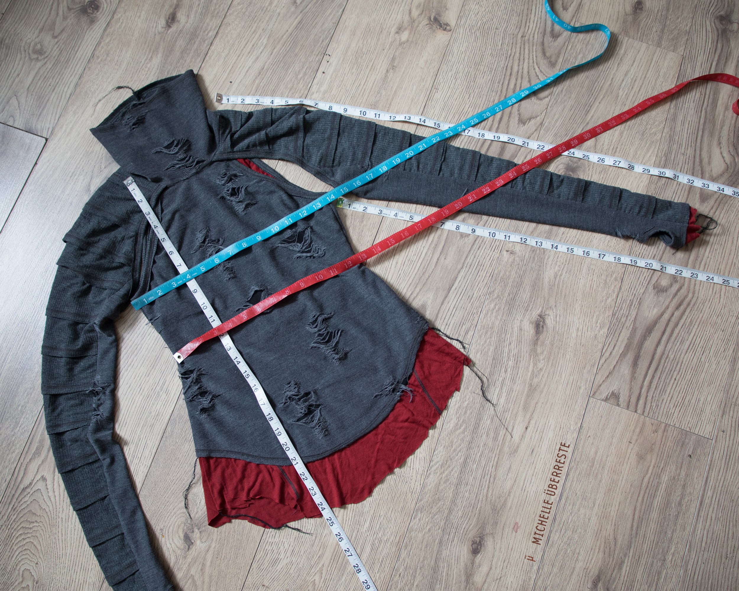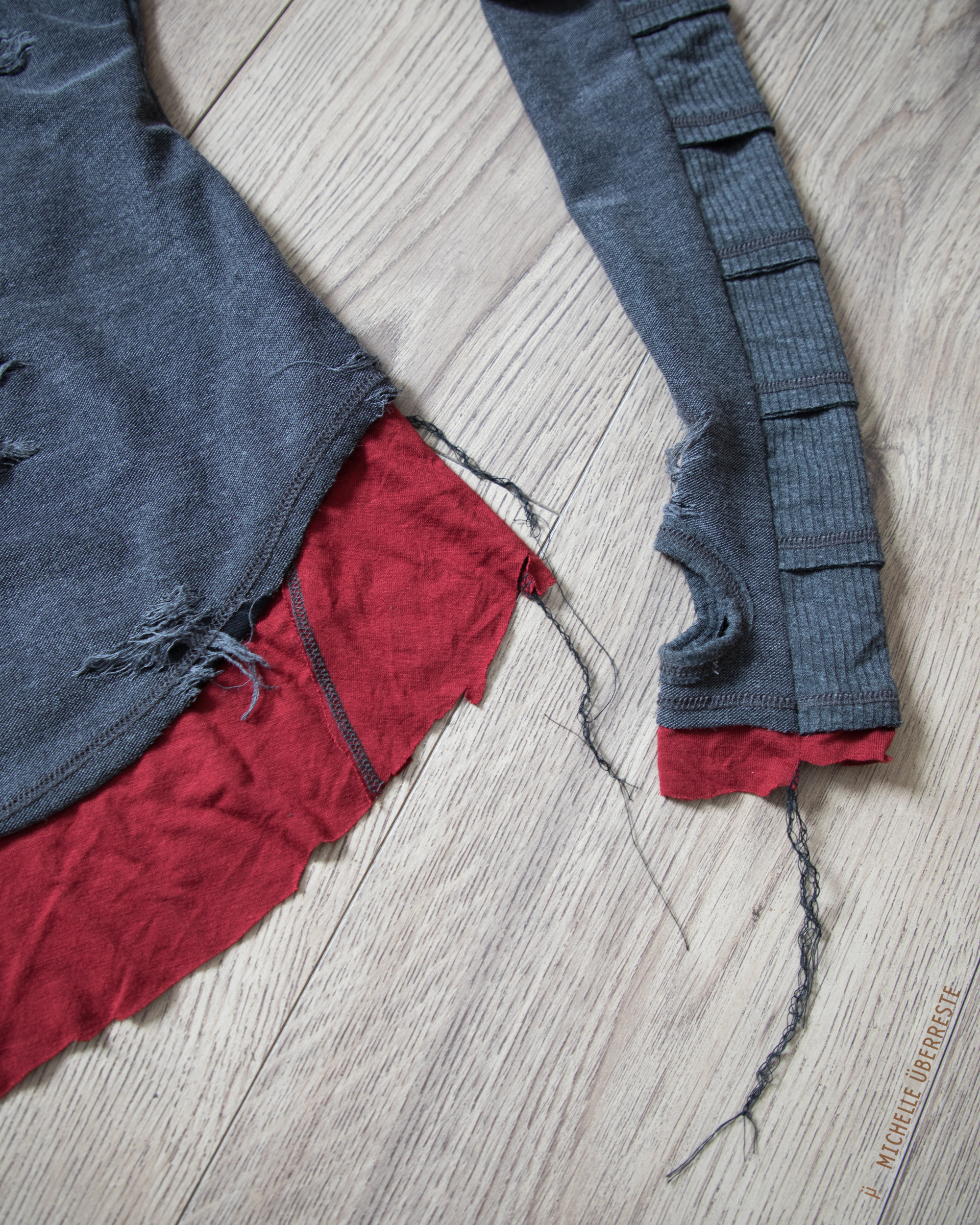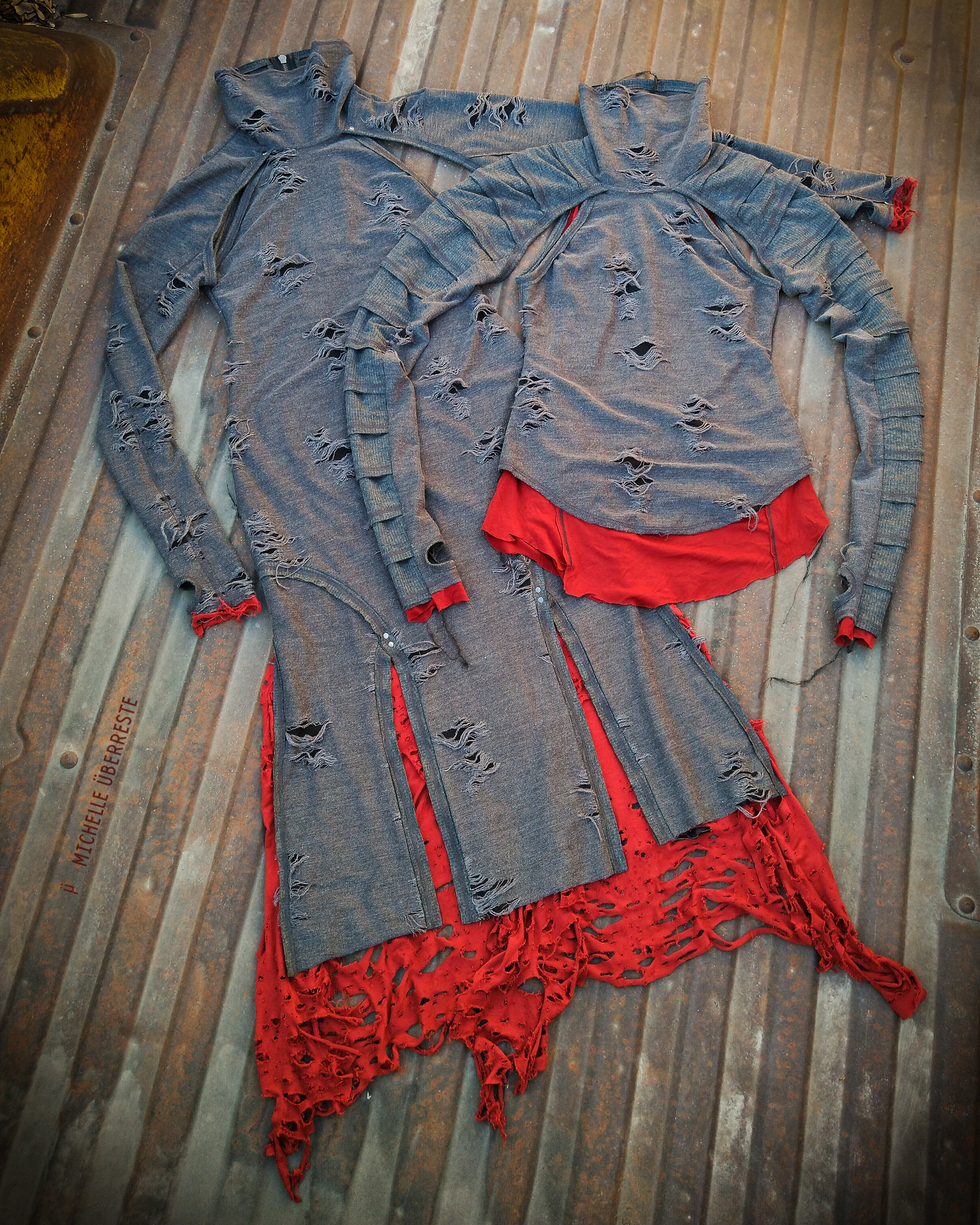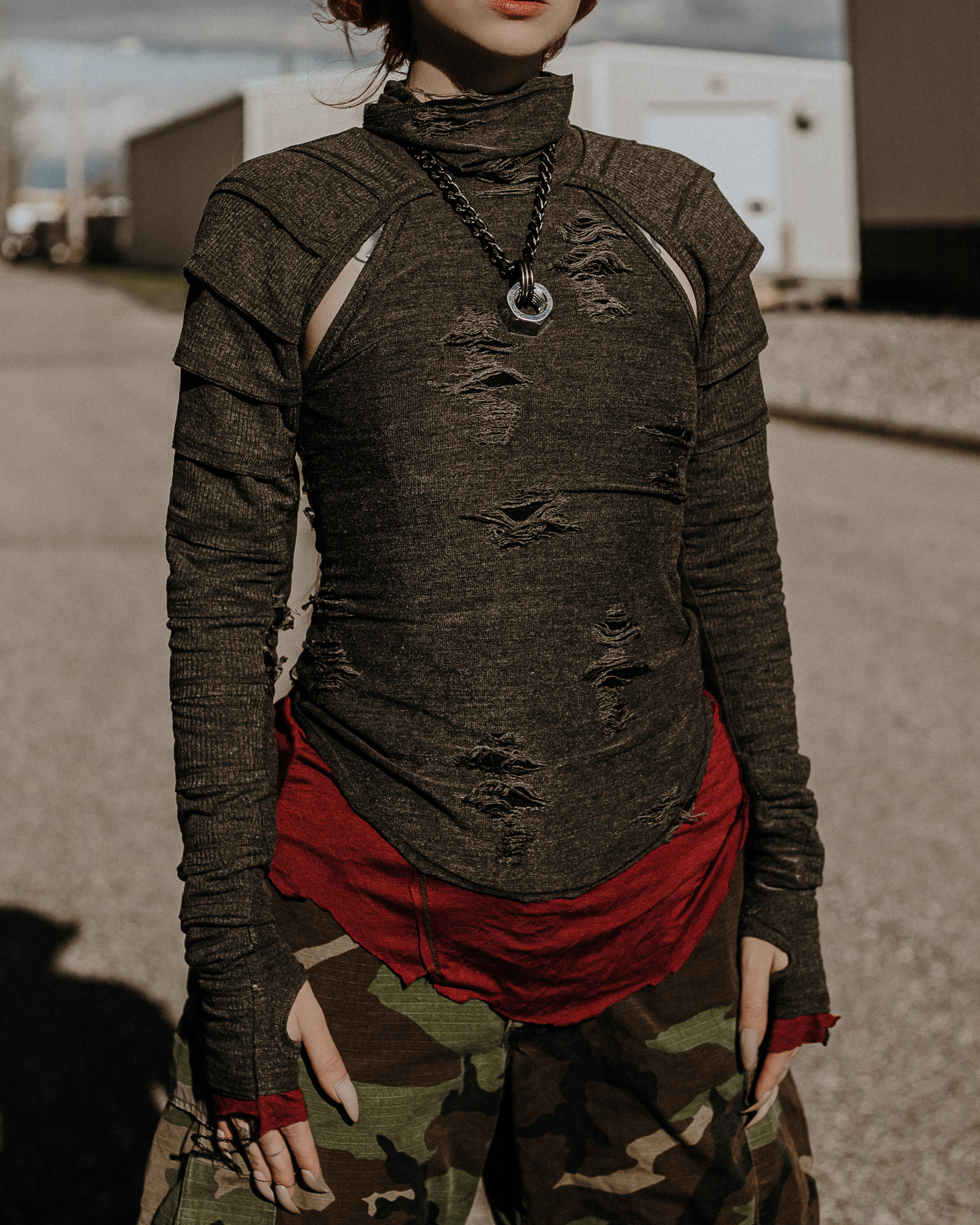 ONE OF A KIND top with "armor" detailed sleeves and cowl neck. Made from "destroyed" gray knit fabric with blood red lining that seems to seep out from underneath the top layer. Lots of raw edges and reverse cover-stitch detail. Lining and binding fabrics cut from pieces of sample fabrics I salvaged from a company that was going out of business.