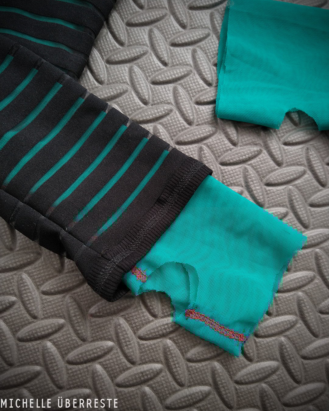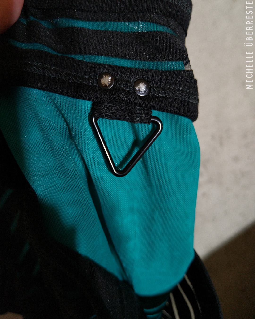 One of a kind layered shrug made from alternating sheer+opaque stripe overlay with teal, raw edged mesh peeking out from underneath with contrast thread in bright red. Reversed coverstitch on ribbed binding with scratched metal rivets + triangle rings on both sleeves.