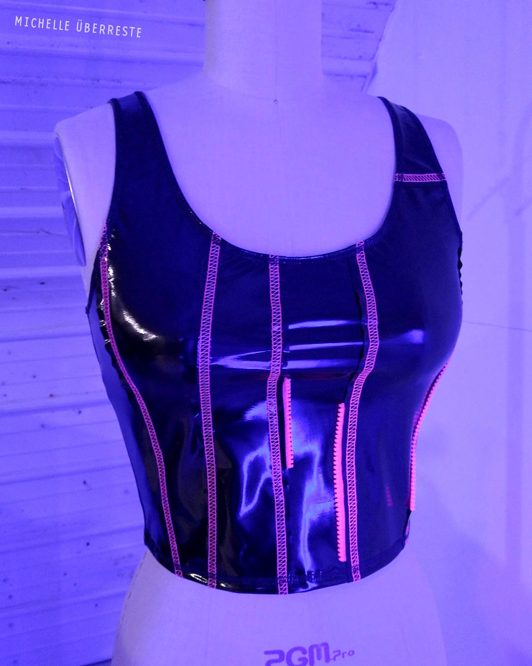One of a kind crop top made from 4-way stretch PVC scraps leftover from our INTRIGUE collection! Neon pink, UV reactive contrast stitching. Black-light reactive zipper scraps leftover from other random projects.
