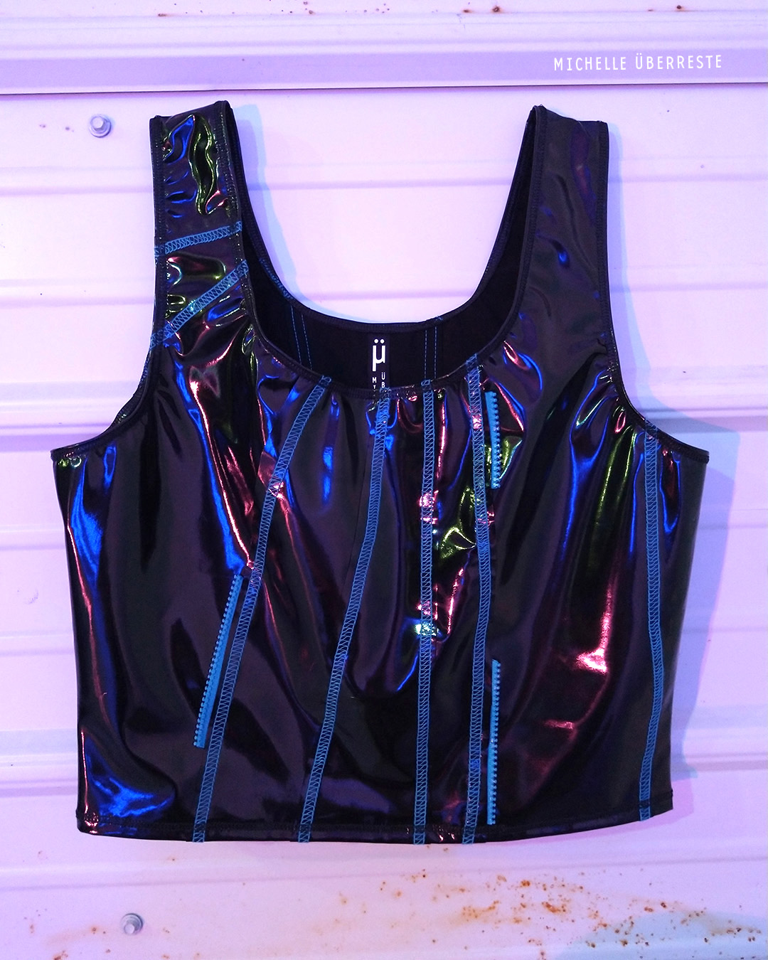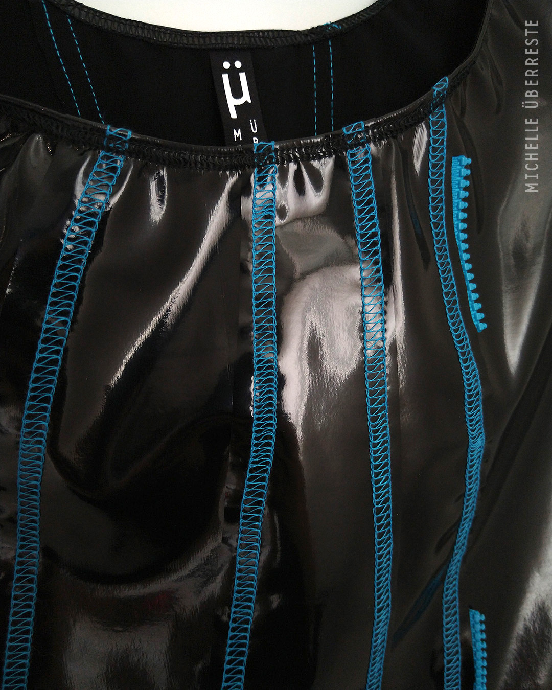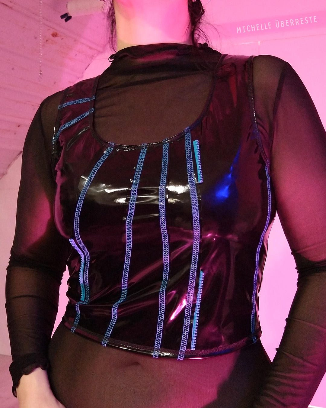 One of a kind crop top made from 4-way stretch PVC scraps leftover from our INTRIGUE collection! Bright blue contrast stitching. Plastic zipper scraps leftover from other random projects.
