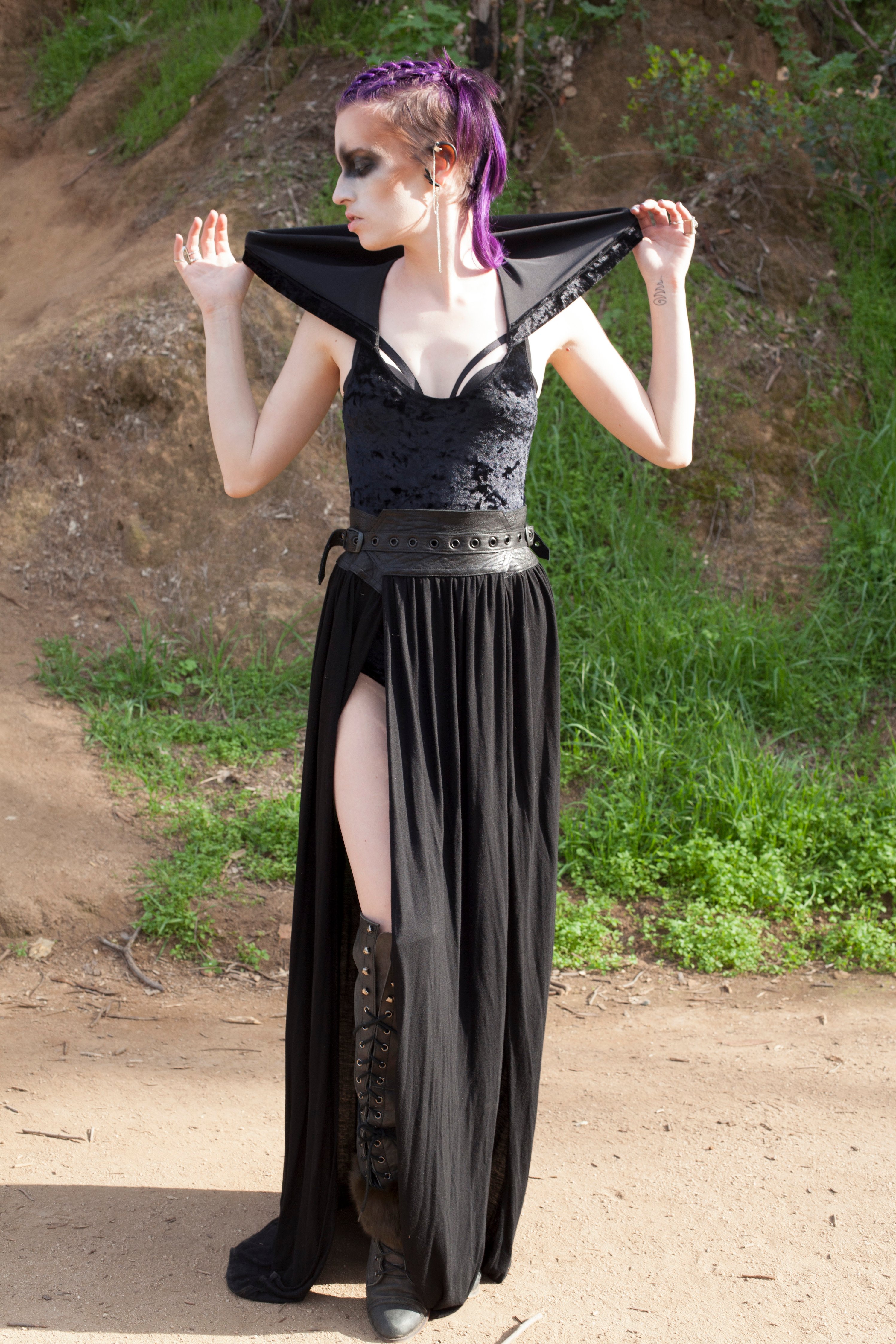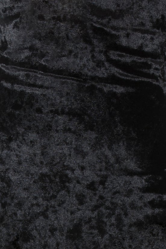 Black crushed velvet bodysuit with oversized hood and racer back. Elasticized legs and armholes, and neck opening.