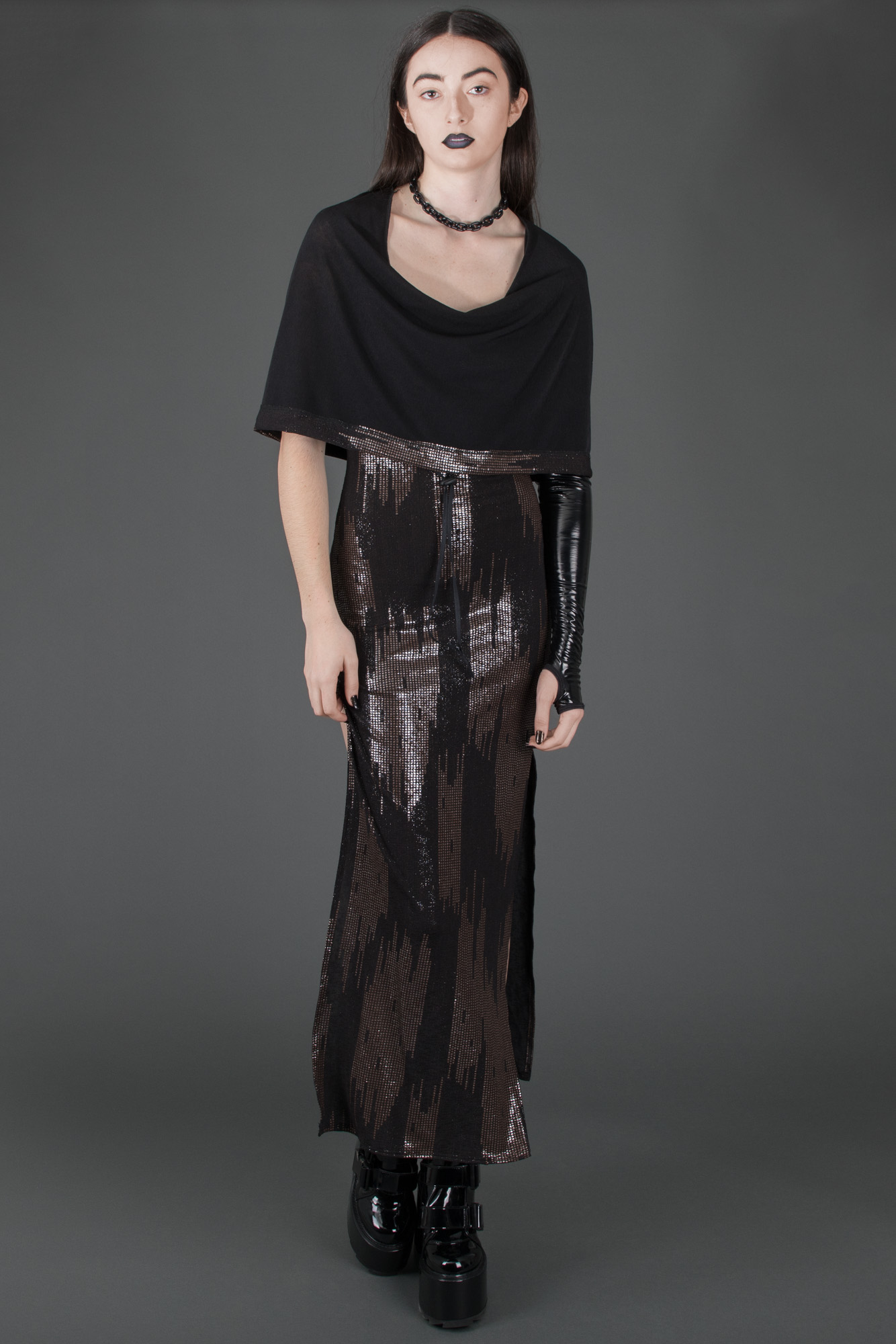 Burnt gold and black dress with open sides and drawstring cowl hood.