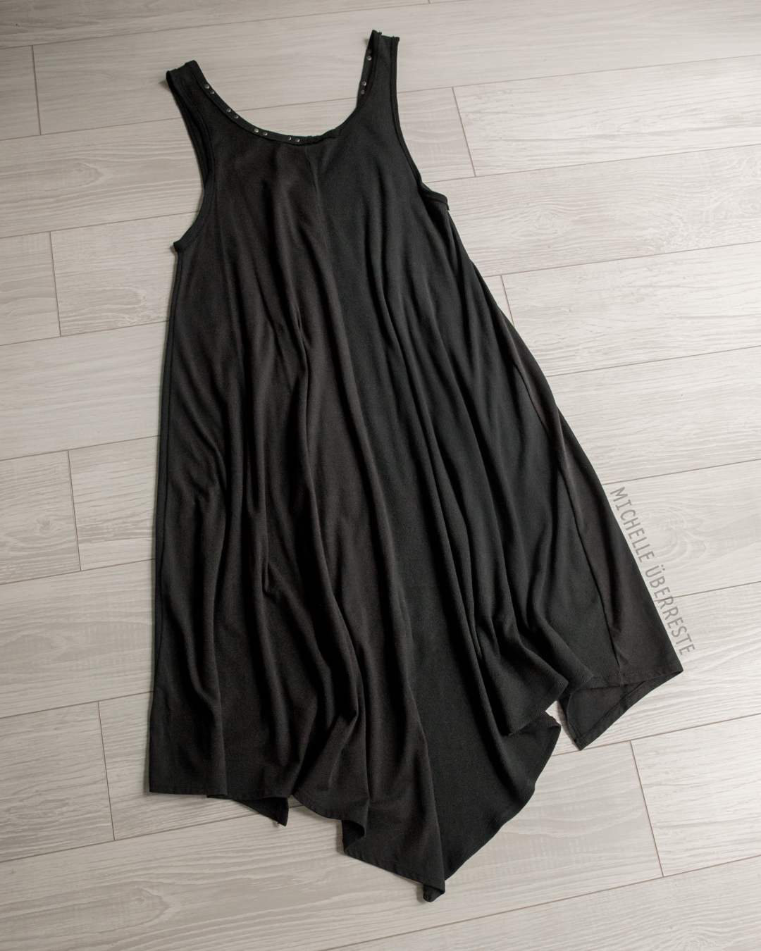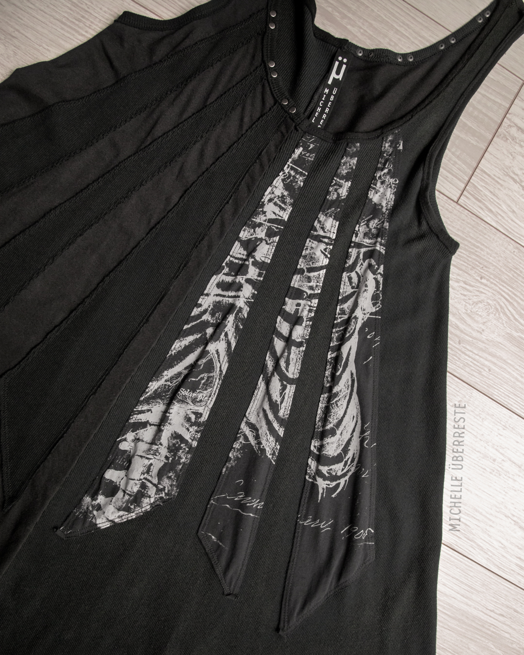 One of a kind dress made from black ribbed fabric, cotton lycra, and trimmed and black metal baby rivets. Skeleton ribcage "autopsy" print. Panel was cut apart, then sewn down and garment washed. Extra long straps. Lots of raw edges.