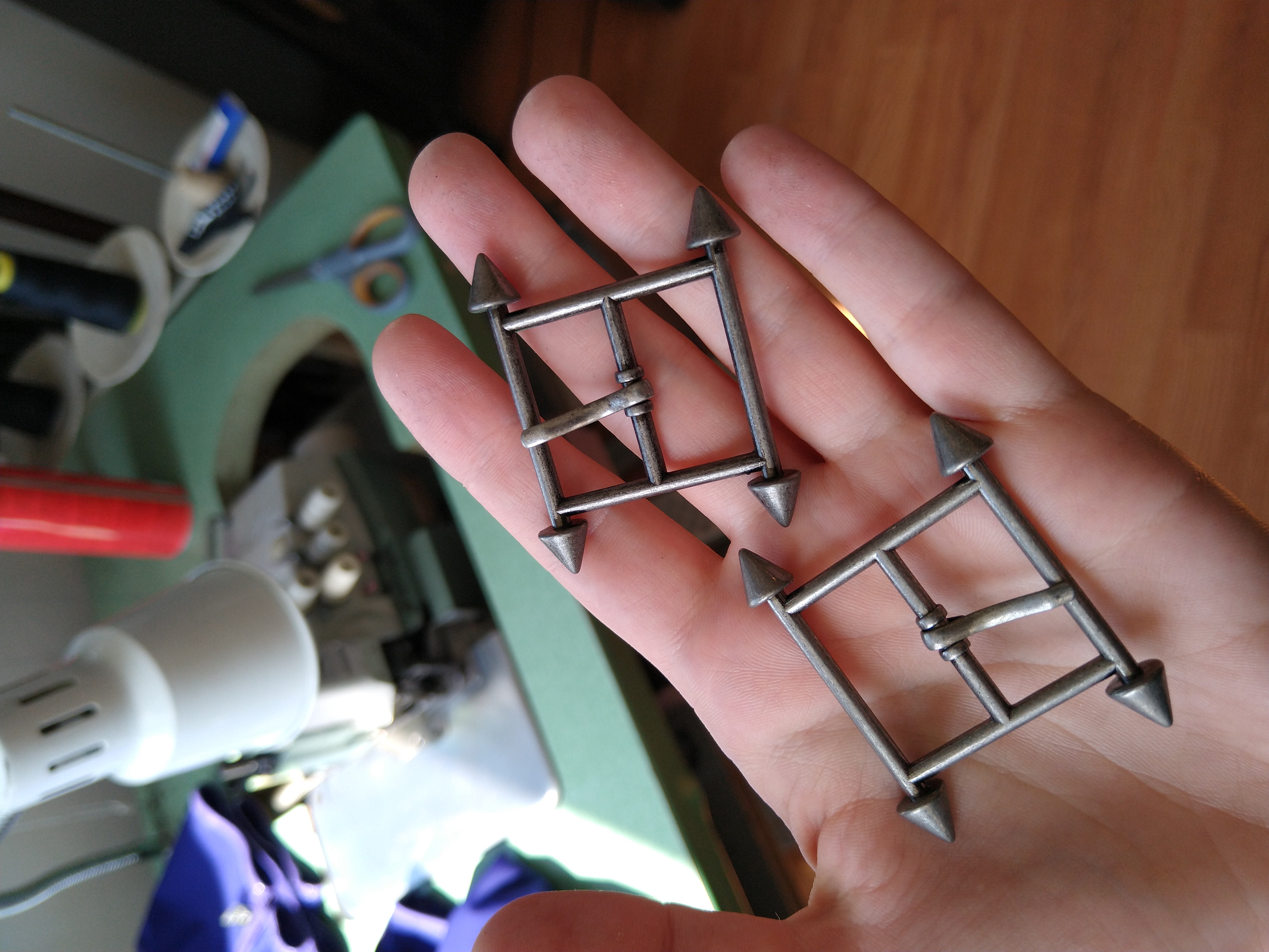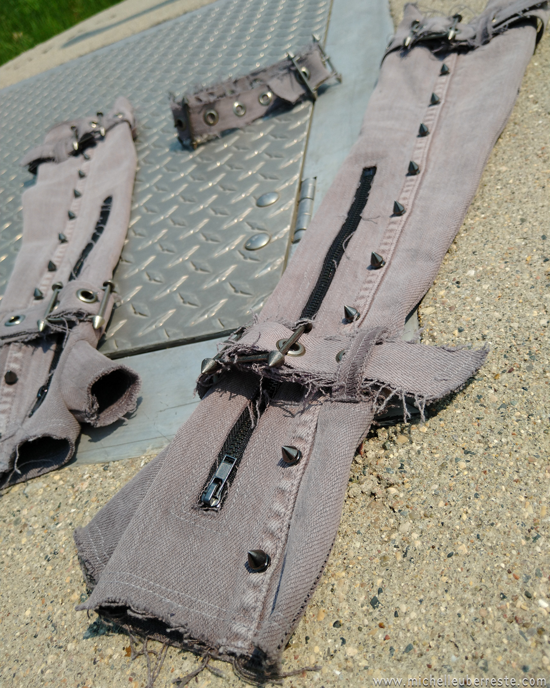One of a kind upcycled gloves + choker set made from an old pair of Forest's jeans. We patched them as many times as they could be patched. Lots of raw edges, attached thumb piece, baby zippers to slim out the wrist, and cinched with adjustable straps at the top and wrist, trimmed with custom spike buckles that Michelle also designed. The front seam is trimmed with a row of matching, dark metal spikes.