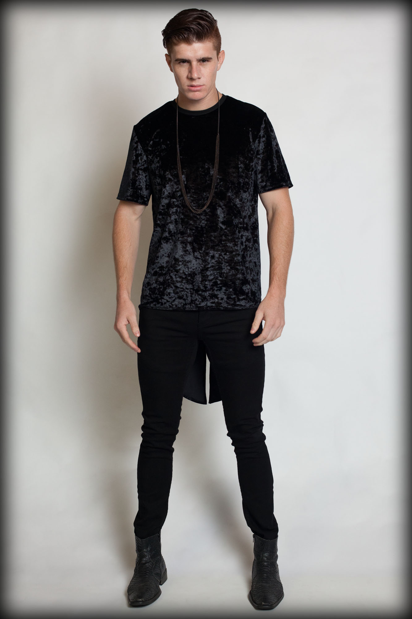 Blacker than the blackest night - this hammered velvet T-shirt is no ordinary tee, with its extravagant tails in the back - you can still be a gentleman and be comfortable at the same time!