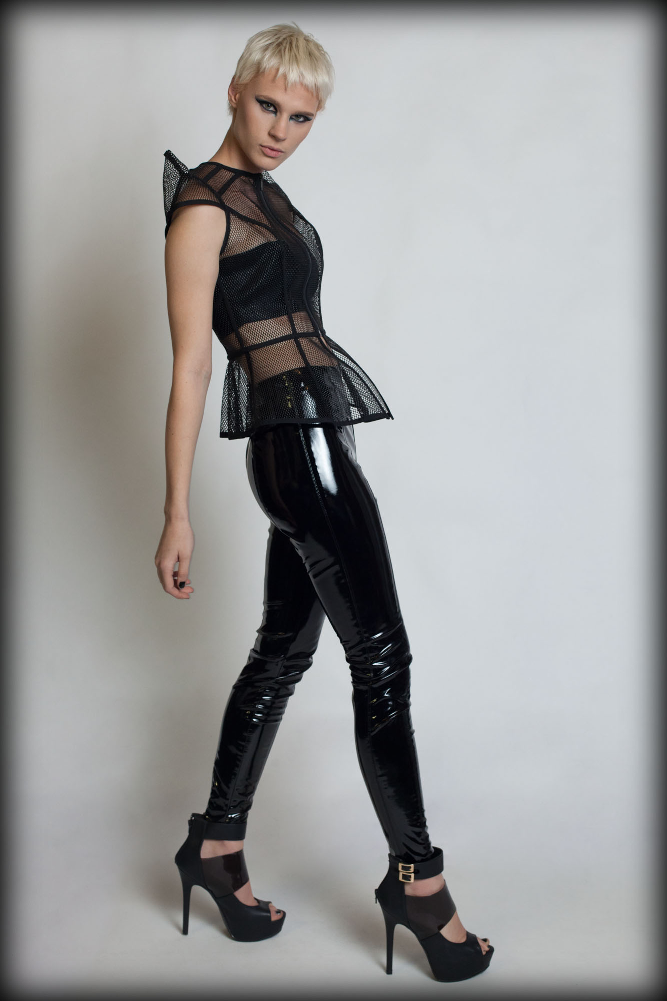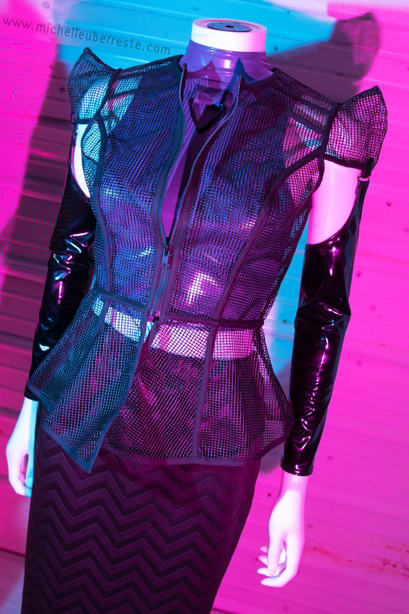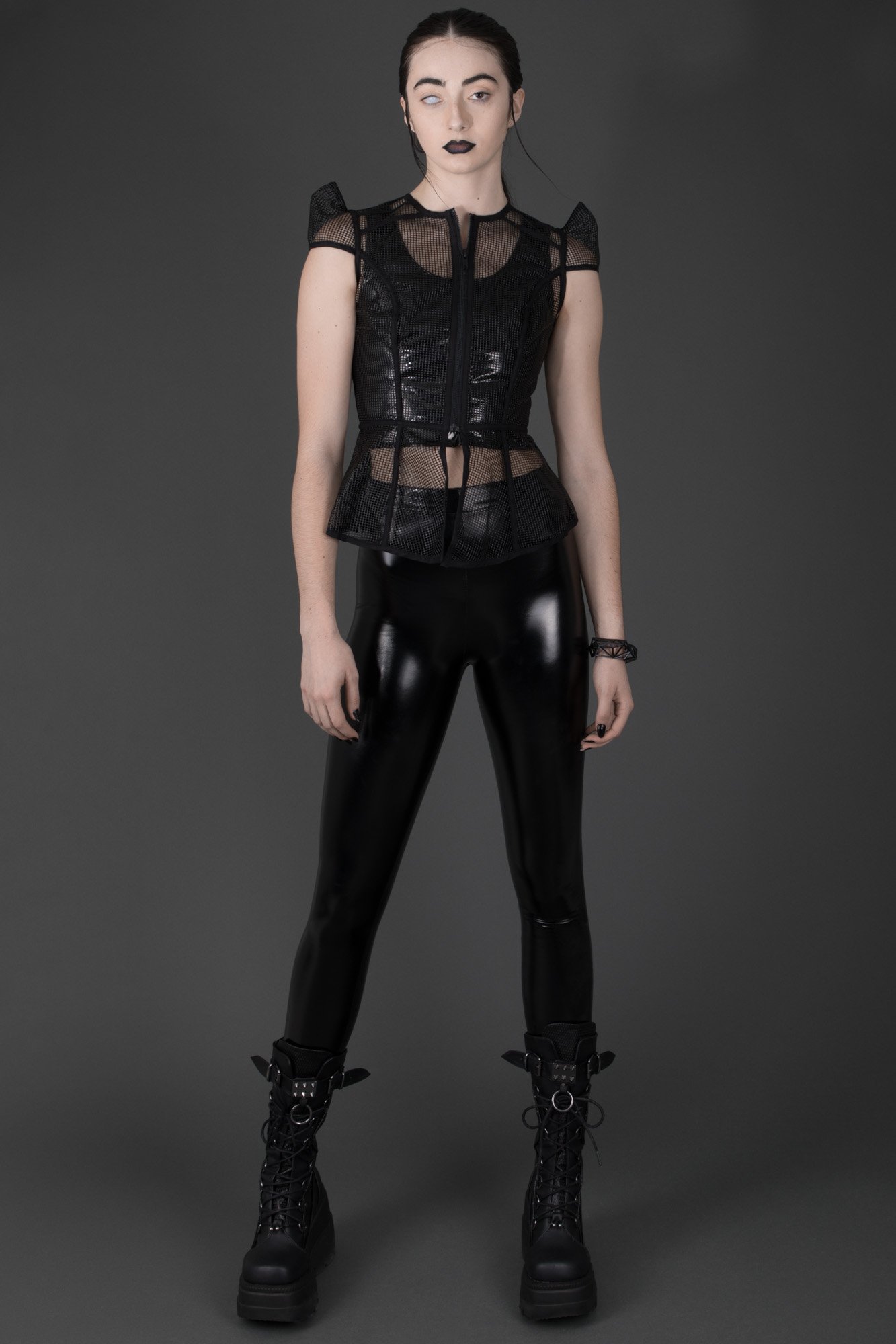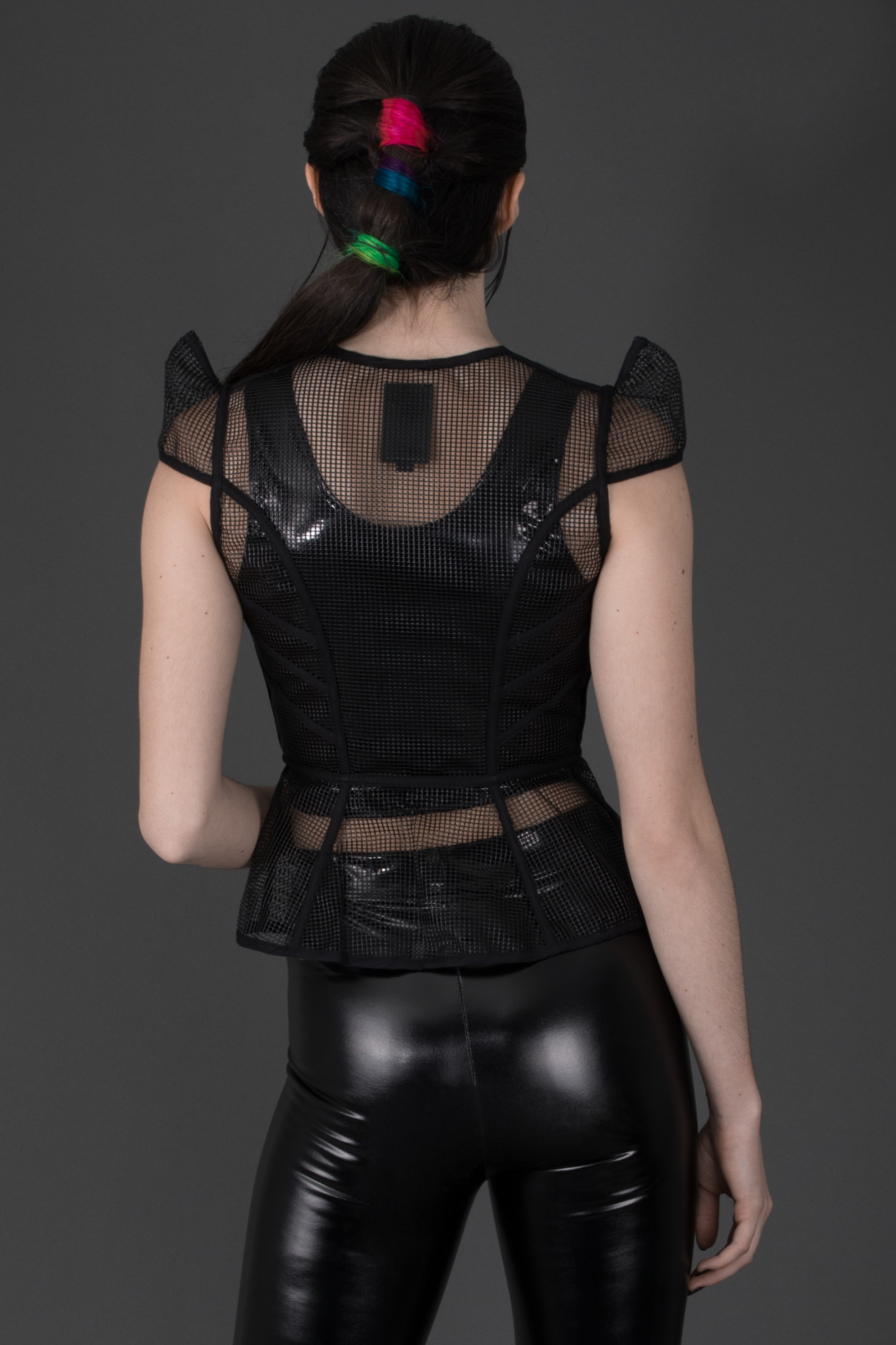 This versatile top is made from a rubber coated open mesh with style lines bound in black cotton tape, pointed shoulders, and black front zip! It can be worn so many different ways with a bodysuit, tank or bandeau! Wear it with white, nude, or neons to compliment the structure!