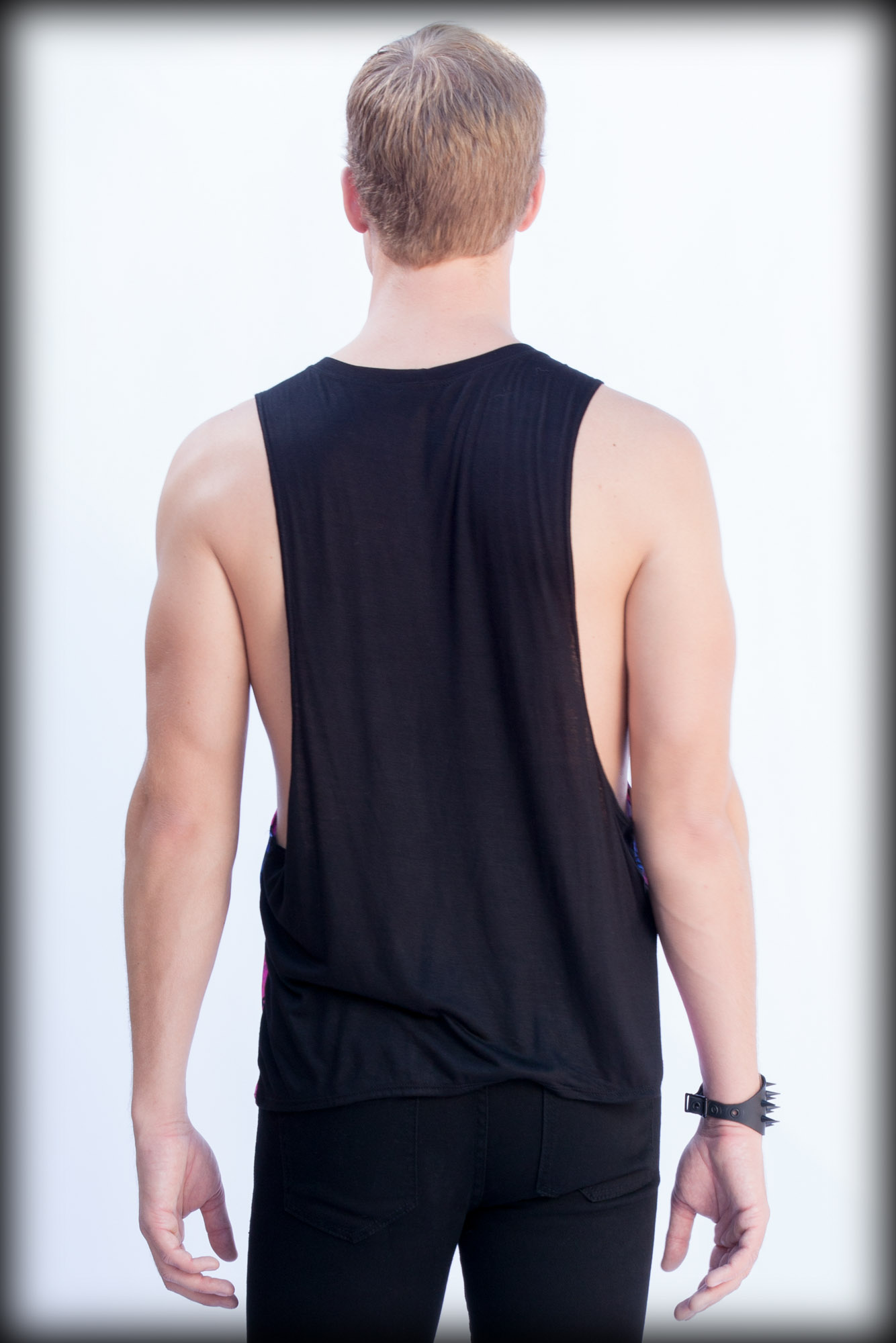 Tank with "hybrid" print in the front and black jersey back panel and neckband with dropped armholes. Great for guys but looks great on girls, too!
