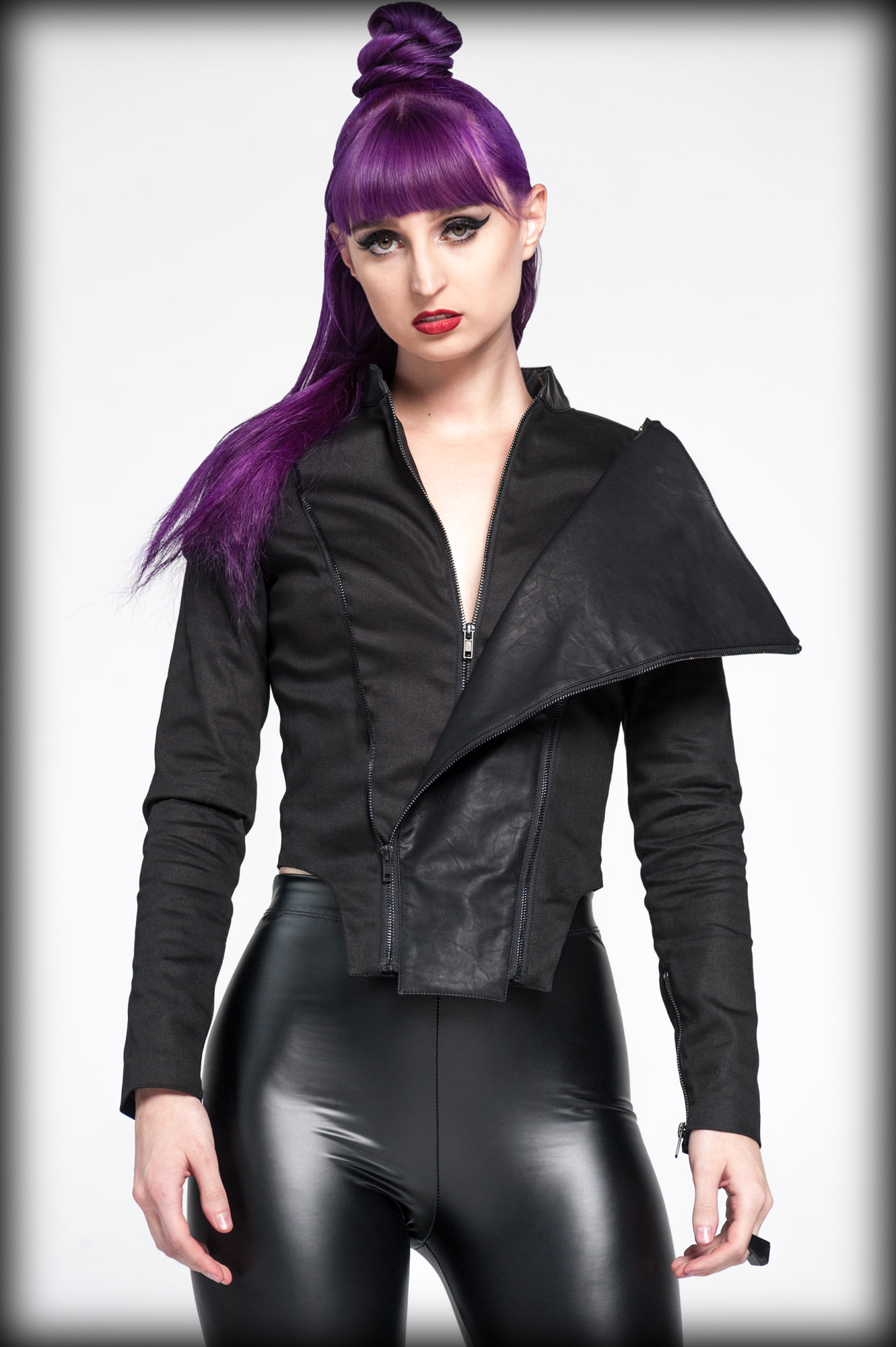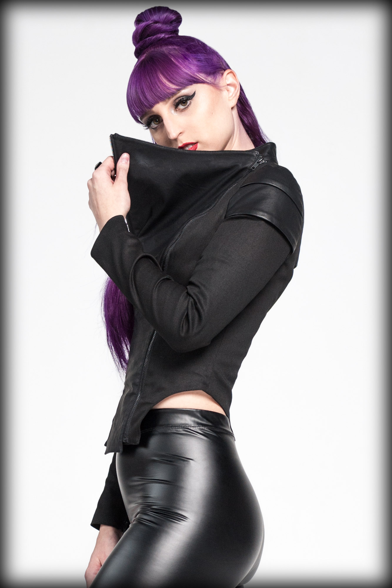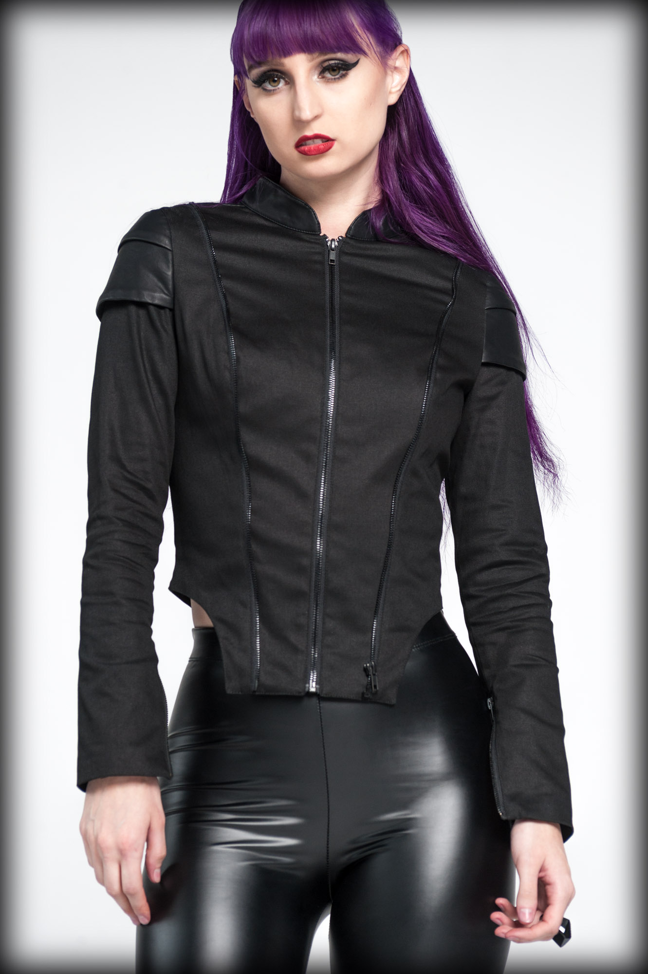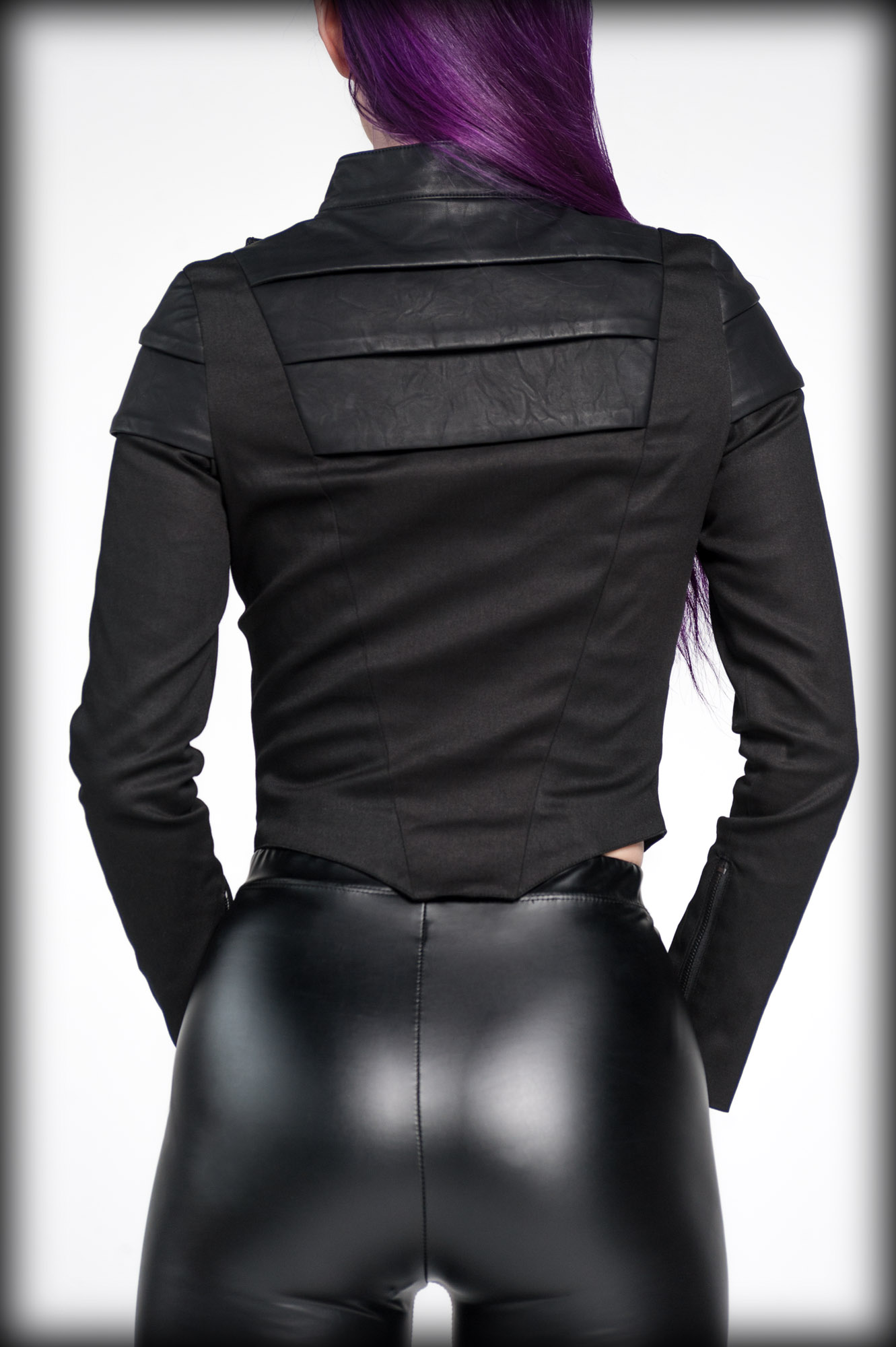 Stretch twill jacket with padded "armor" detail on the shoulders and back yoke, covered with contrasting leatherette. Convertible center front panel allows you to wear it open, closed, or completely removed! Fully lined with black gauze and finished with black metal zippers.