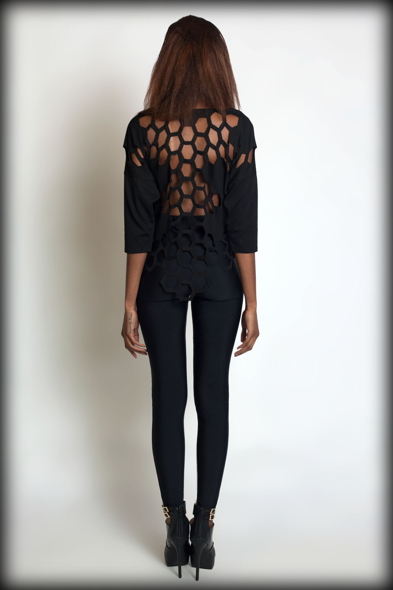 Sweatshirt made from thick ponti fabric with laser cut hexagons throughout the hem!