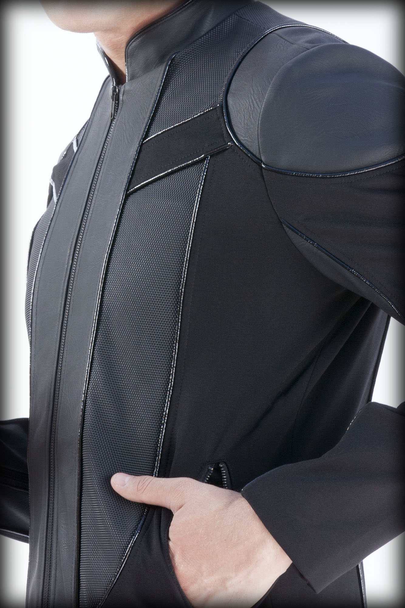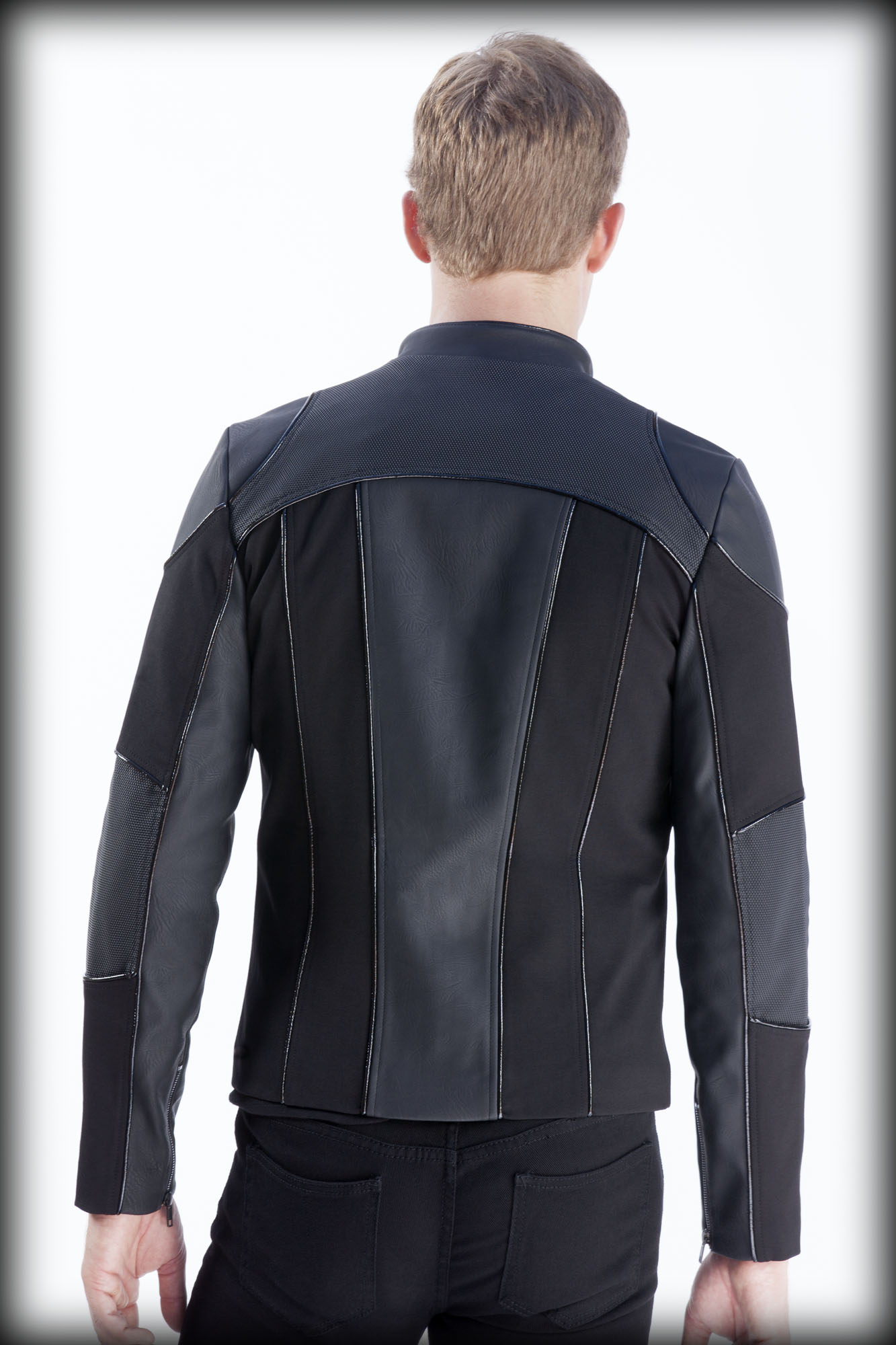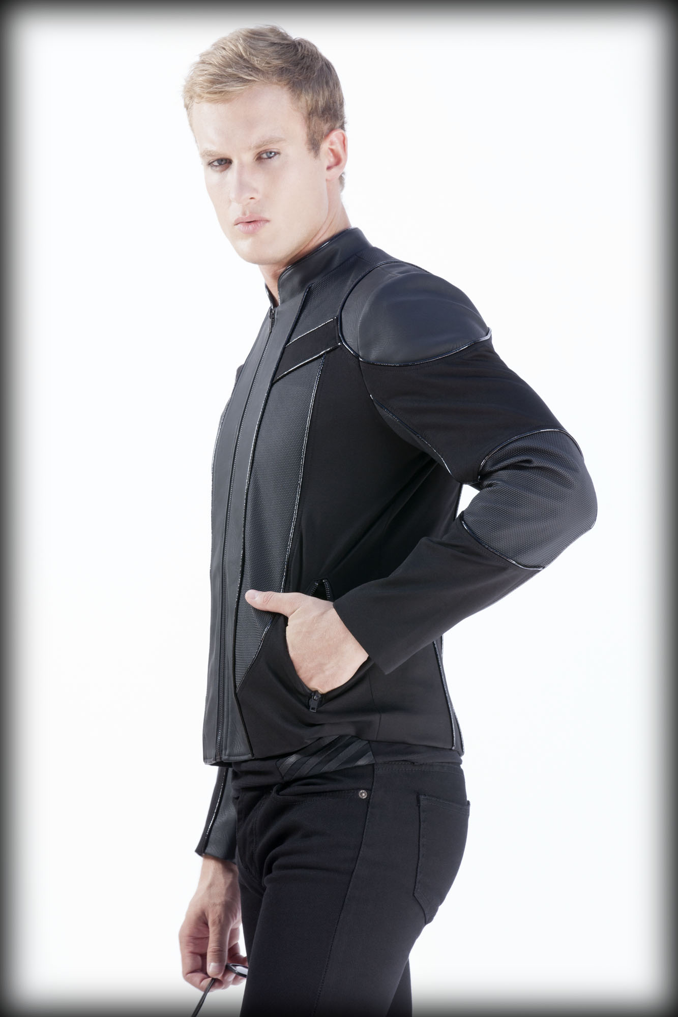 Black neoprene men's moto jacket with textured rubber contrast, gunmetal vegan leather, and PVC piping throughout. Exposed black metal zippers and futuristic style lines with full lining.