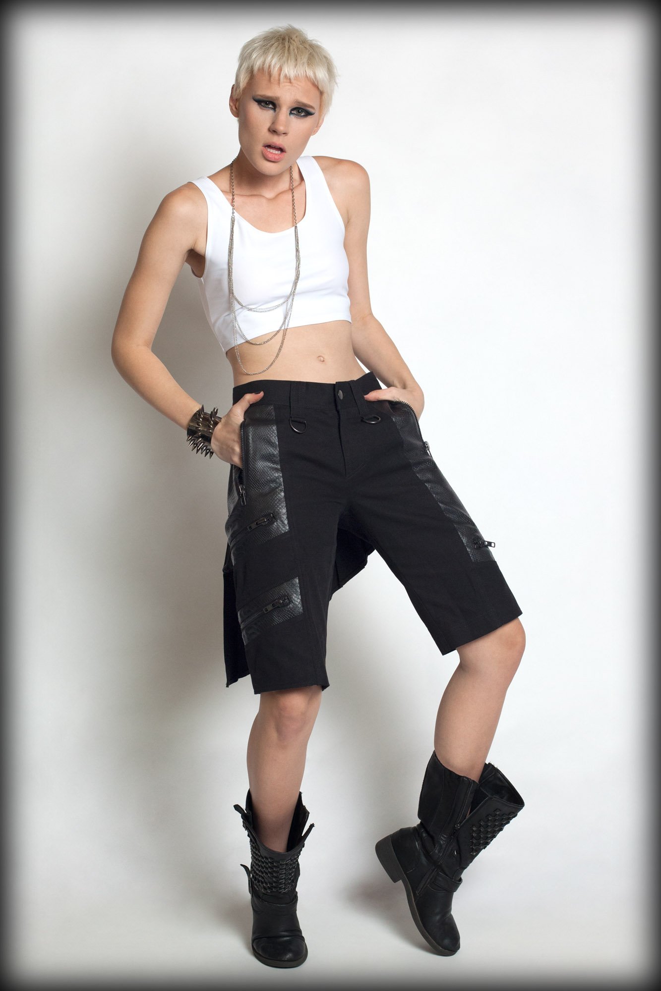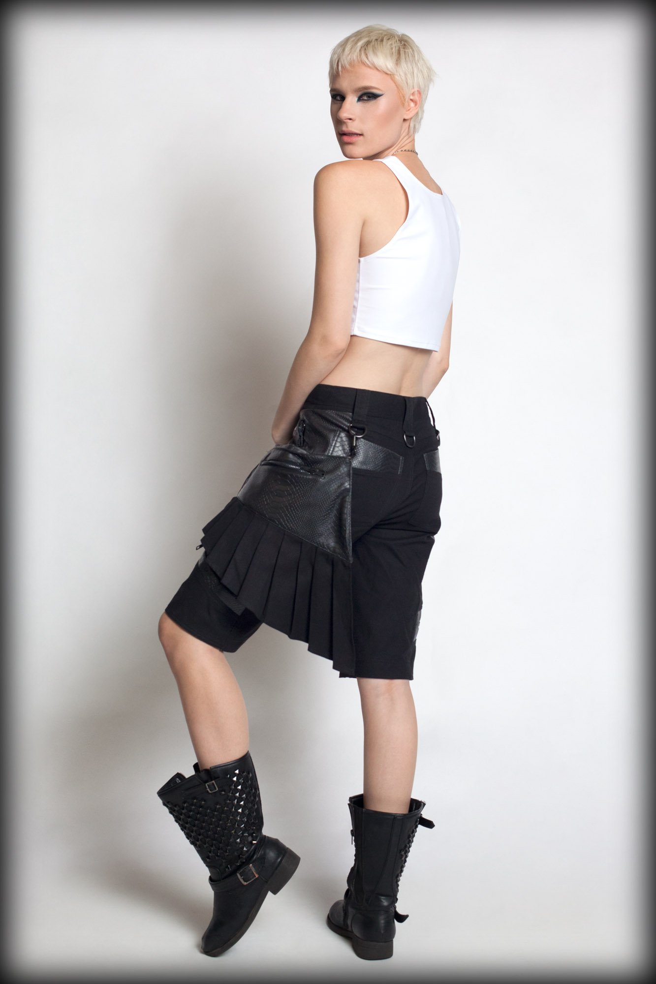 Black canvas bondage shorts with removable pleated pocket, with black rivets, hardware and chunky zippers. Snake textured leatherette contrast. Unisex but cut in men's sizing.