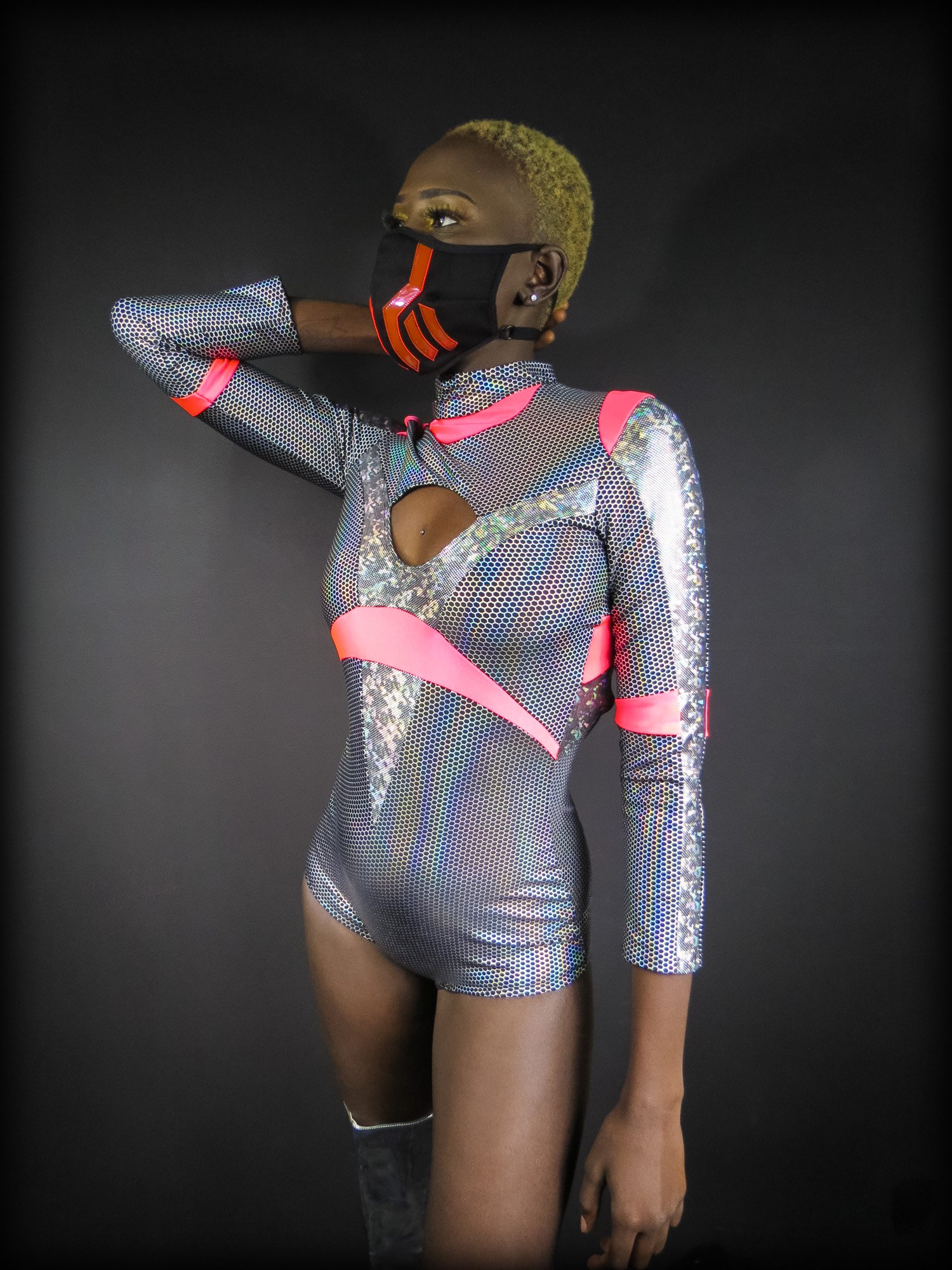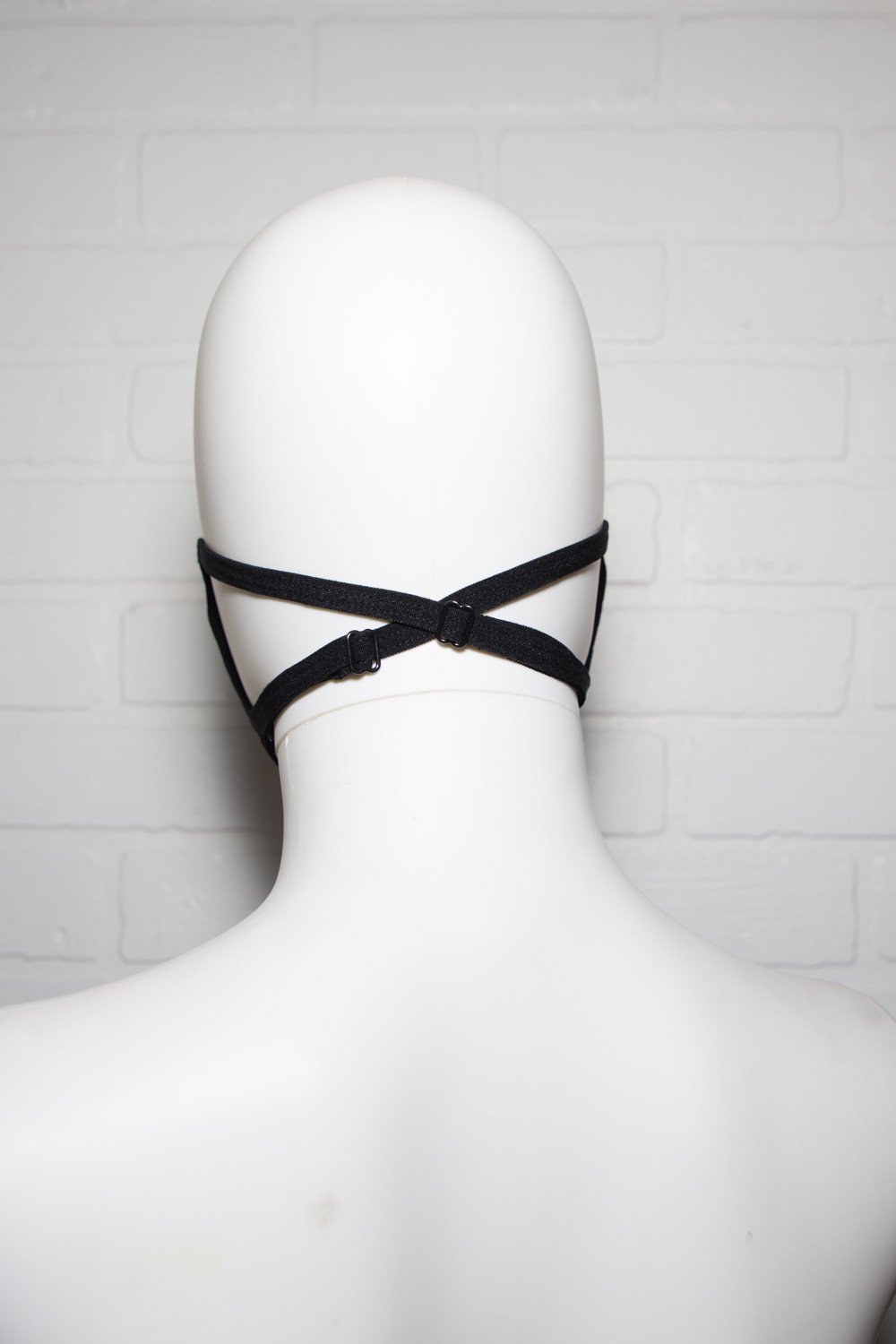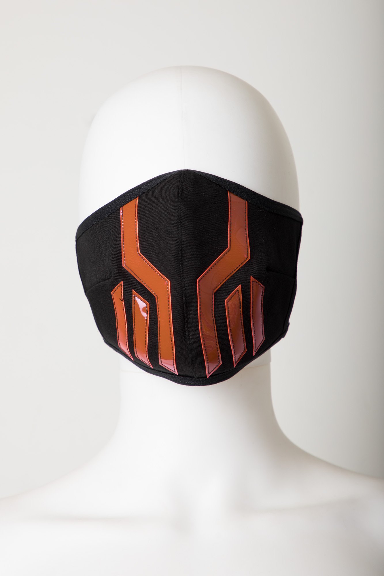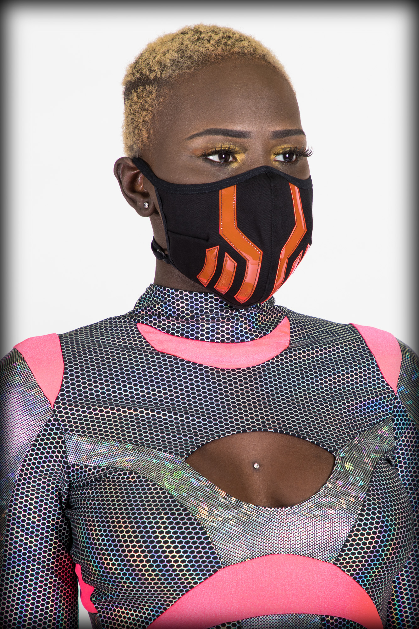 Handmade unisex face mask made from black twill with ergonomic pink UV reactive PVC panels stitched on top. Washable and reusable, and double layered with a full cotton lining layer and adjustable criss cross straps in the back!