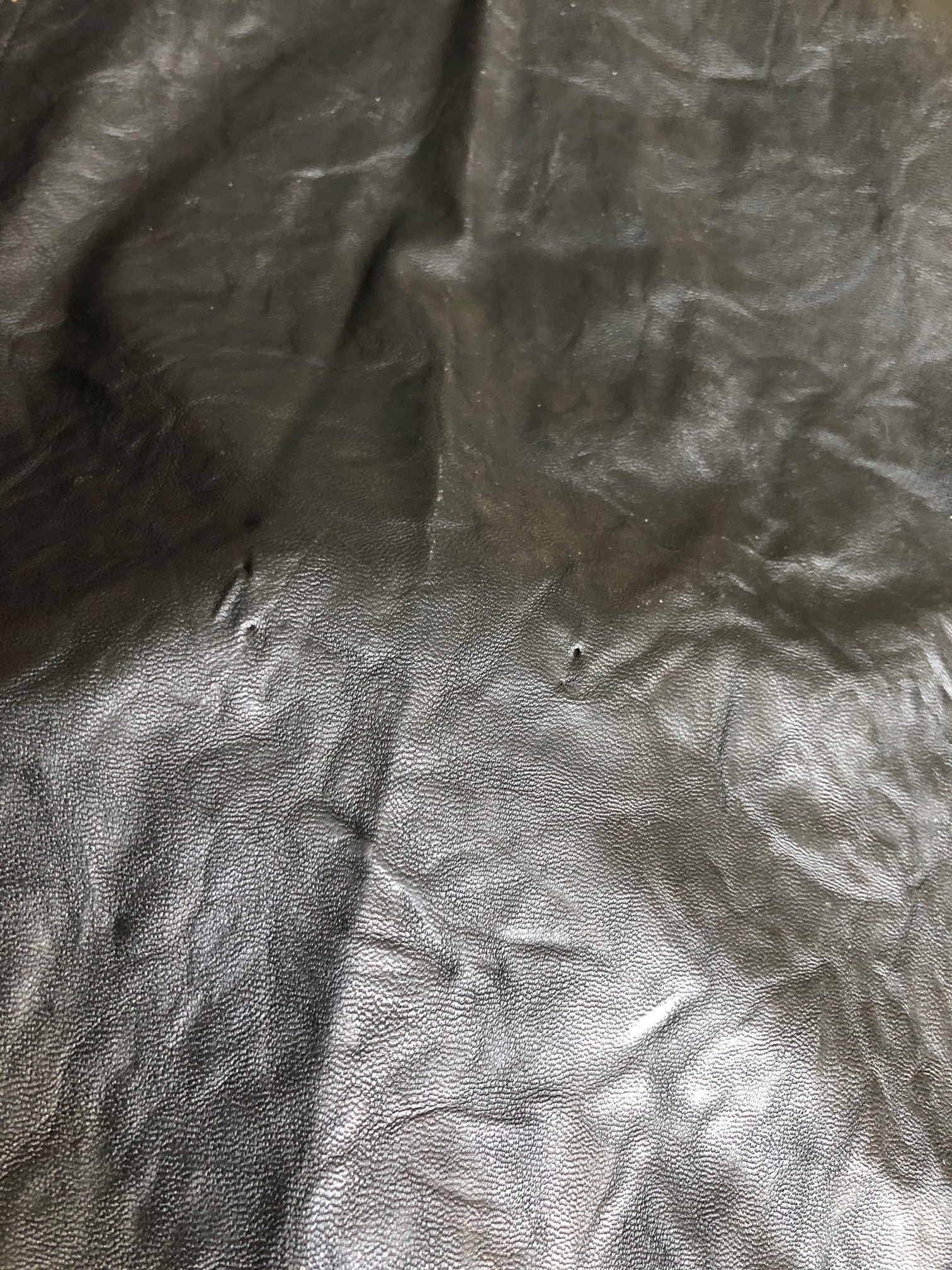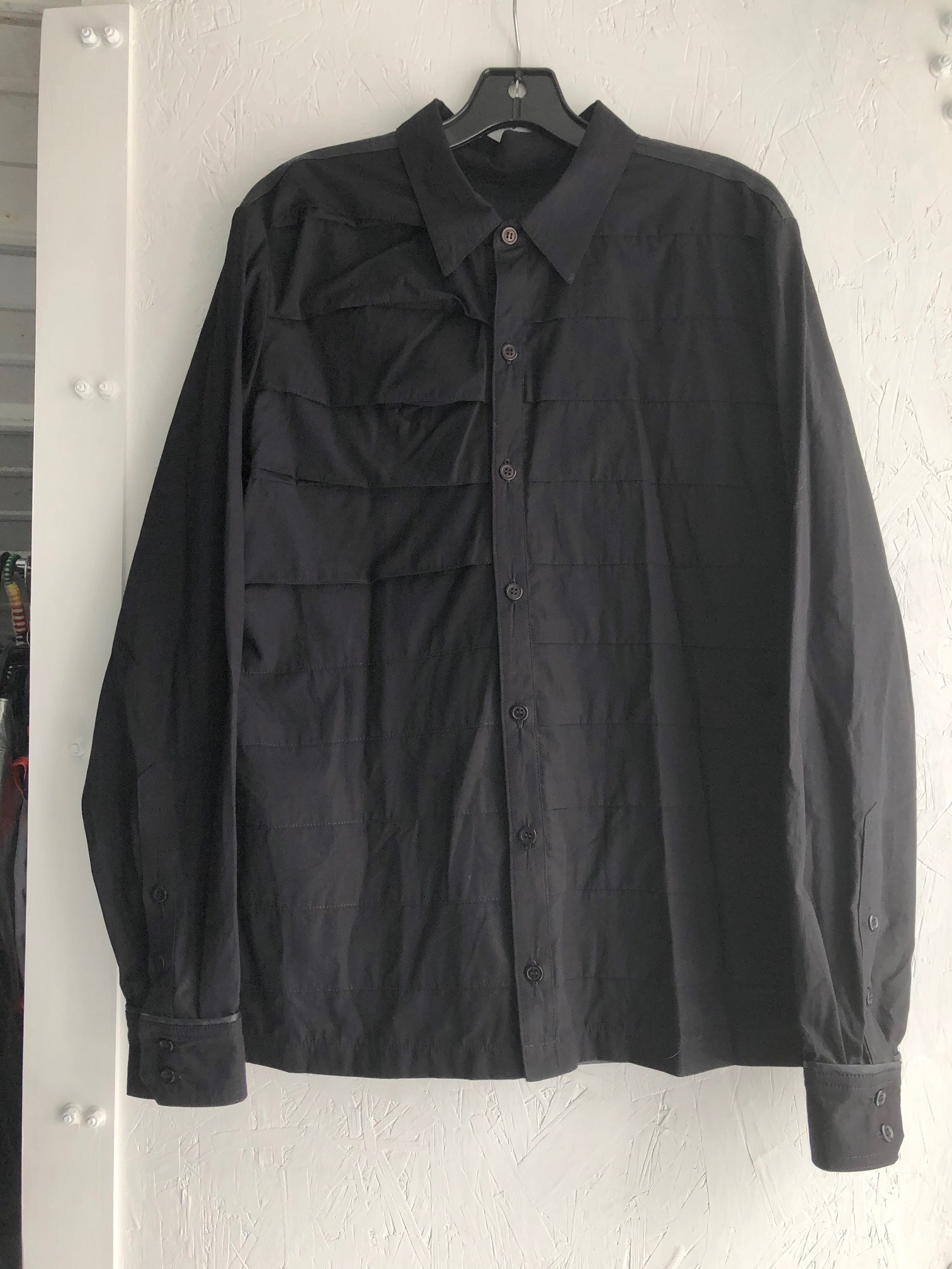Men's button up shirt made from cotton poplin with vegan leather back panel and trim. Approx size M. Button cuffs and pleats down the front. One side has open pleats and the other side has pleats sewn shut. You could either make a cool DIY project out of it, or if you are handy with a sewing machine, they could easily be unstitched and redone to match the other side. There are a couple of pin holes, especially in the back panels.