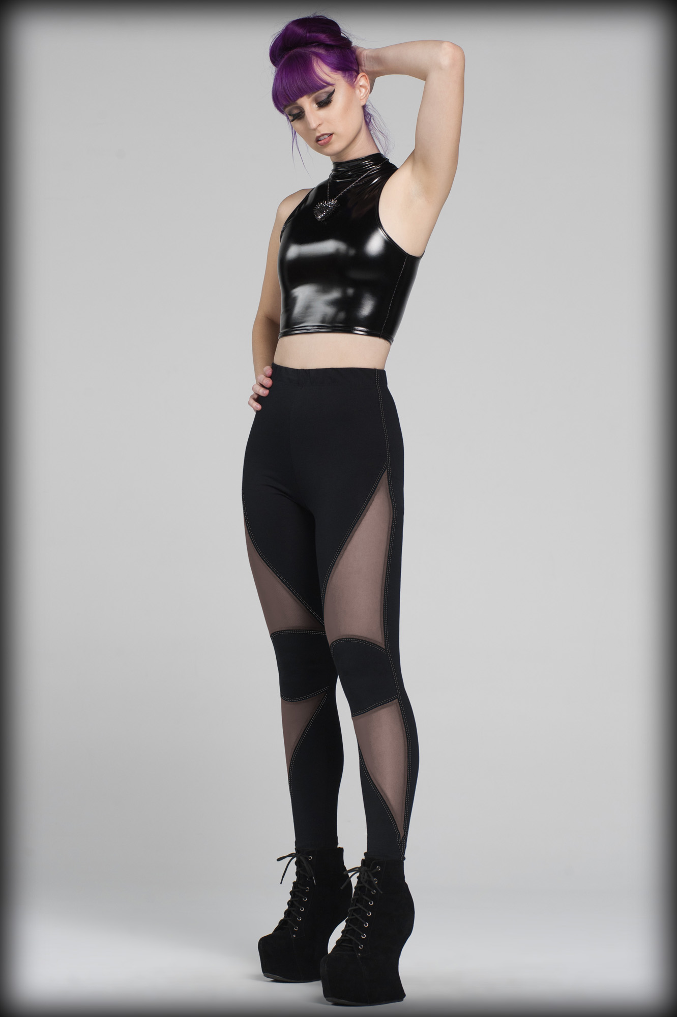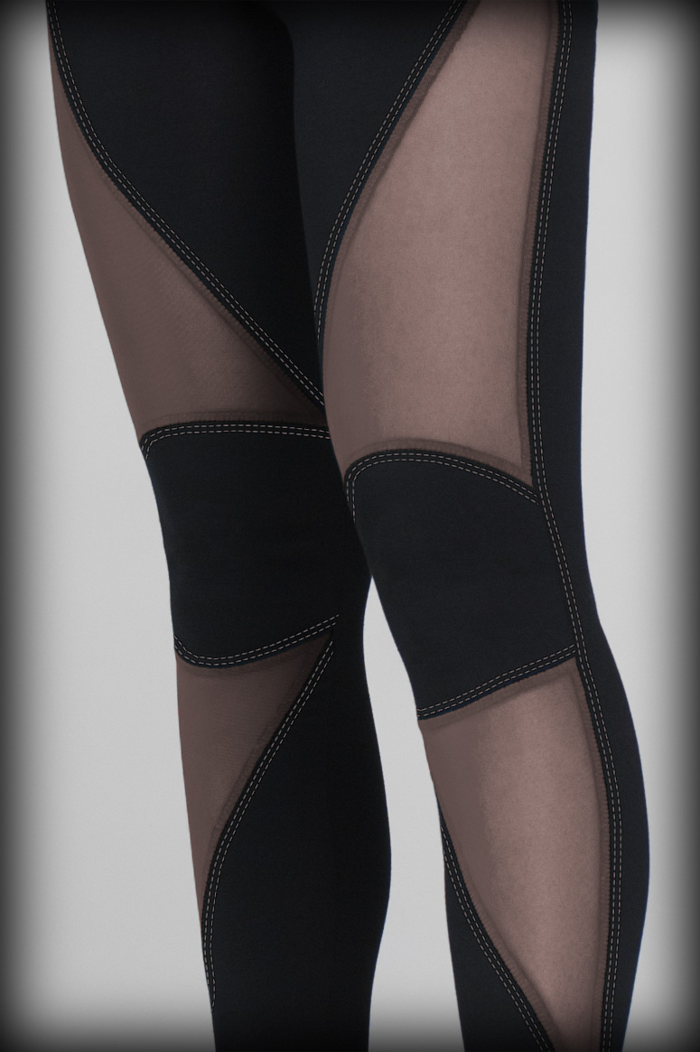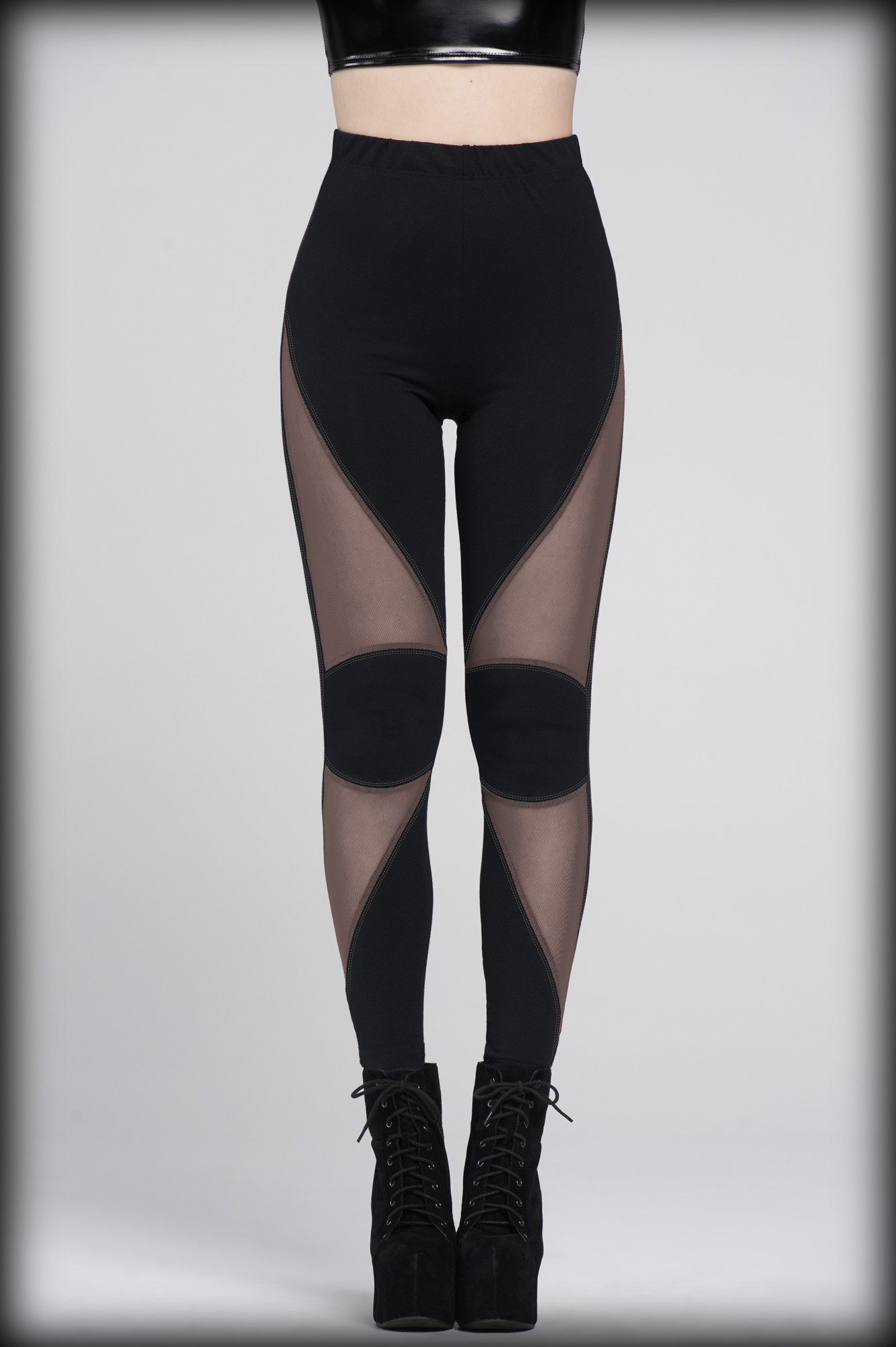 High waisted black cotton lycra leggings with black mesh geometric panels and matching contrast stitching.