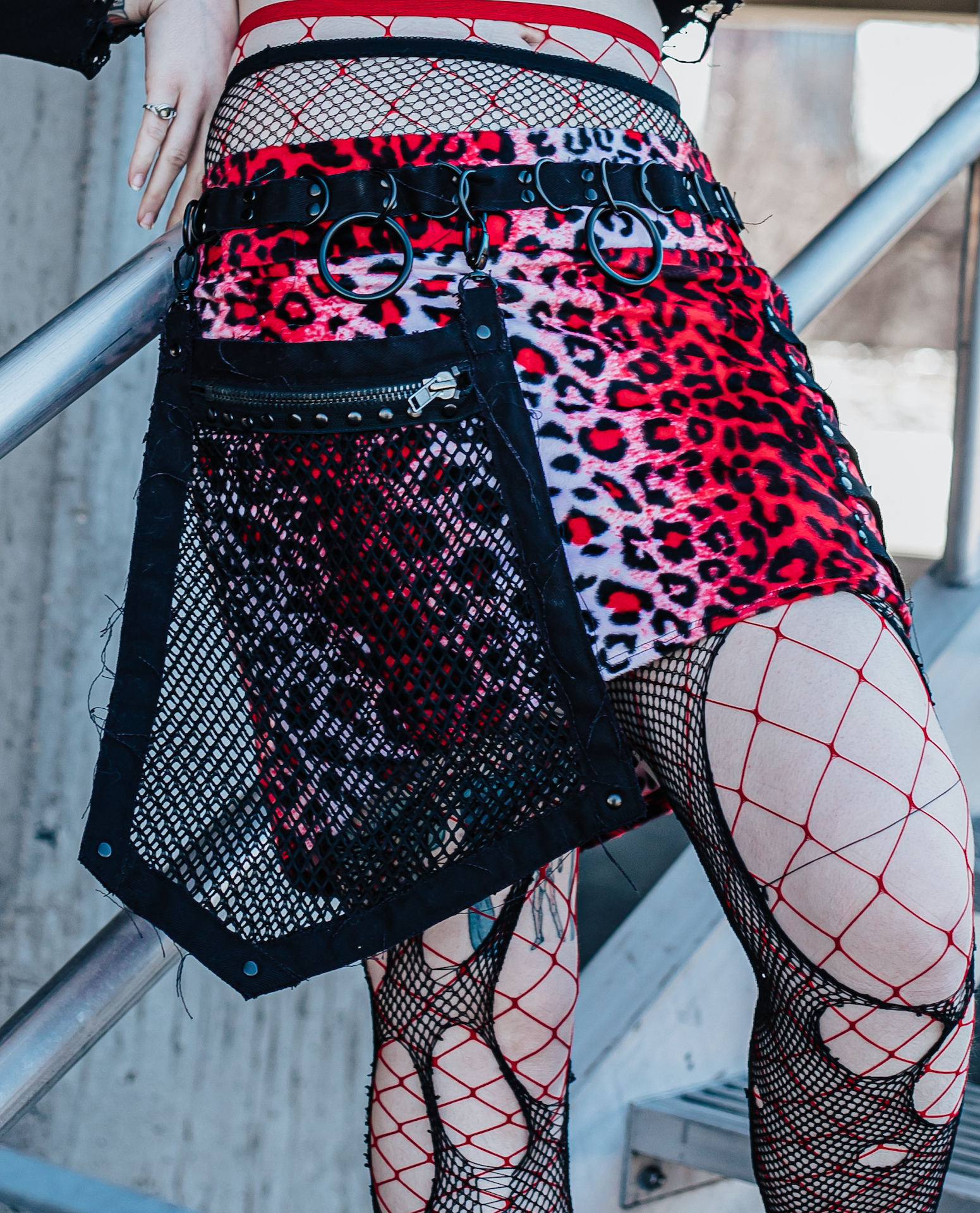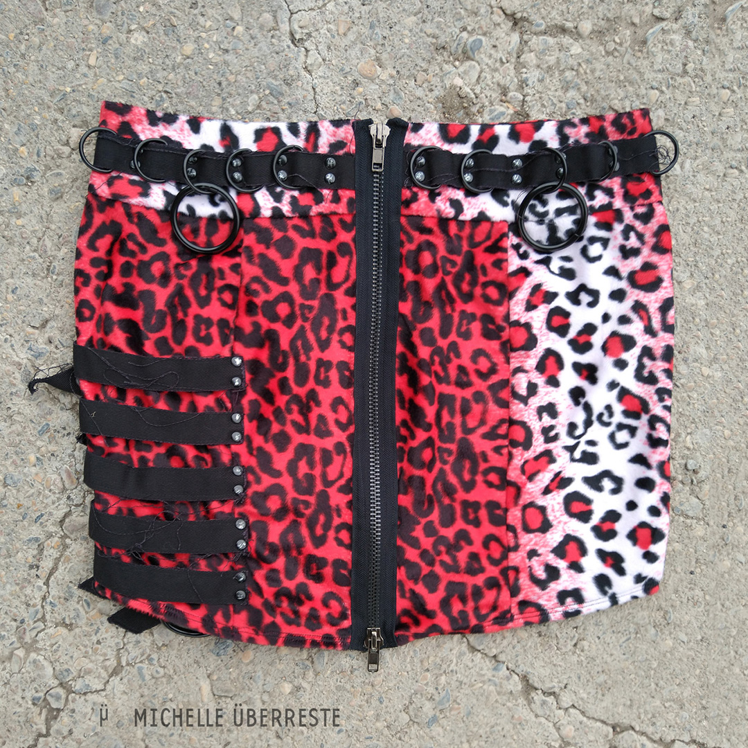 One of a kind faux fur skirt with red leopard print with black distressed hardware, removable (or movable!) mesh pocket, raw edge twill straps and chunky #10 double ended exposed metal zipper in the back.