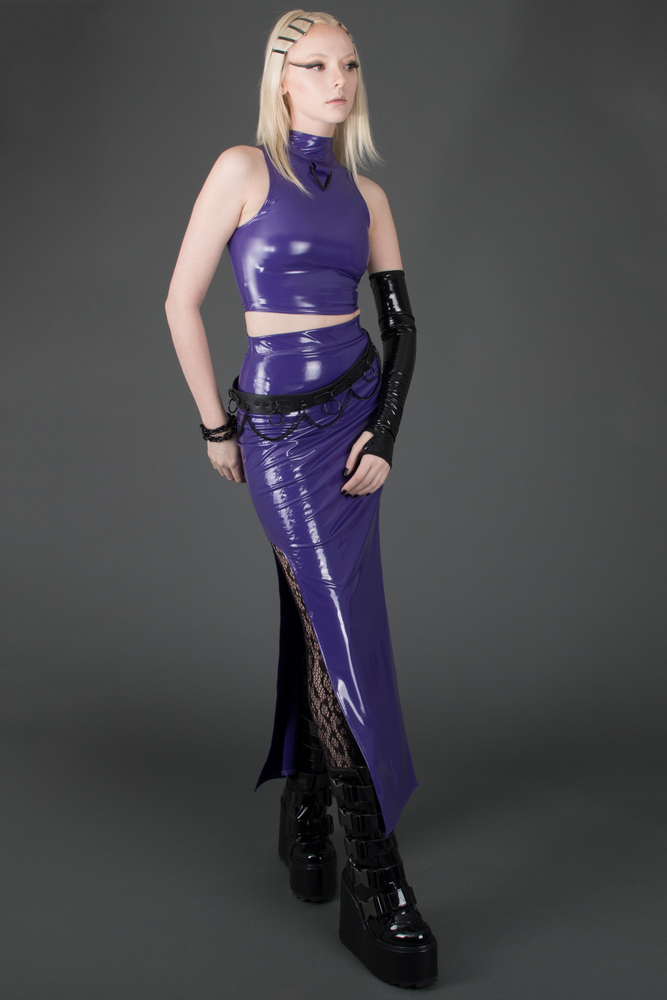 4-way stretch PVC crop top in shiny purple with high neck, black polymer triangle ring at center front and back zipper!