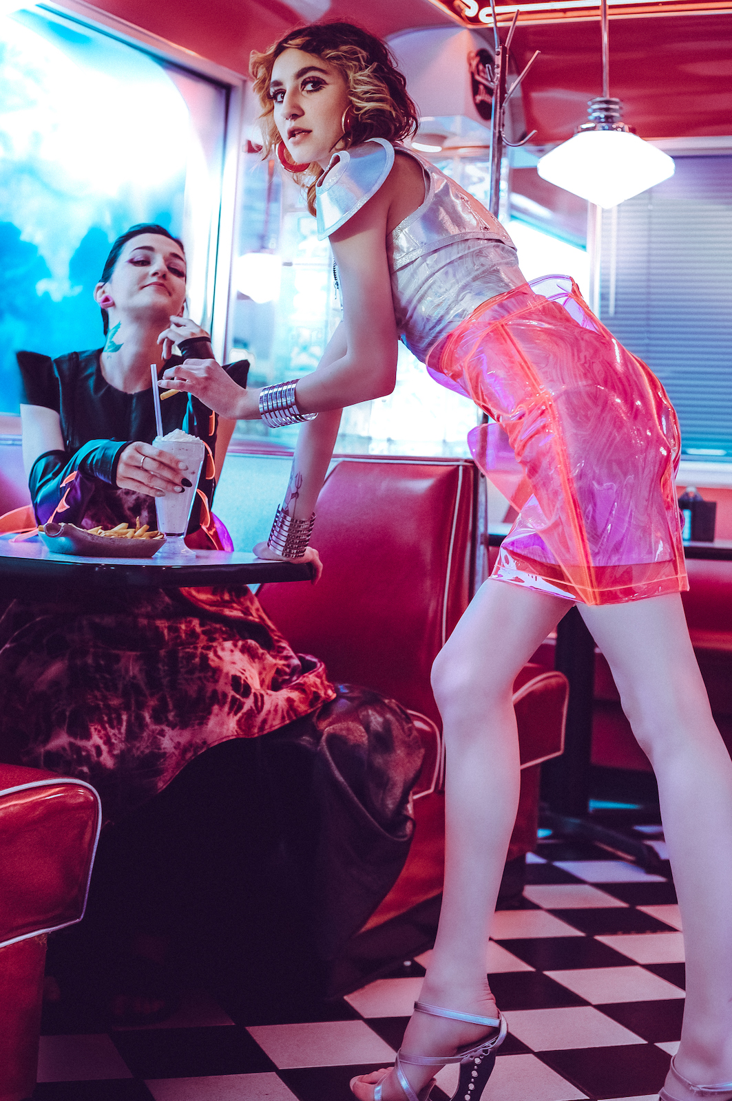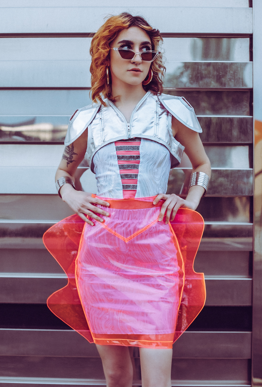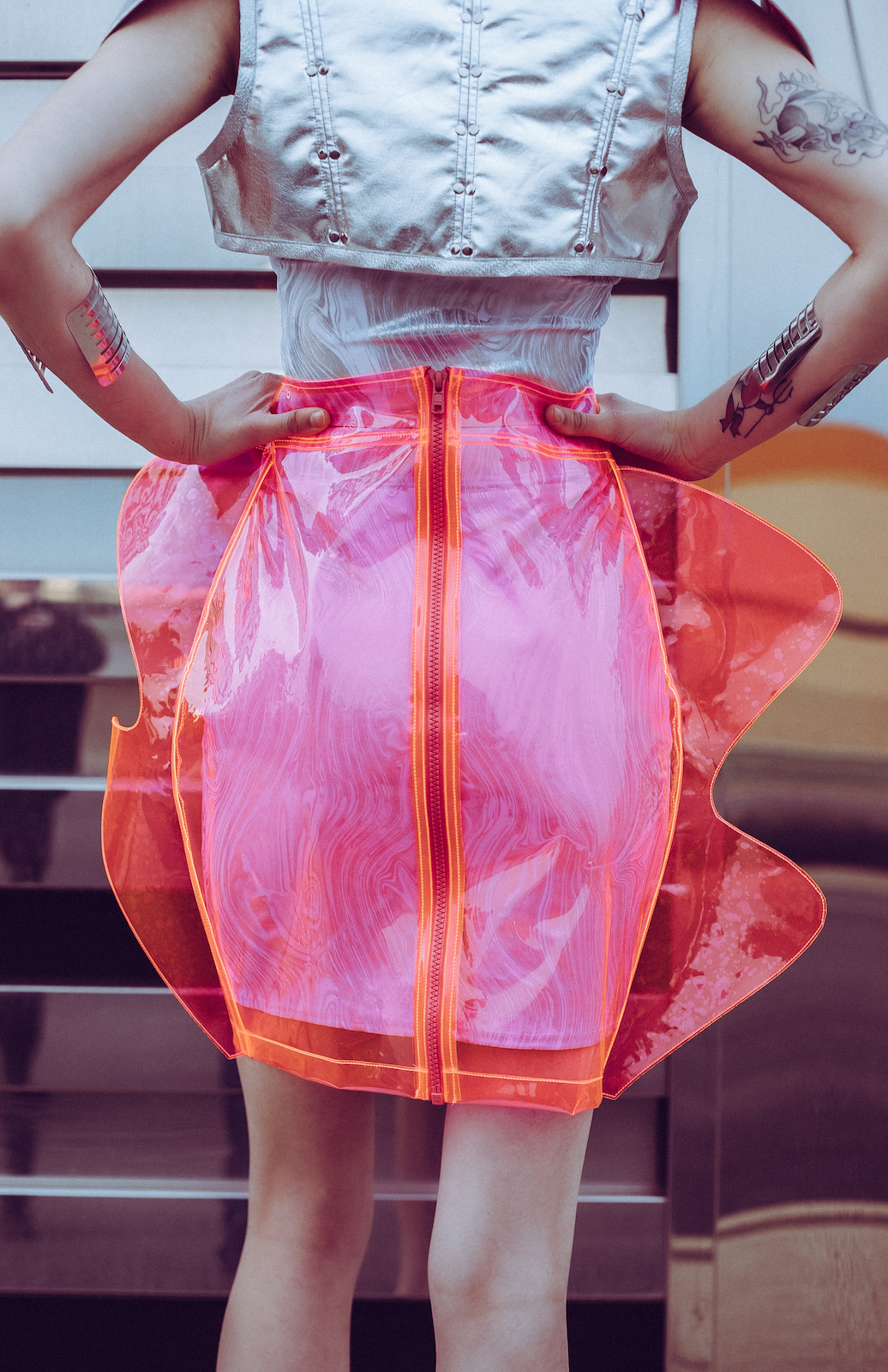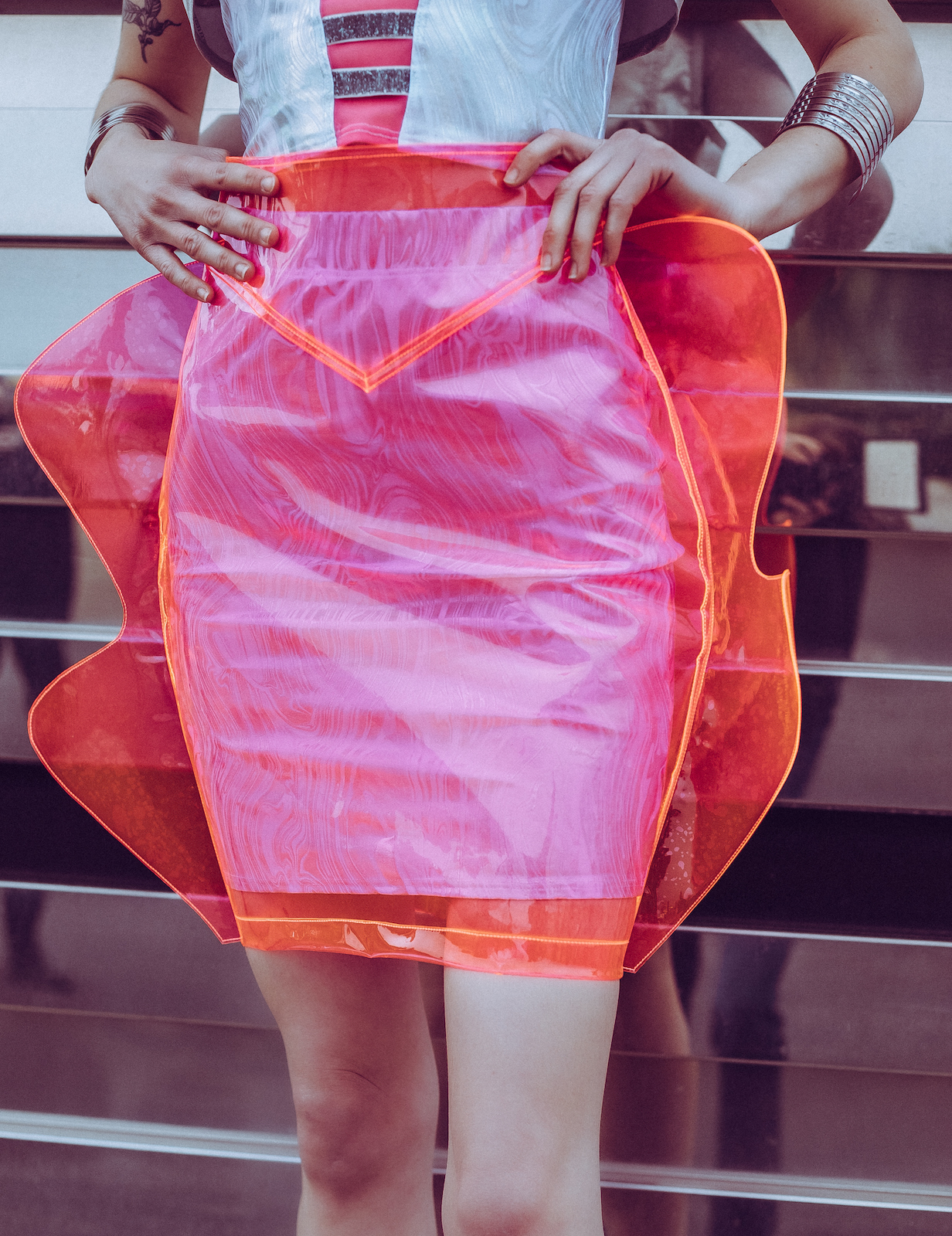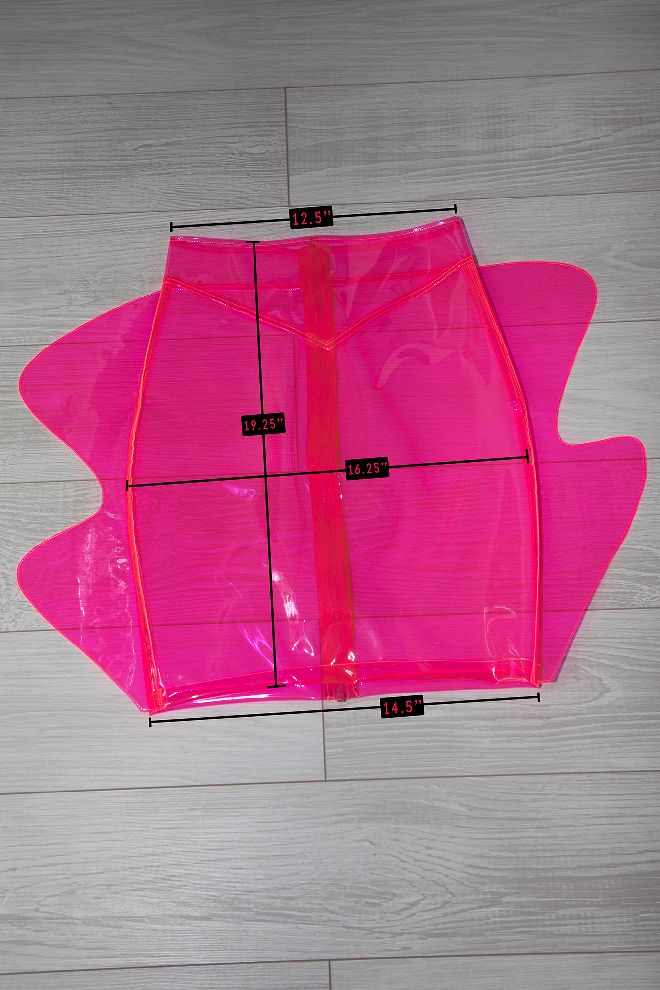 One of a kind handmade skirt from clear, hot pink UV reactive plastic with wavy shape detail on both sides and molded back zipper with flattering V-shaped high waist.