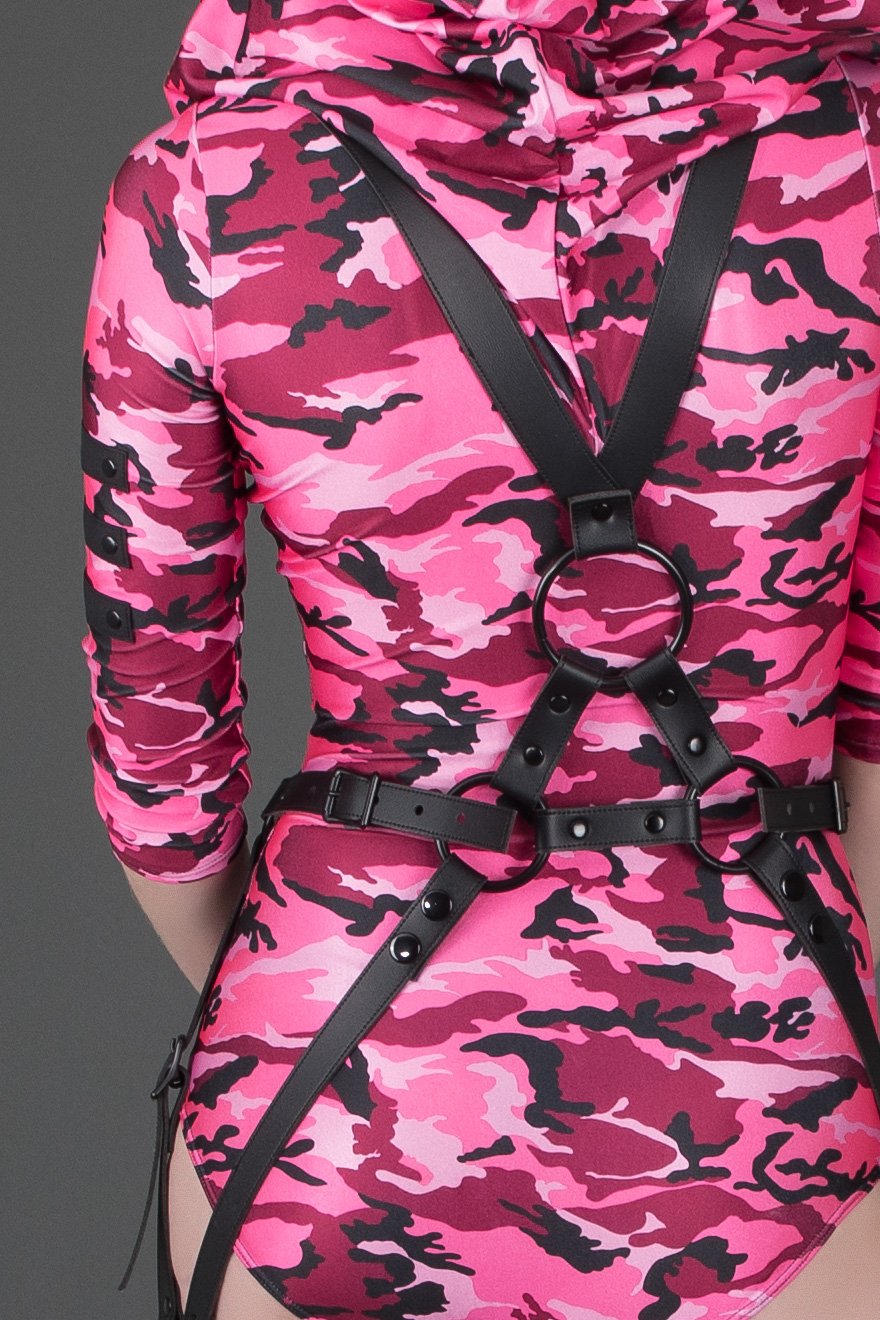 One of a kind pink camouflage spandex bodysuit with exposed metal zipper set center front, parallel riveted stripes on the left bicep, high collar and 3/4 sleeves. Matching hooded harness features oversized integrated hood on a super adjustable body harness made from vegan friendly stiff upholstery leatherette. Black metal hardware holds the entire thing together - rivets, O-rings. buckles, oversized D-rings, with a super-spiked chest piece. Removable snap off leg straps.