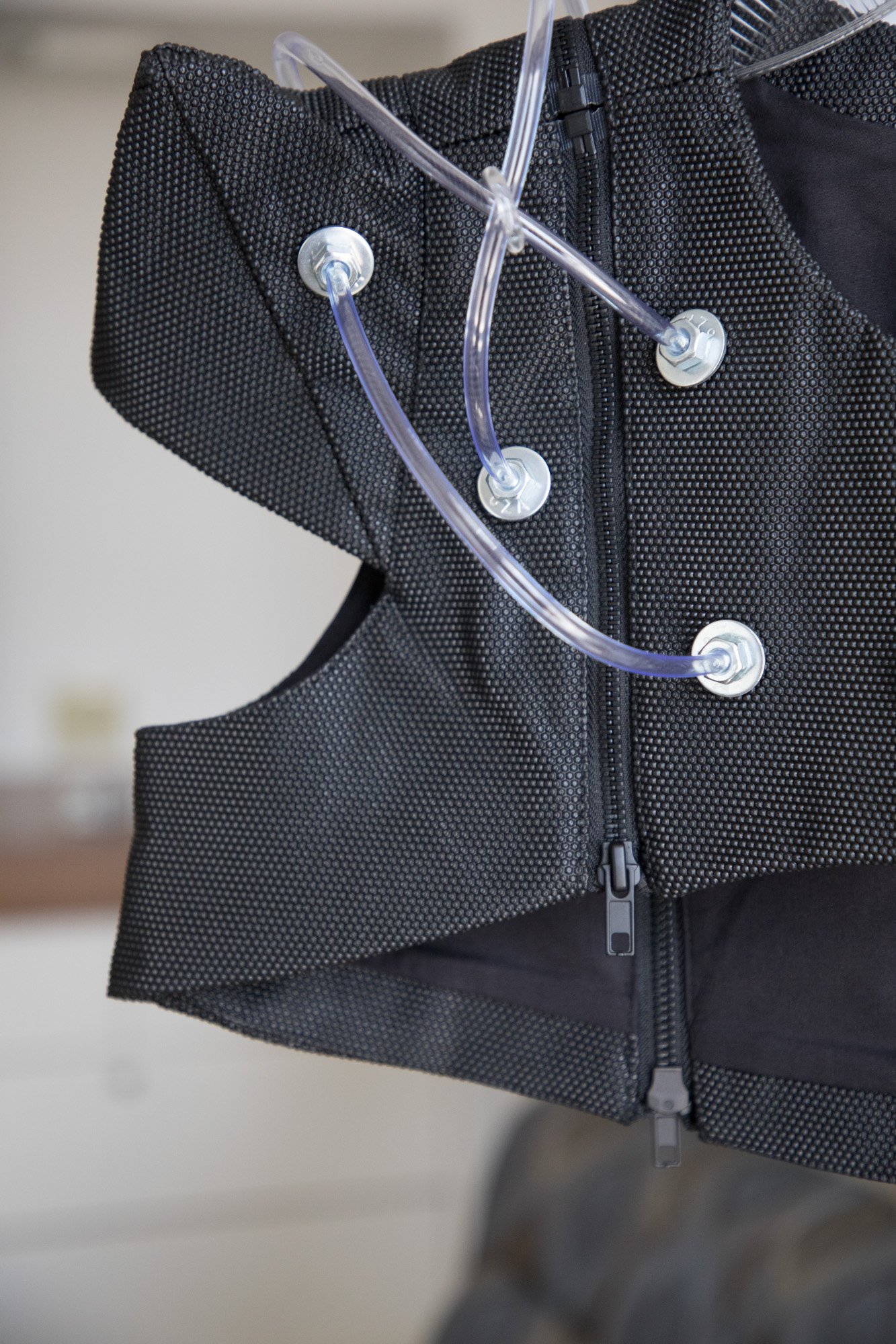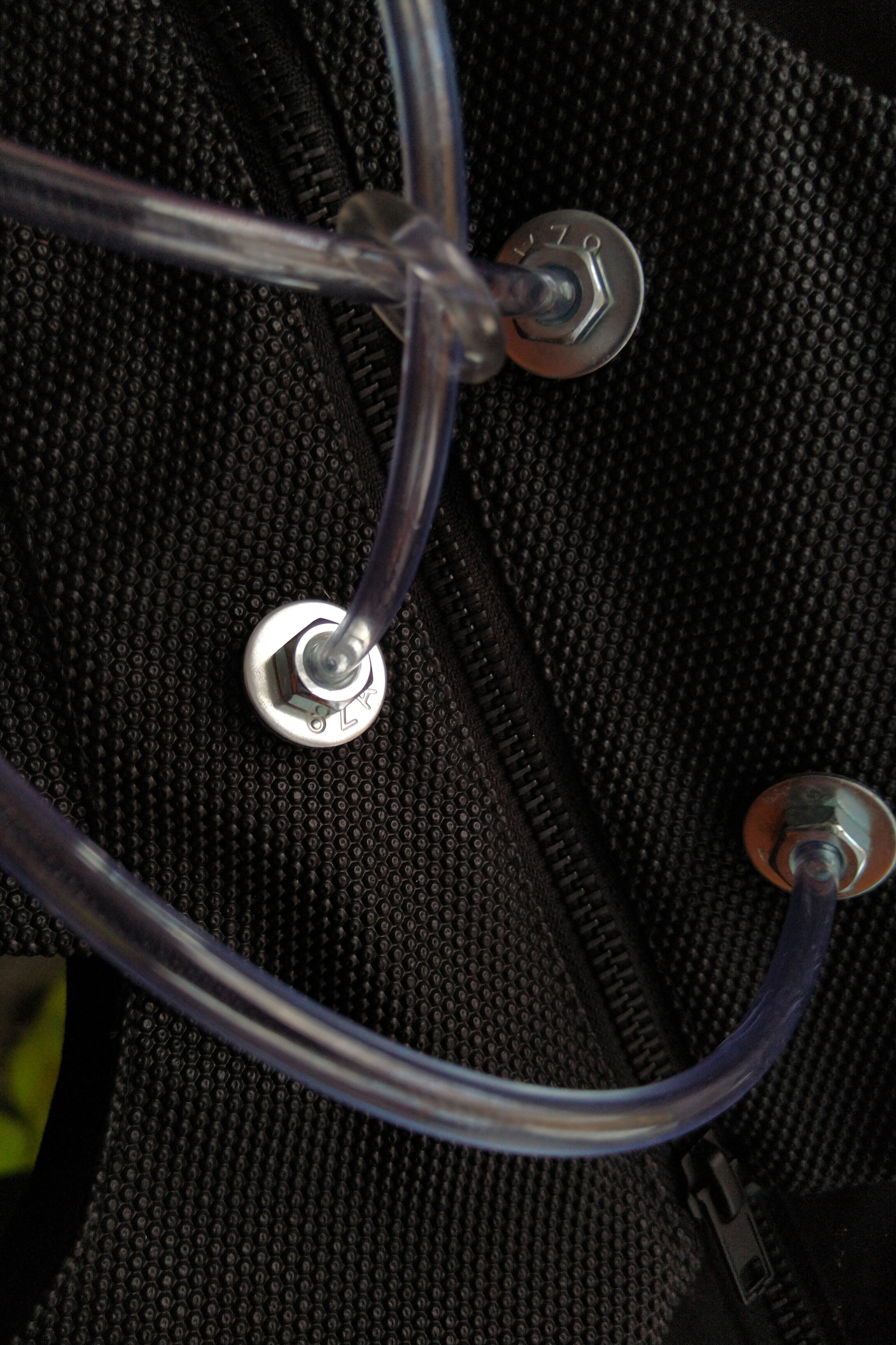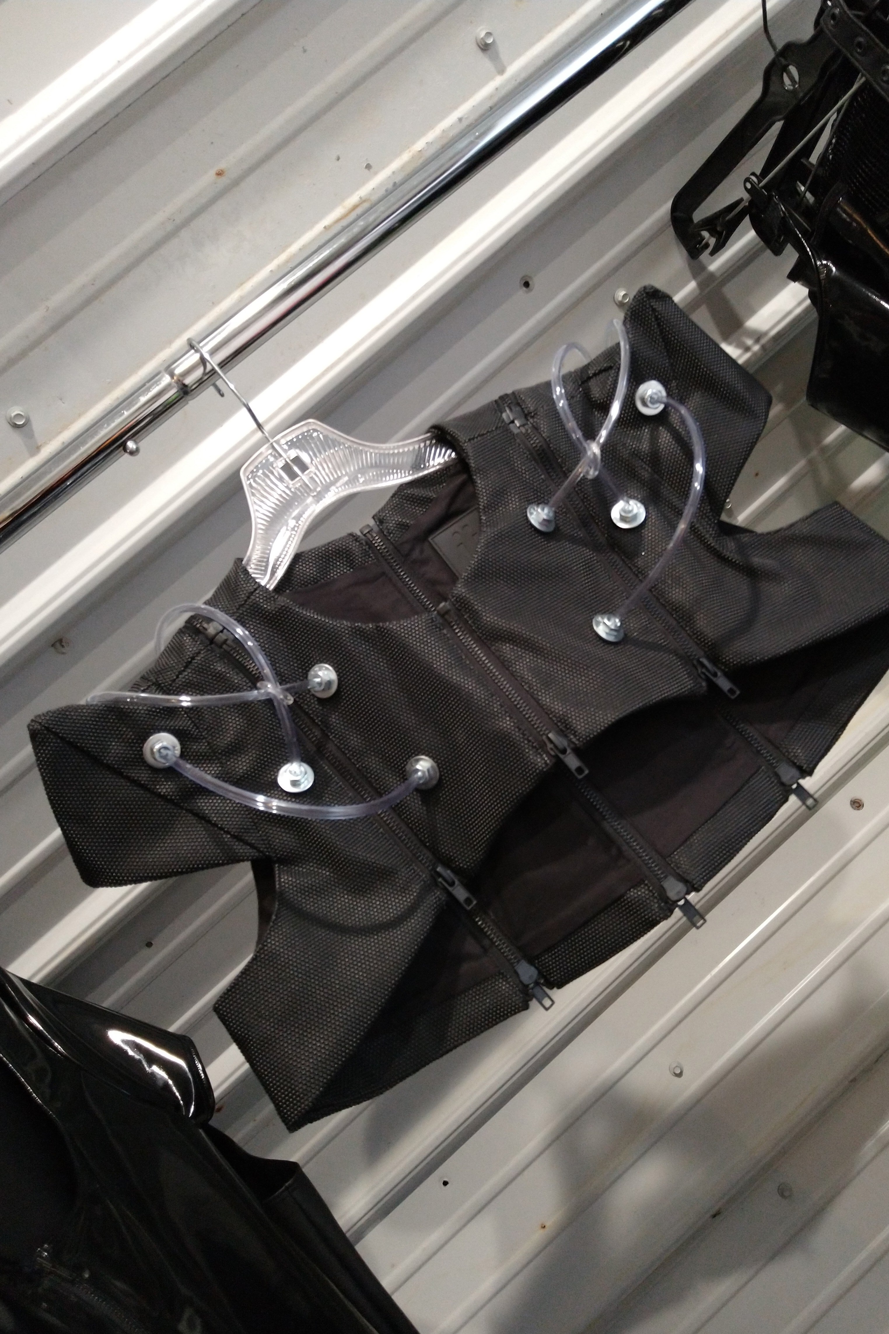 One of a kind, hexagon textured black rubber shrug with multi zipper details, and pointy, geometric shoulders. Fully lined. Silver metal hardware and clear, flexible tubes with clear plastic O-rings.