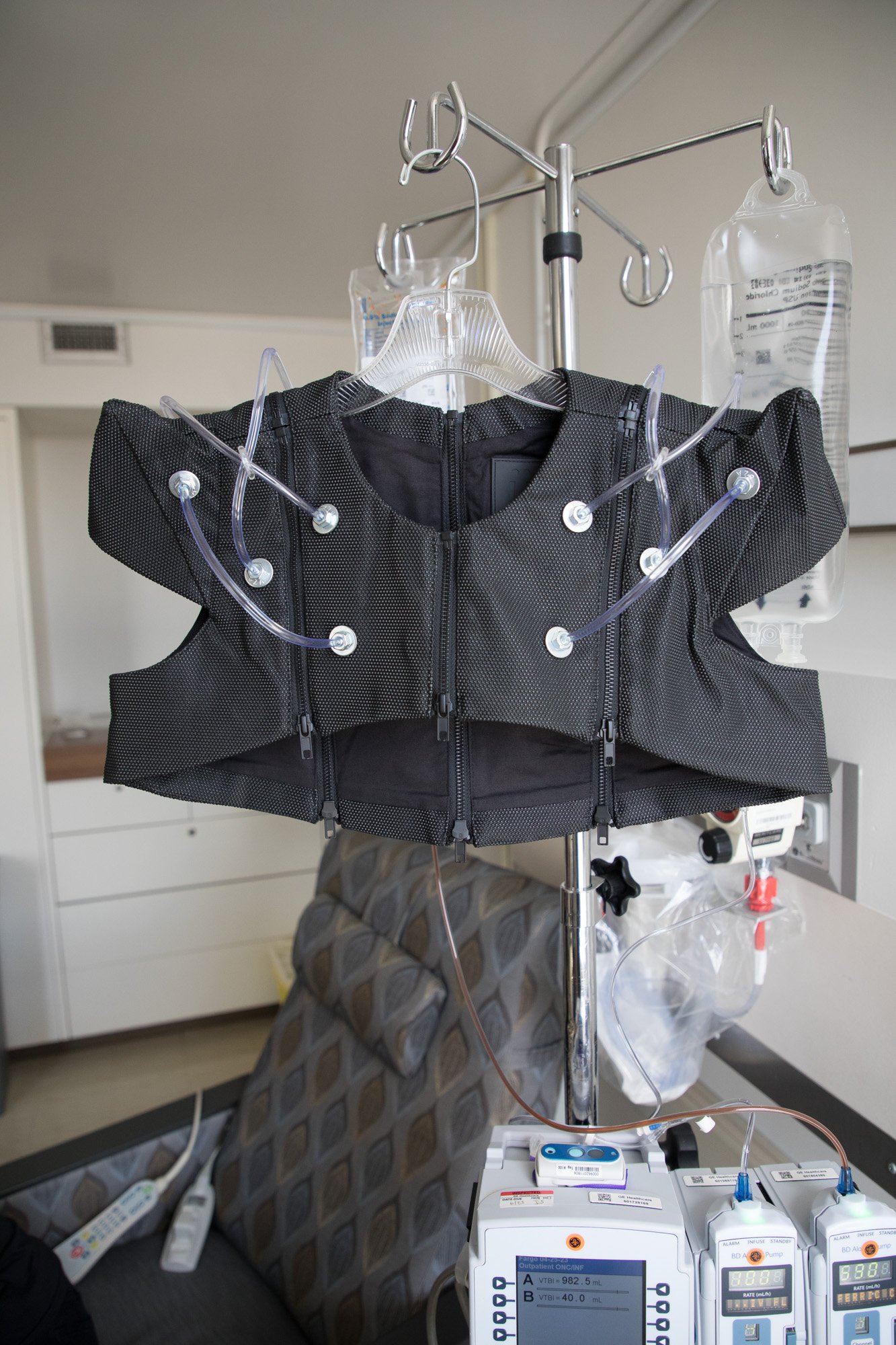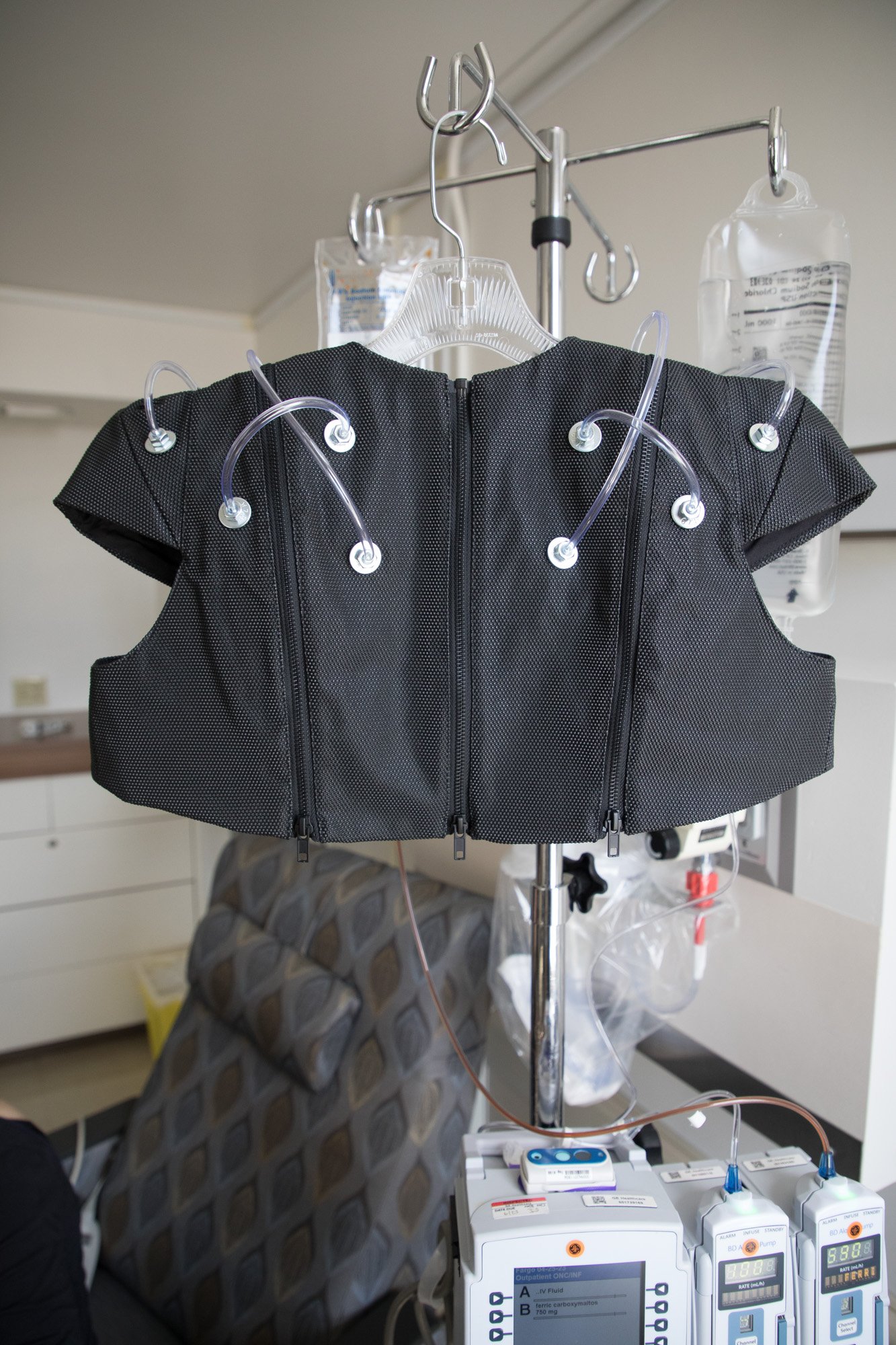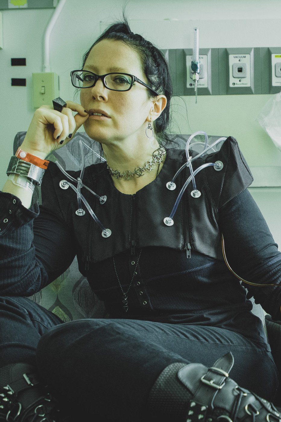 One of a kind, hexagon textured black rubber shrug with multi zipper details, and pointy, geometric shoulders. Fully lined. Silver metal hardware and clear, flexible tubes with clear plastic O-rings.