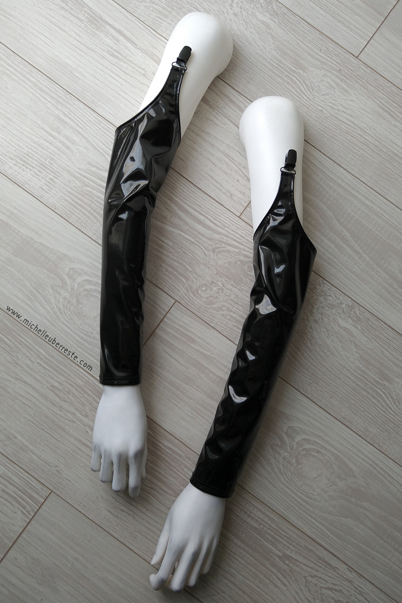 4-way stretch shiny black PVC sleeves with black metal garter clips! Mix and match them with lots of our other pieces, or your own! You can even wear them with the clips hanging down or use them for layering! The options are endless!