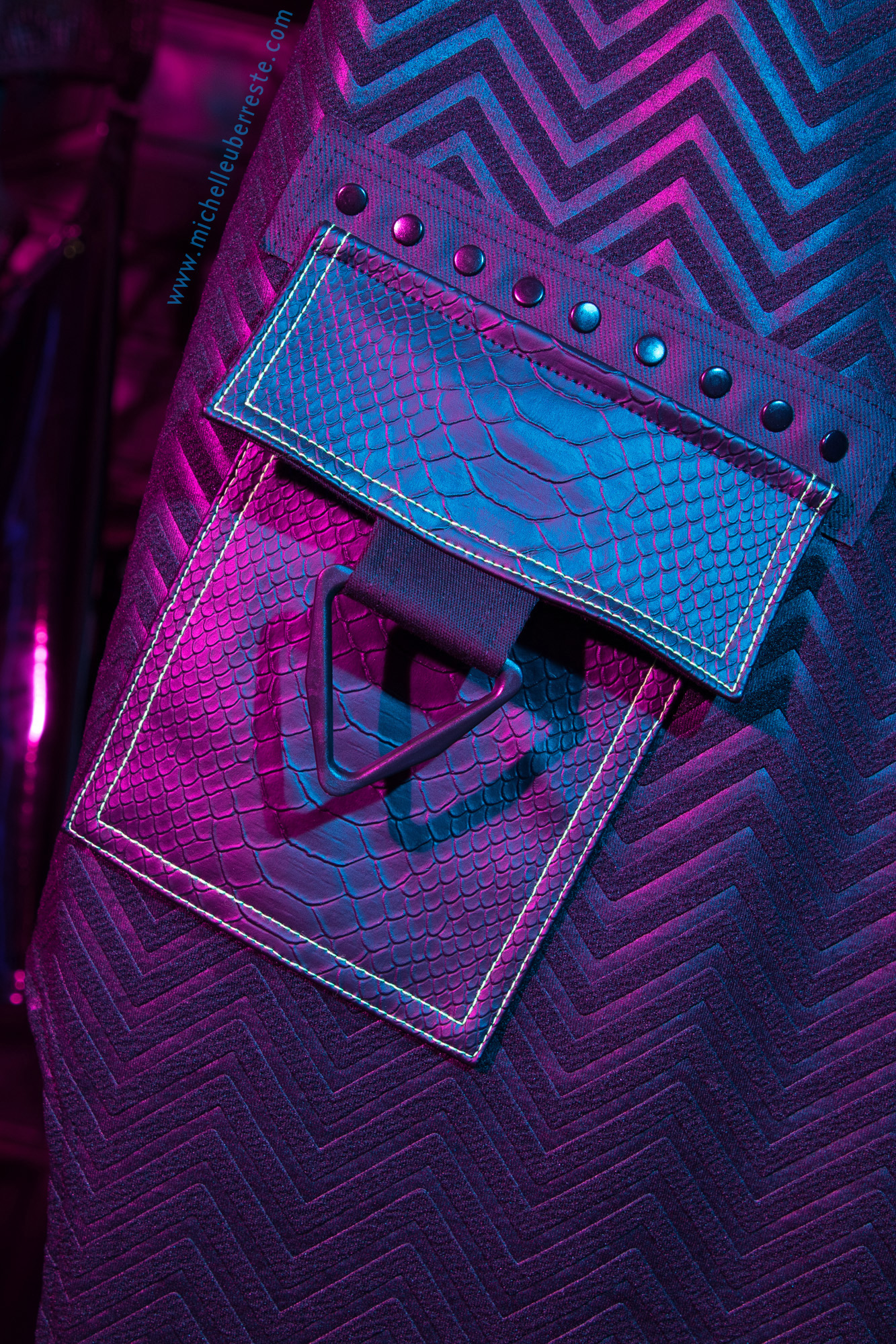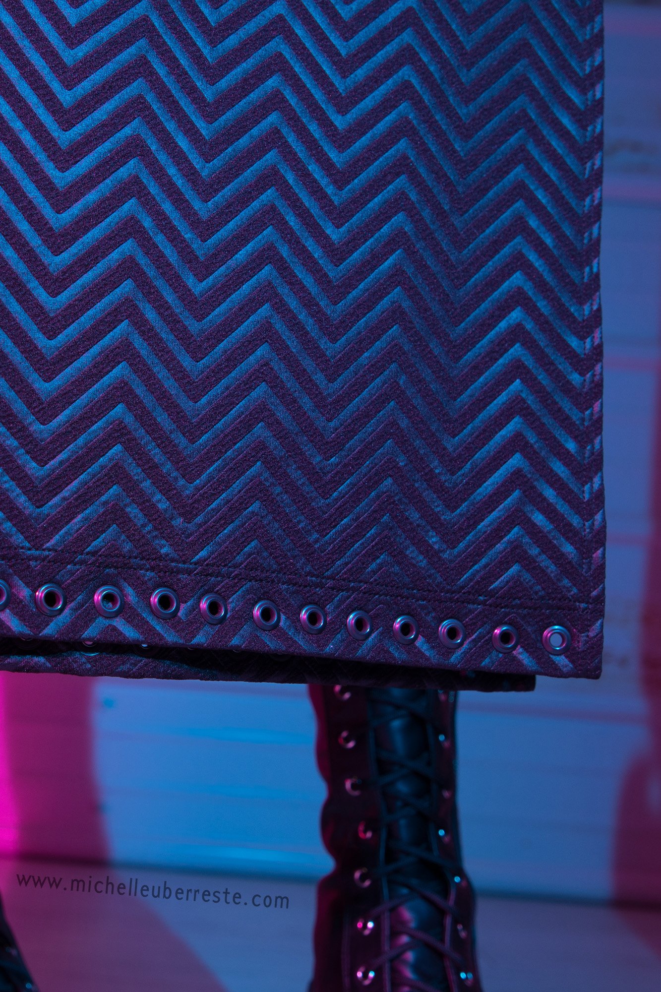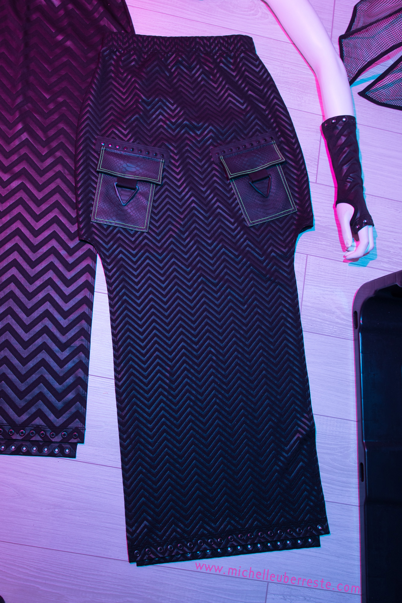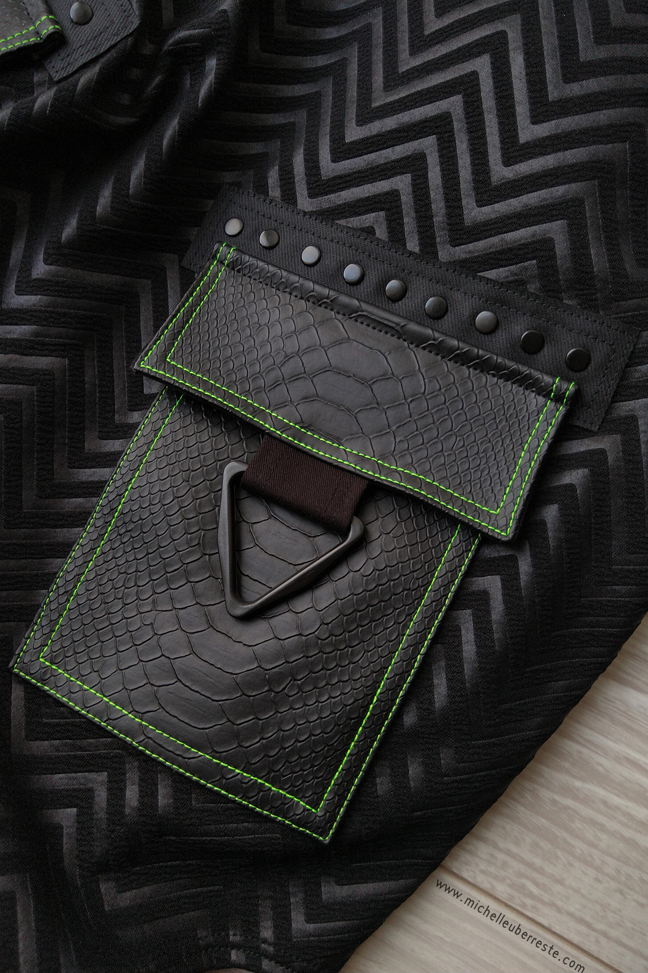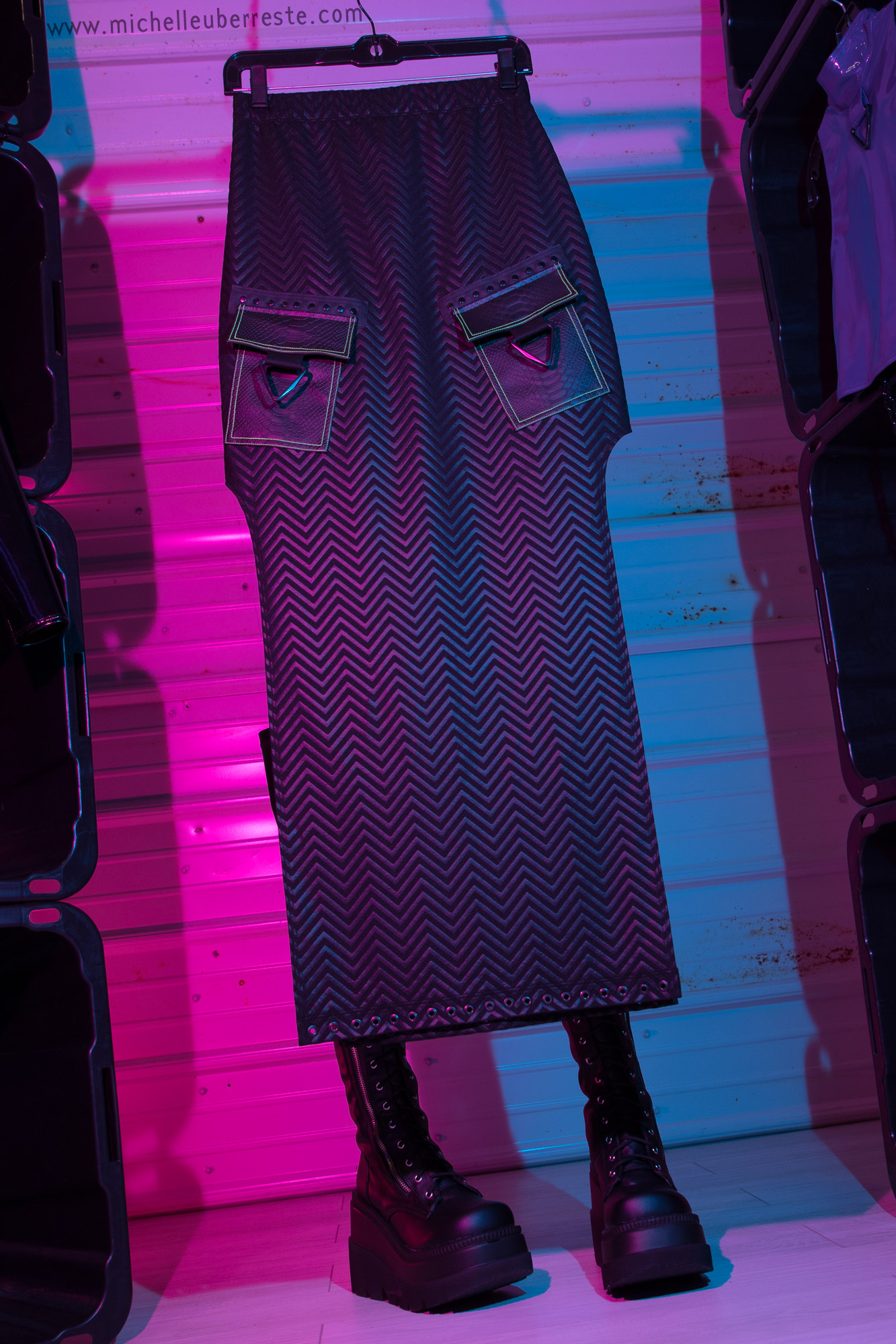 One of a kind, long skirt made from thick ponti with small, matte black chevron print. The double cargo pockets are made from reptile textured PU with neon green, UV reactive thread detail, and big triangle rings. Raw edge, coated twill placket strapping reinforces the pockets, and 9 black baby rivets trim each one. High waist, curved slits on both sides, and comfy, yet strong, stretchy elastic waistband. 36 black oxide baby grommets trim the hem.
