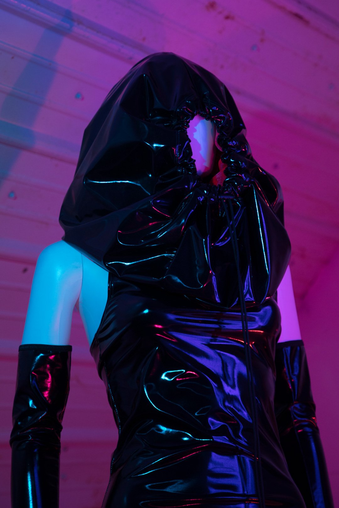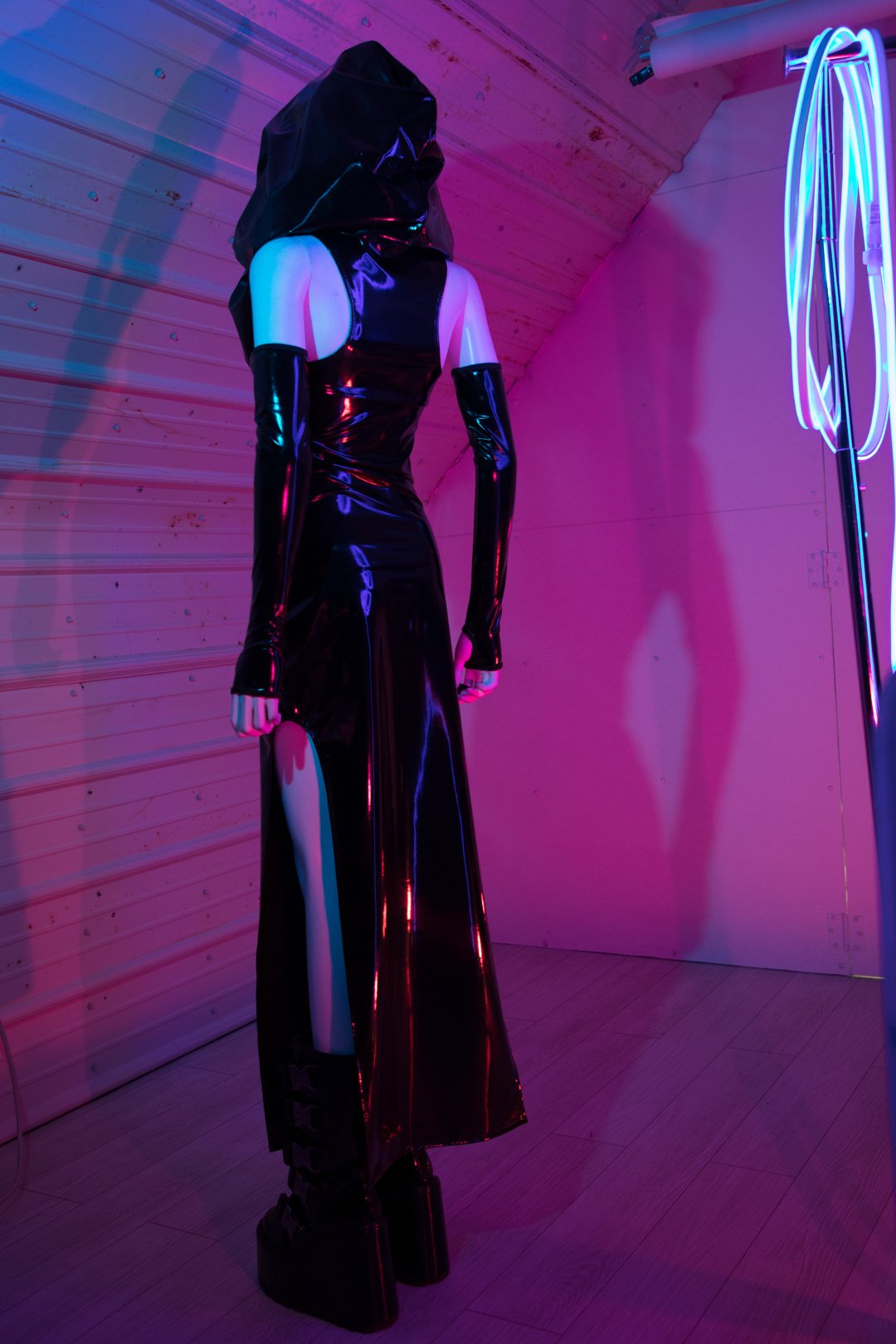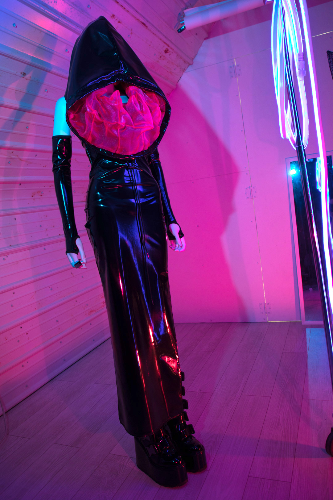 ONE OF A KIND maxi dress made from 4-way stretch PVC in shiny black with hidden, pop out spikey hood lining made from sheer, neon pink organza, each of the 41 panels are handcut, pinned, and sewn together from scratch. Black metal toggle and metal tips on nylon drawstring.