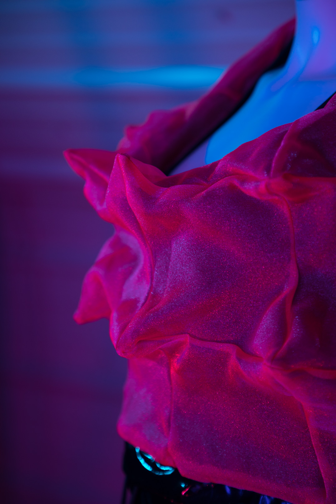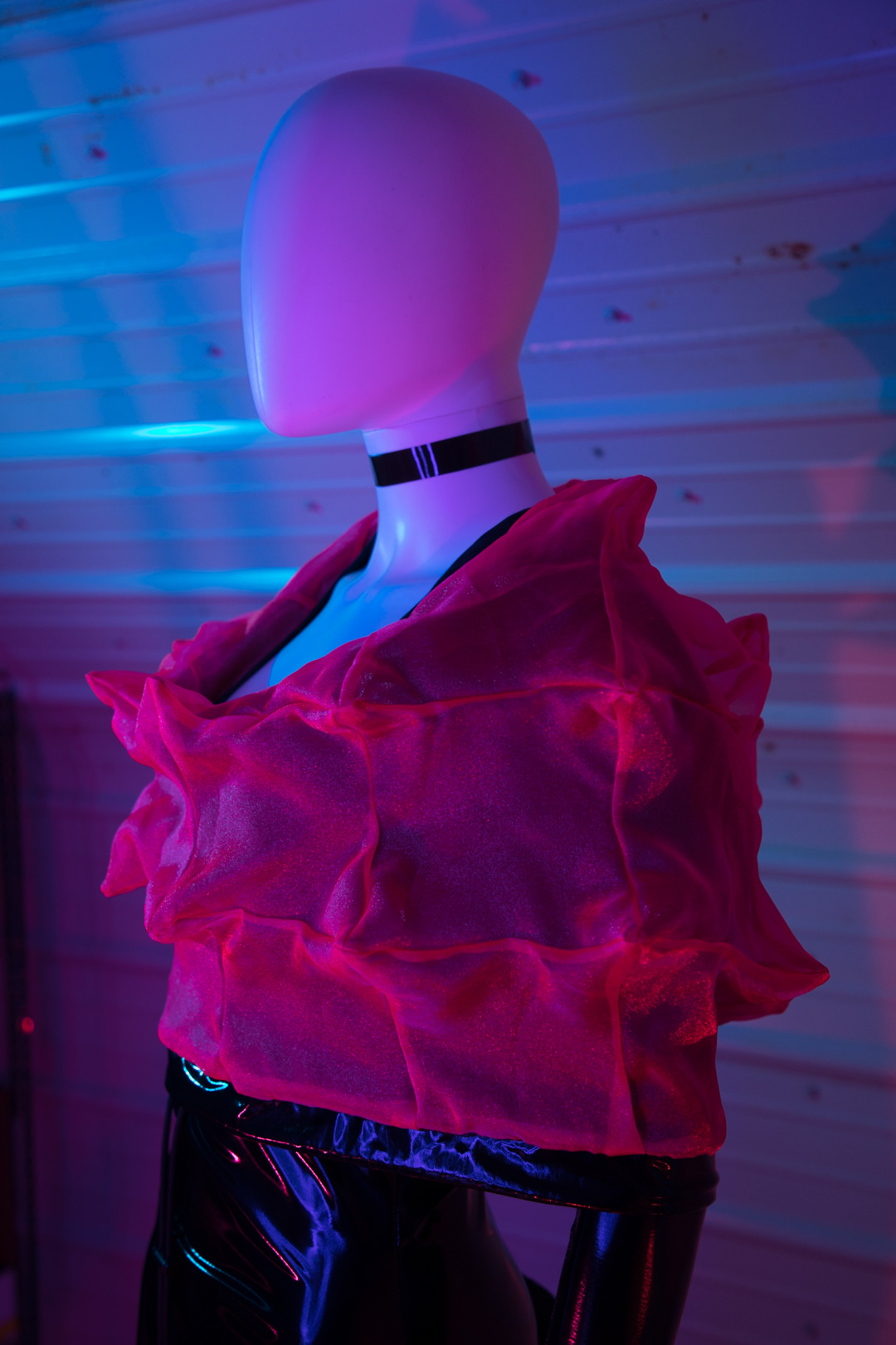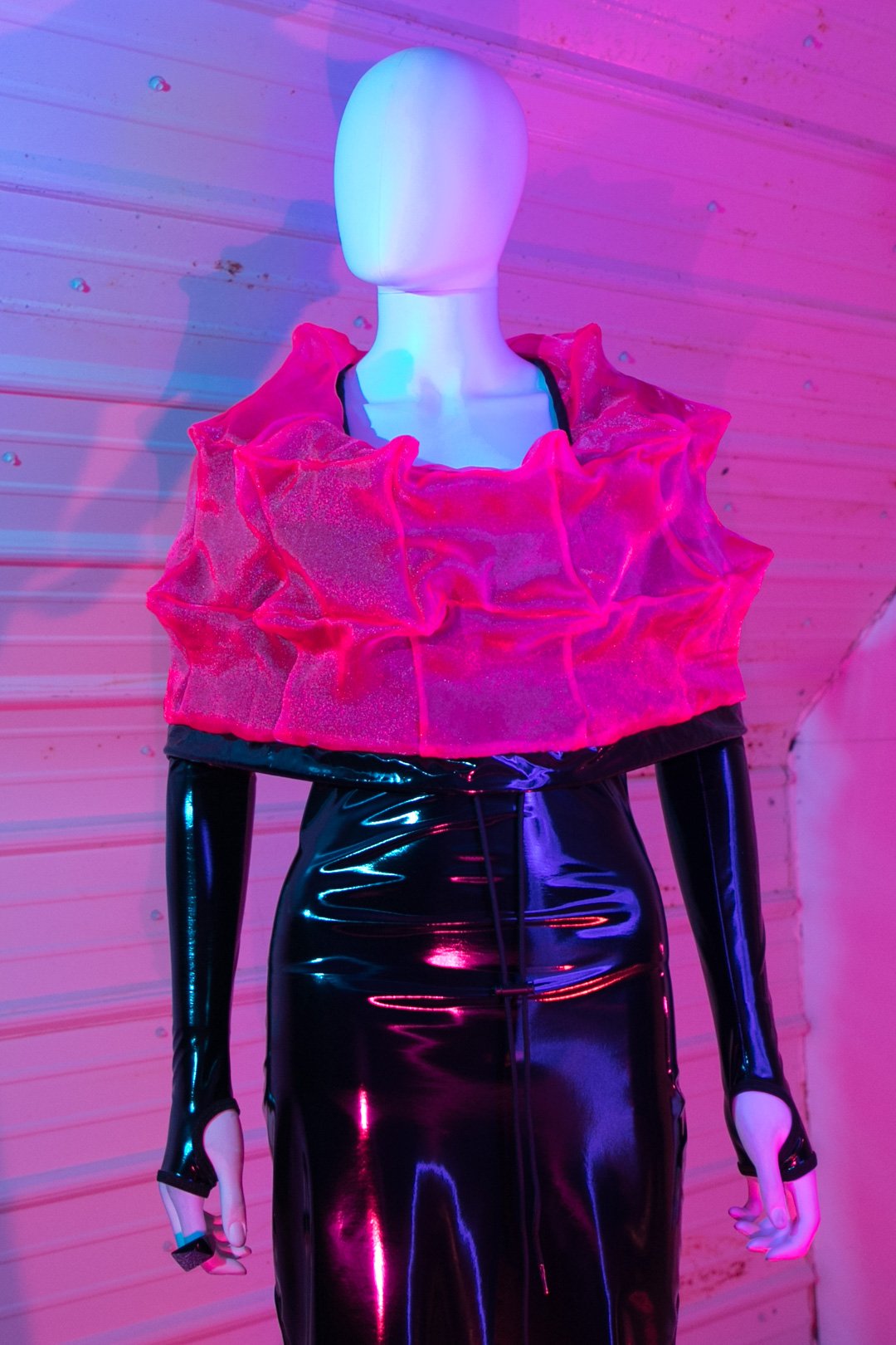 ONE OF A KIND maxi dress made from 4-way stretch PVC in shiny black with hidden, pop out spikey hood lining made from sheer, neon pink organza, each of the 41 panels are handcut, pinned, and sewn together from scratch. Black metal toggle and metal tips on nylon drawstring.