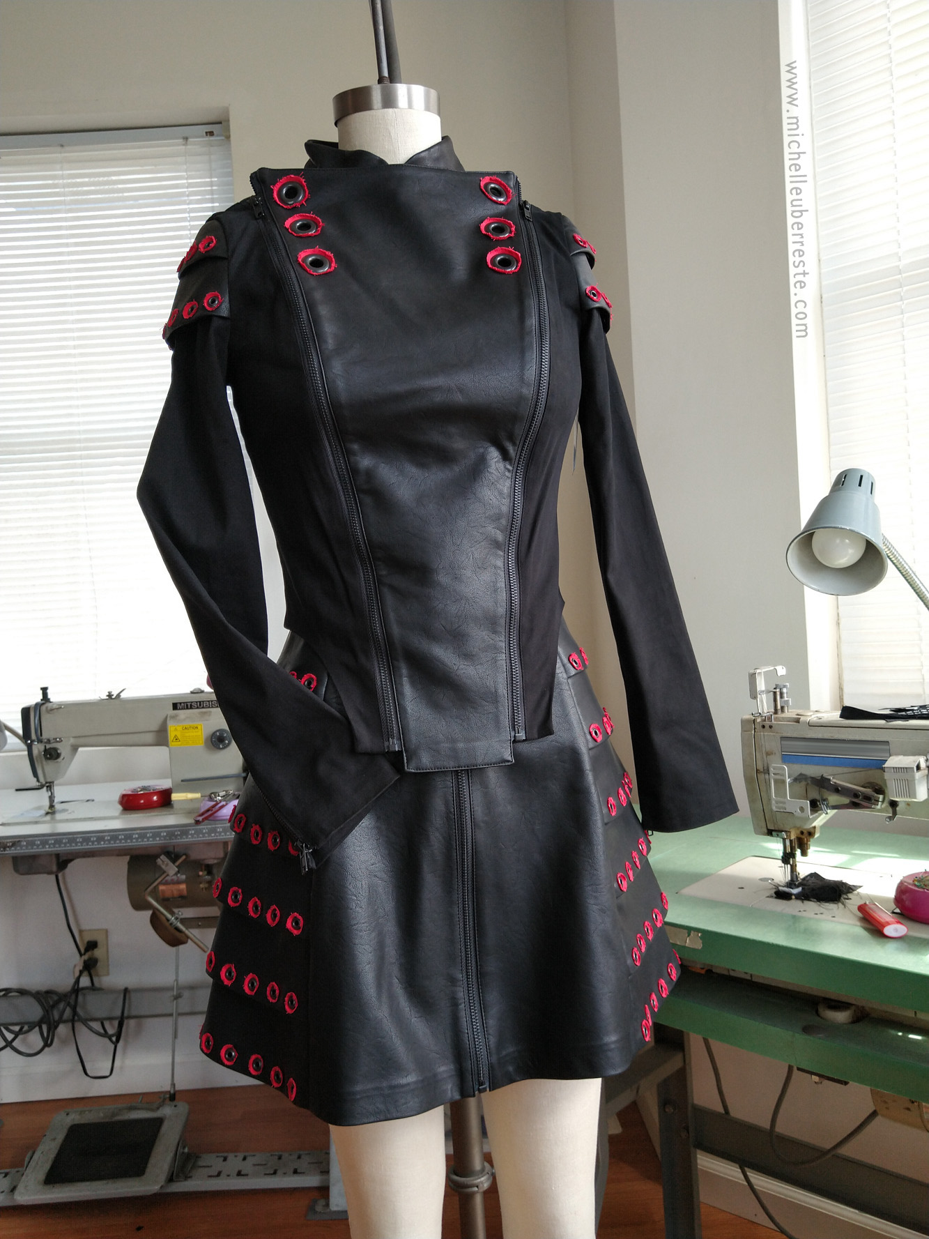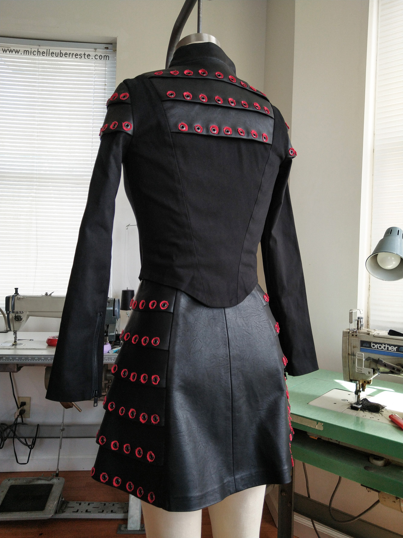 One of a kind stretch twill jacket with padded "armor" detail on the shoulders and back yoke, made from upholstery leatherette. 48 baby grommets, and 6 jumbo grommets are trimmed with crimson fabric spacers (hand-cut from leftover fabric we used for masks a few years ago). Edges frayed with a toothbrush. Convertible center front panel allows you to wear it open, closed, or completely removed! Fully lined with black gauze and finished with black metal zippers.
